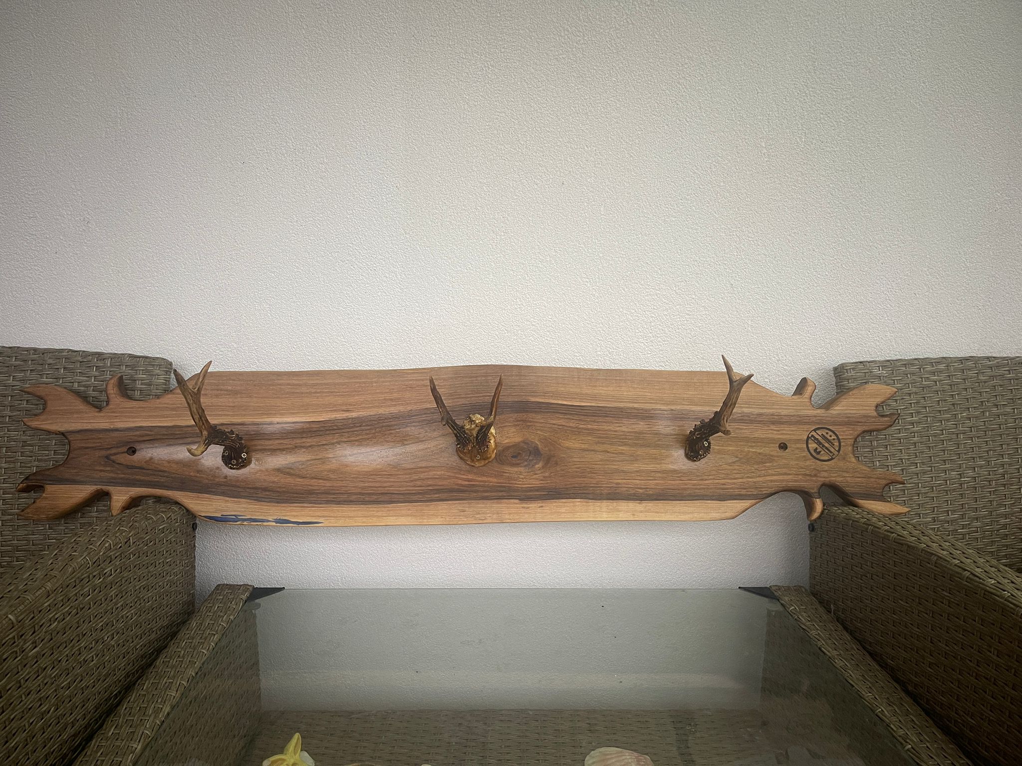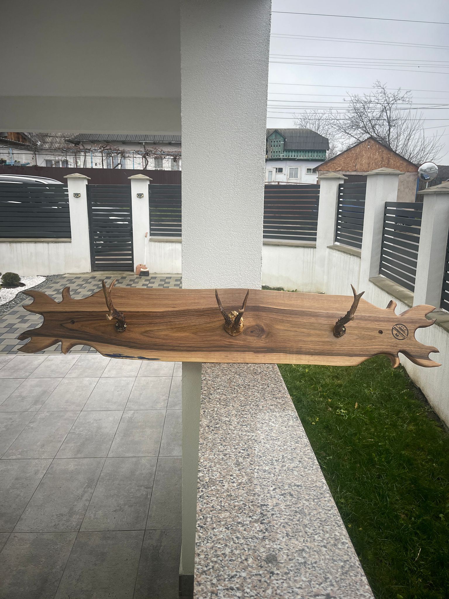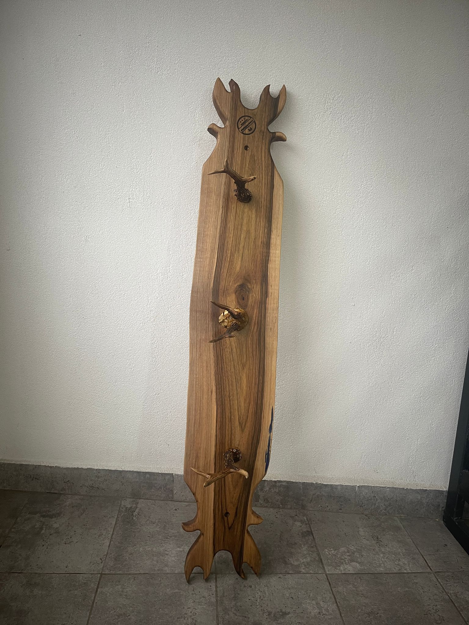 Acest cuier de perete este o piesă decorativă unică, lucrată manual din lemn de nuc masiv, atent finisat pentru a păstra textura și frumusețea naturală a lemnului. Fiecare cuier este dotat cu agățătoare realizate din coarne autentice de căprioară, integrate armonios pentru a crea o piesă rustică, elegantă și extrem de rezistentă.