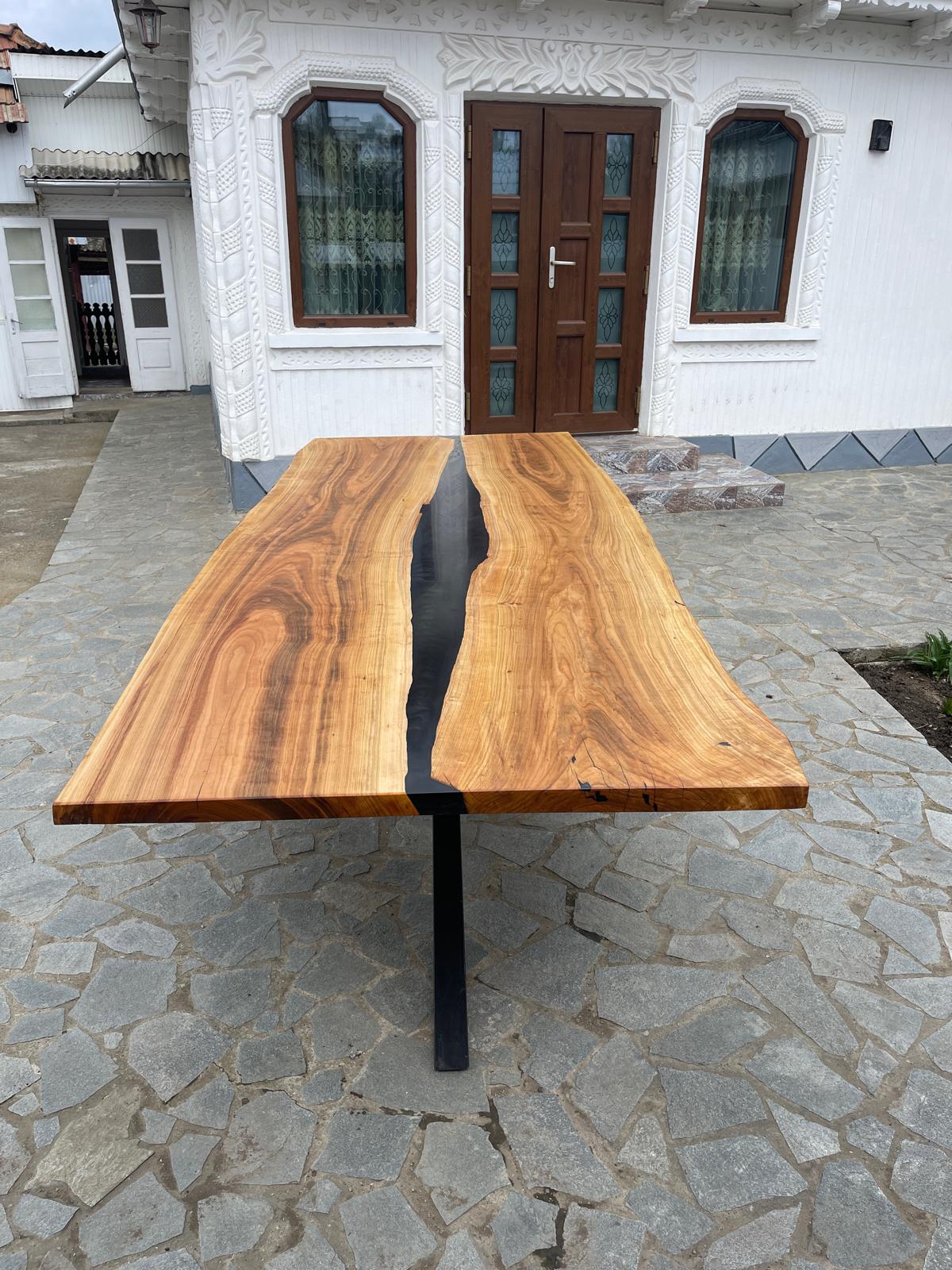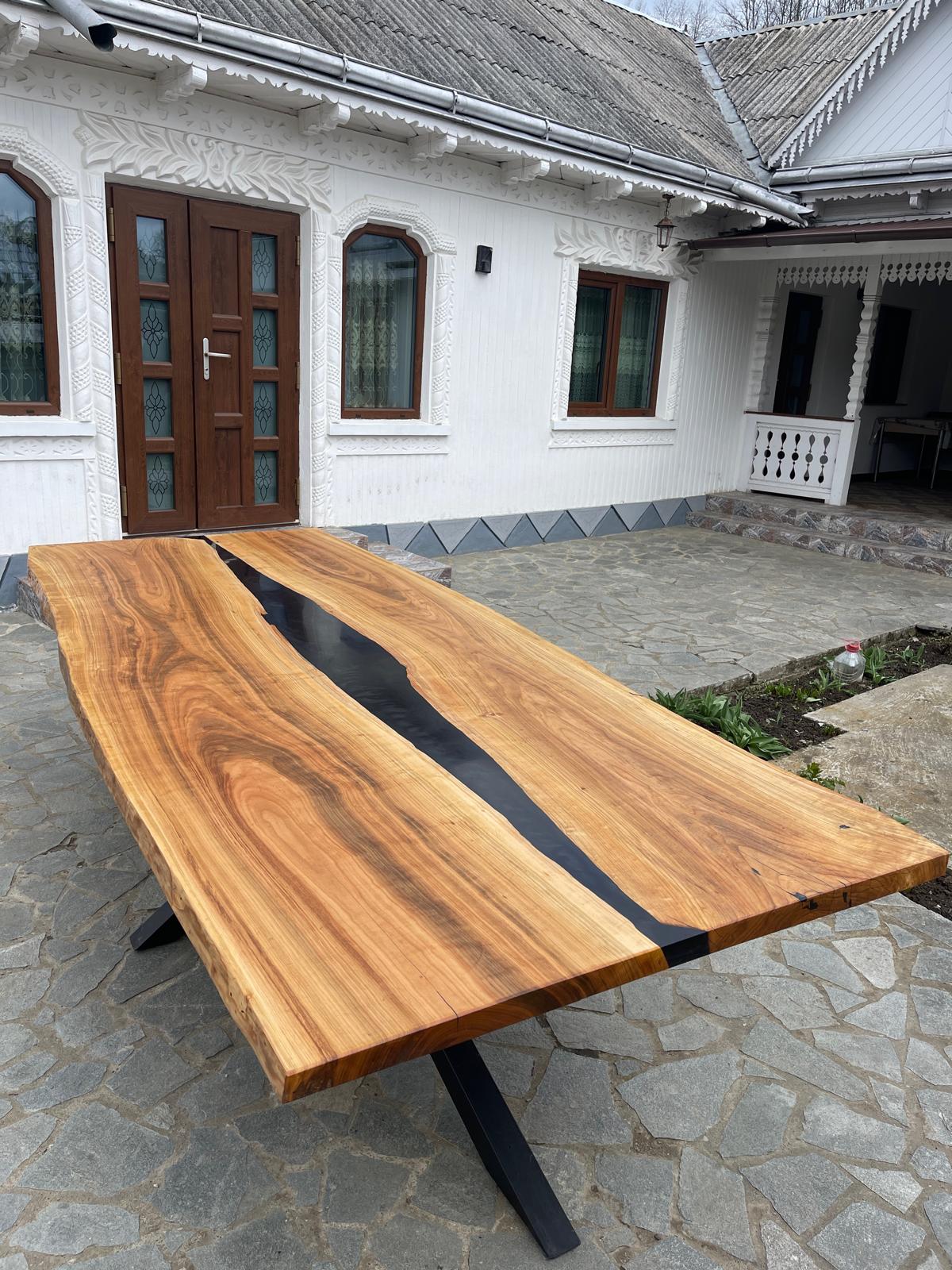 Masă de excepție realizată manual din lemn de cireș natural și rășină epoxidică neagră, cu un design elegant și modern.