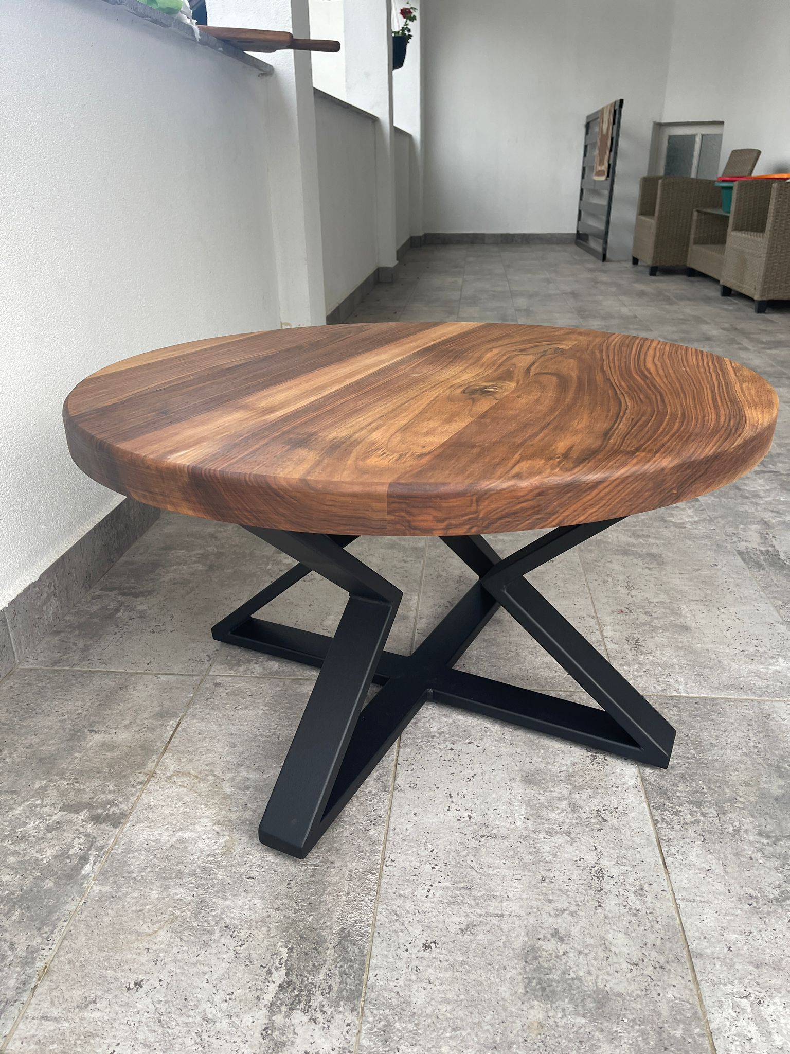 Designul rotund combină frumusețea naturală a lemnului de nuc cu stabilitatea și aspectul industrial al picioarelor metalice. Masa este handmade, finisată atent pentru a evidenția textura și culoarea naturală a lemnului.