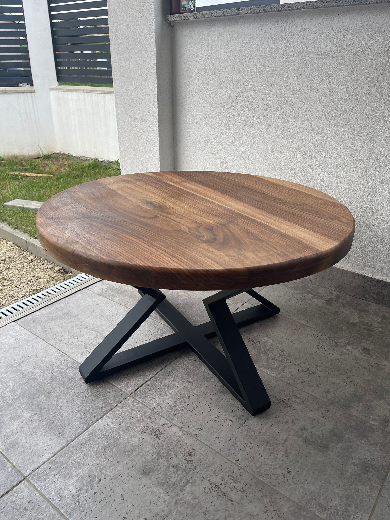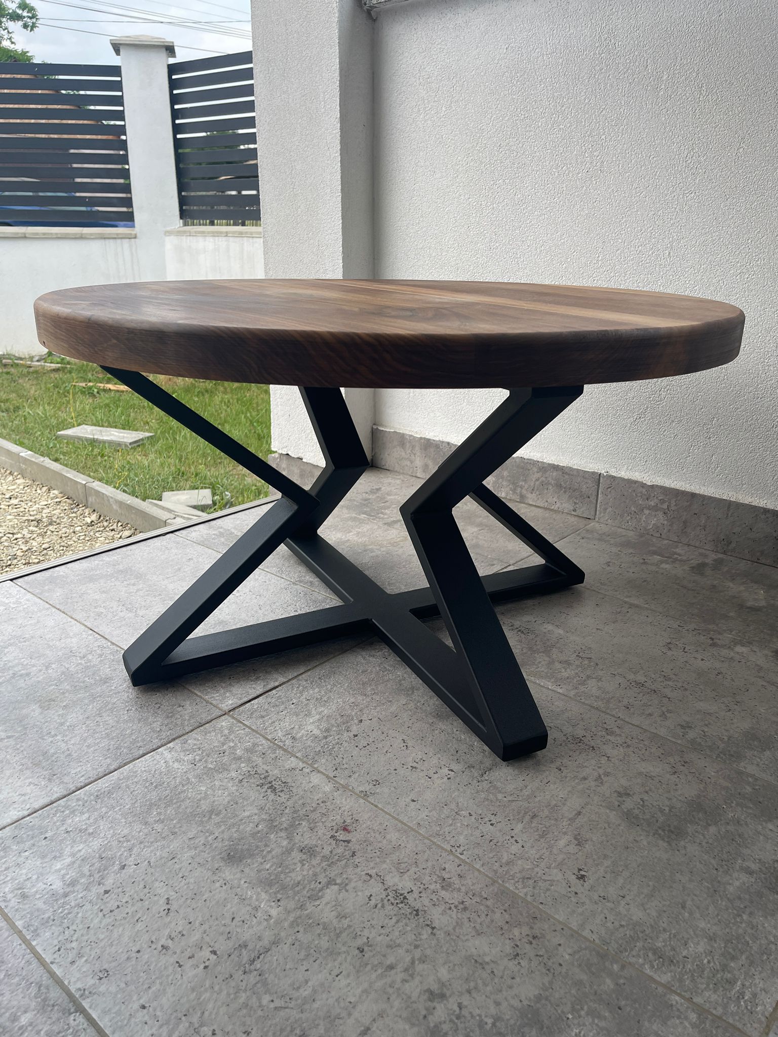 Masă rotundă de cafea realizată din lemn masiv de nuc, cu picioare metalice vopsite electrostatic, perfectă pentru livinguri moderne și spații elegante.