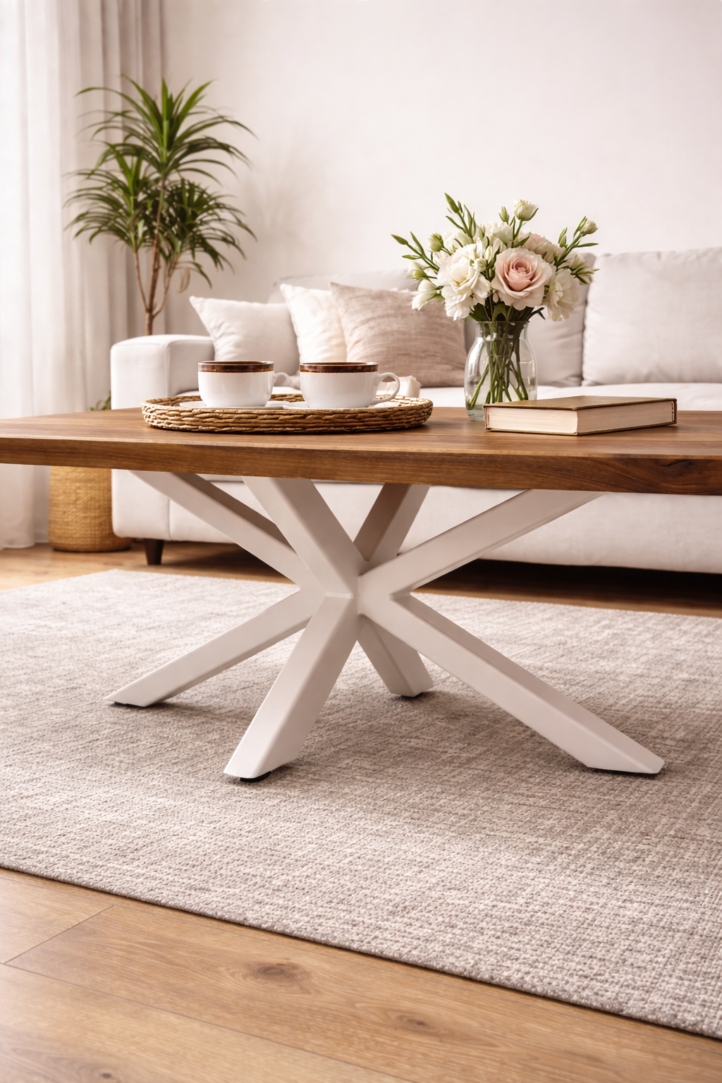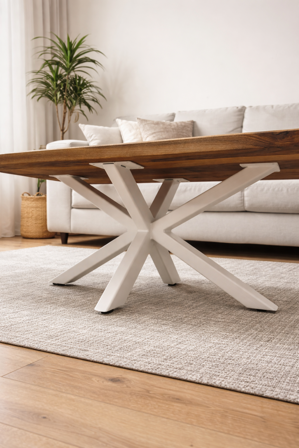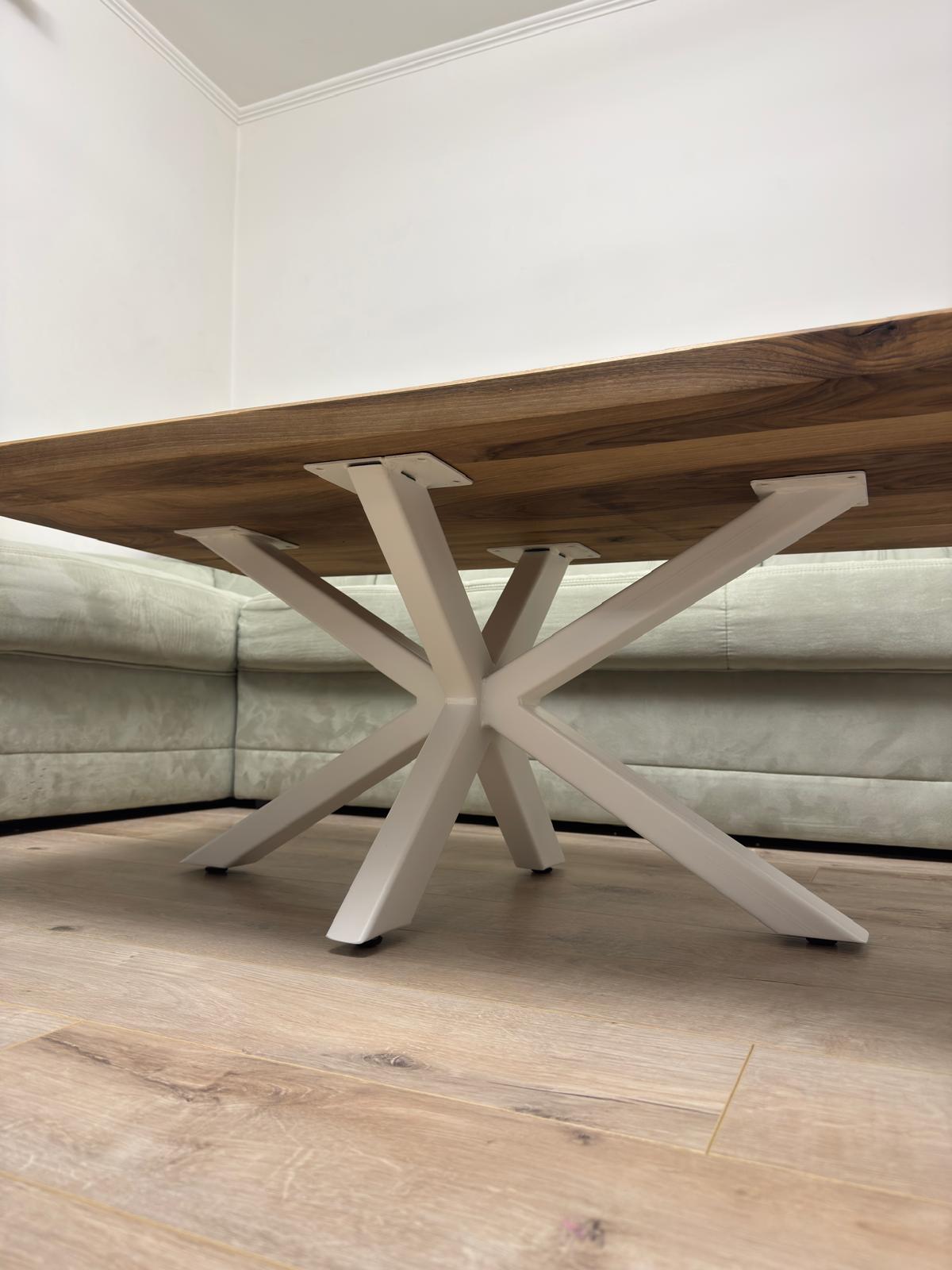Un element definitoriu al mesei îl reprezintă picioarele metalice tip Spider, vopsite electrostatic în alb. Acestea oferă nu doar un aspect modern și elegant, ci și o stabilitate excelentă. Forma lor geometrică creează un contrast estetic între natural și contemporan, între rustic și modern, făcând masa potrivită pentru multiple stiluri de amenajare: modern, industrial, scandinav sau minimalist.