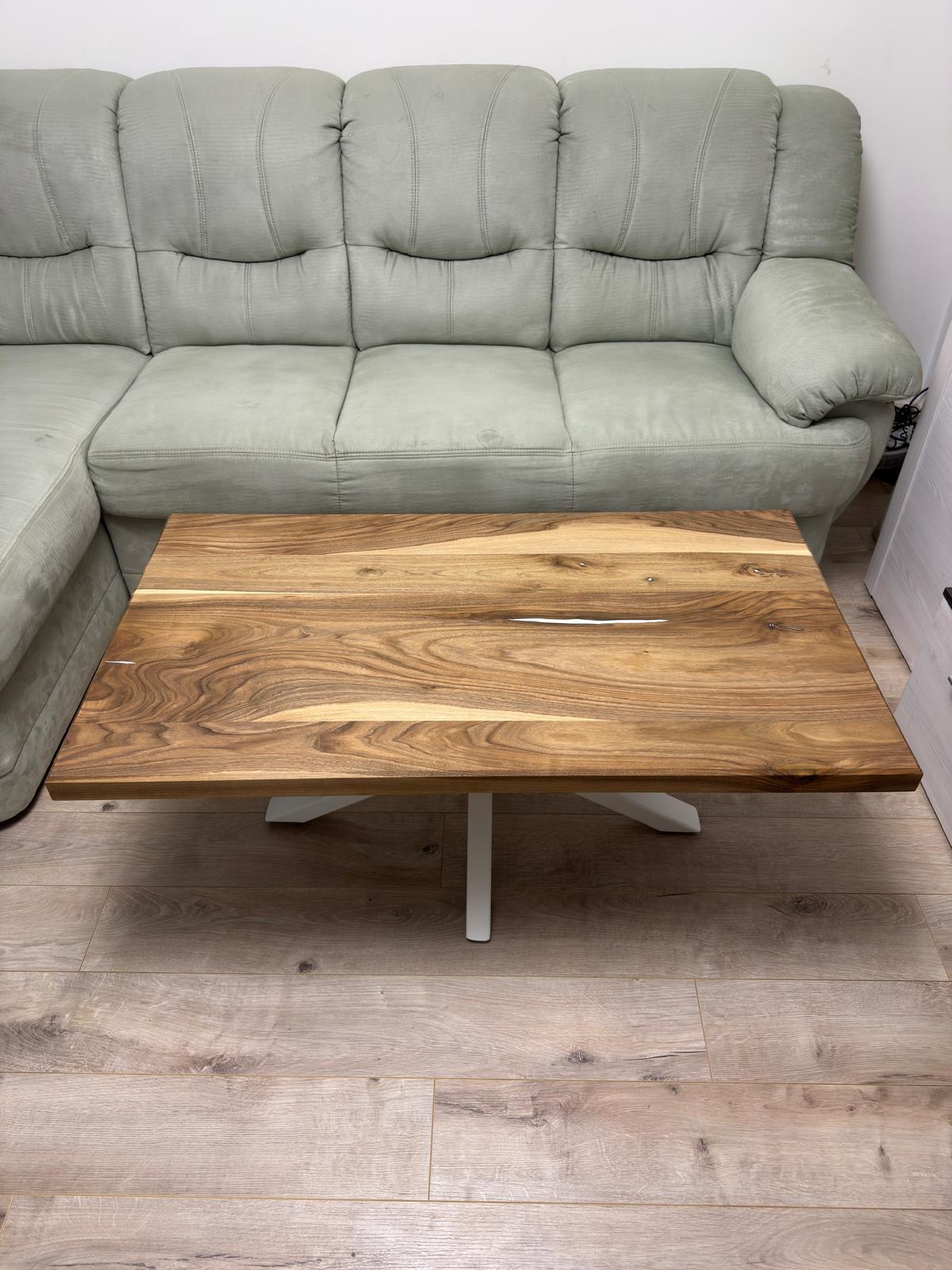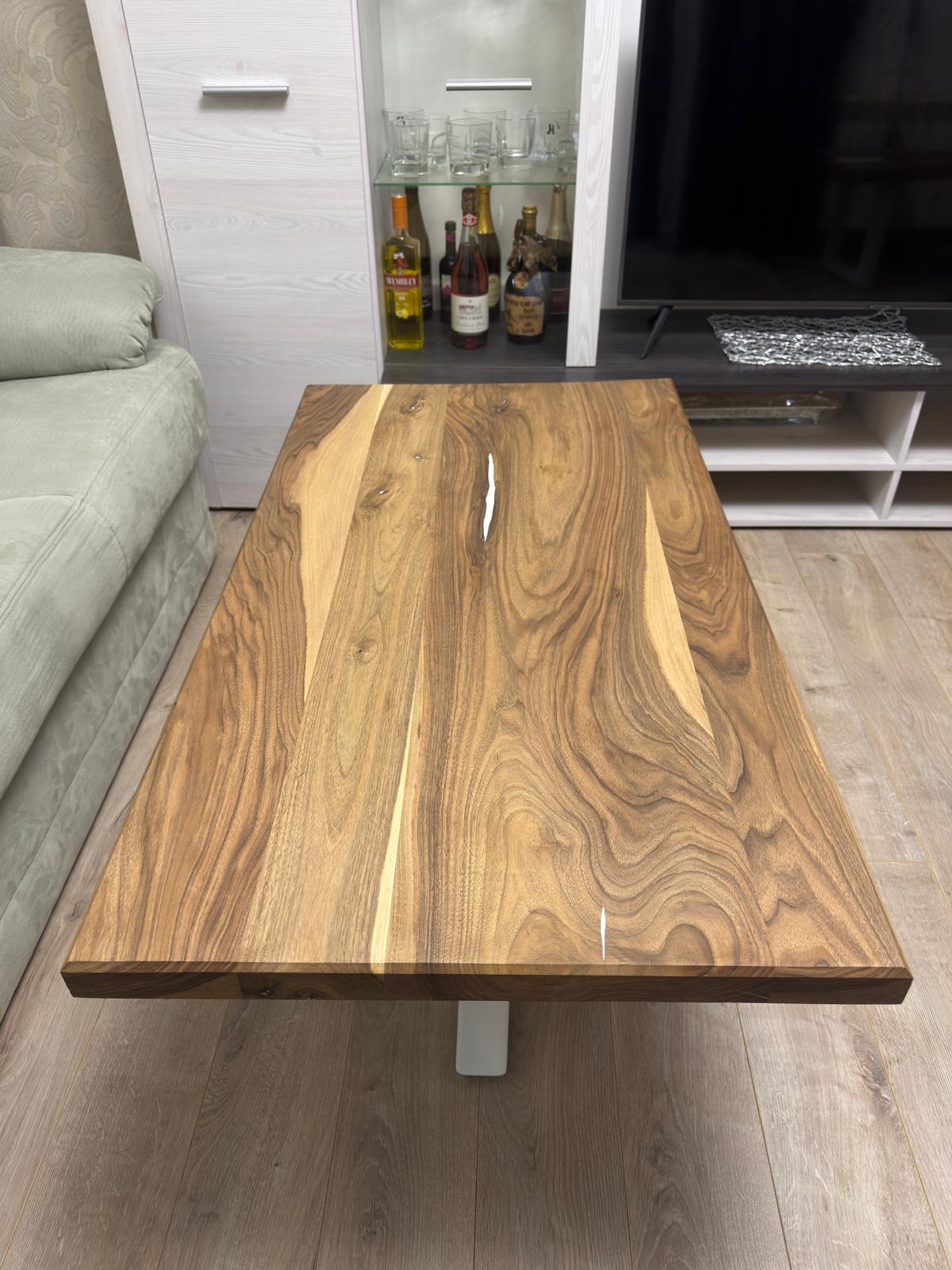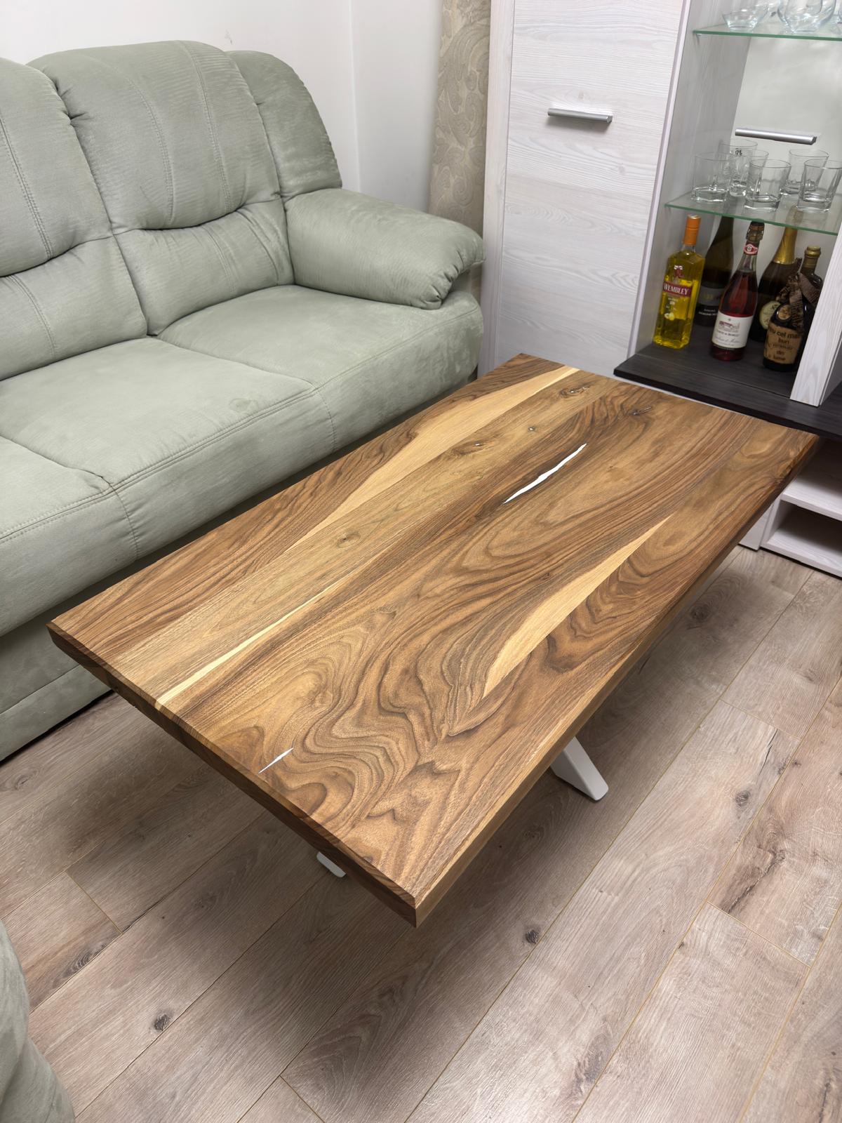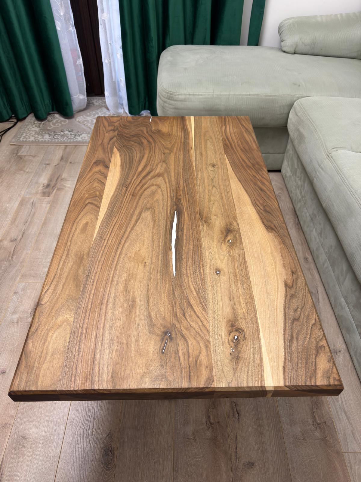 Blatul este realizat din nuc masiv atent selecționat, păstrând forma naturală a lemnului și evidențiind fibra spectaculoasă specifică acestui material nobil. Rășina epoxidică albă completează armonios desenul natural al lemnului, oferind un contrast vizual deosebit și o suprafață netedă, plăcută la atingere și foarte rezistentă în timp.