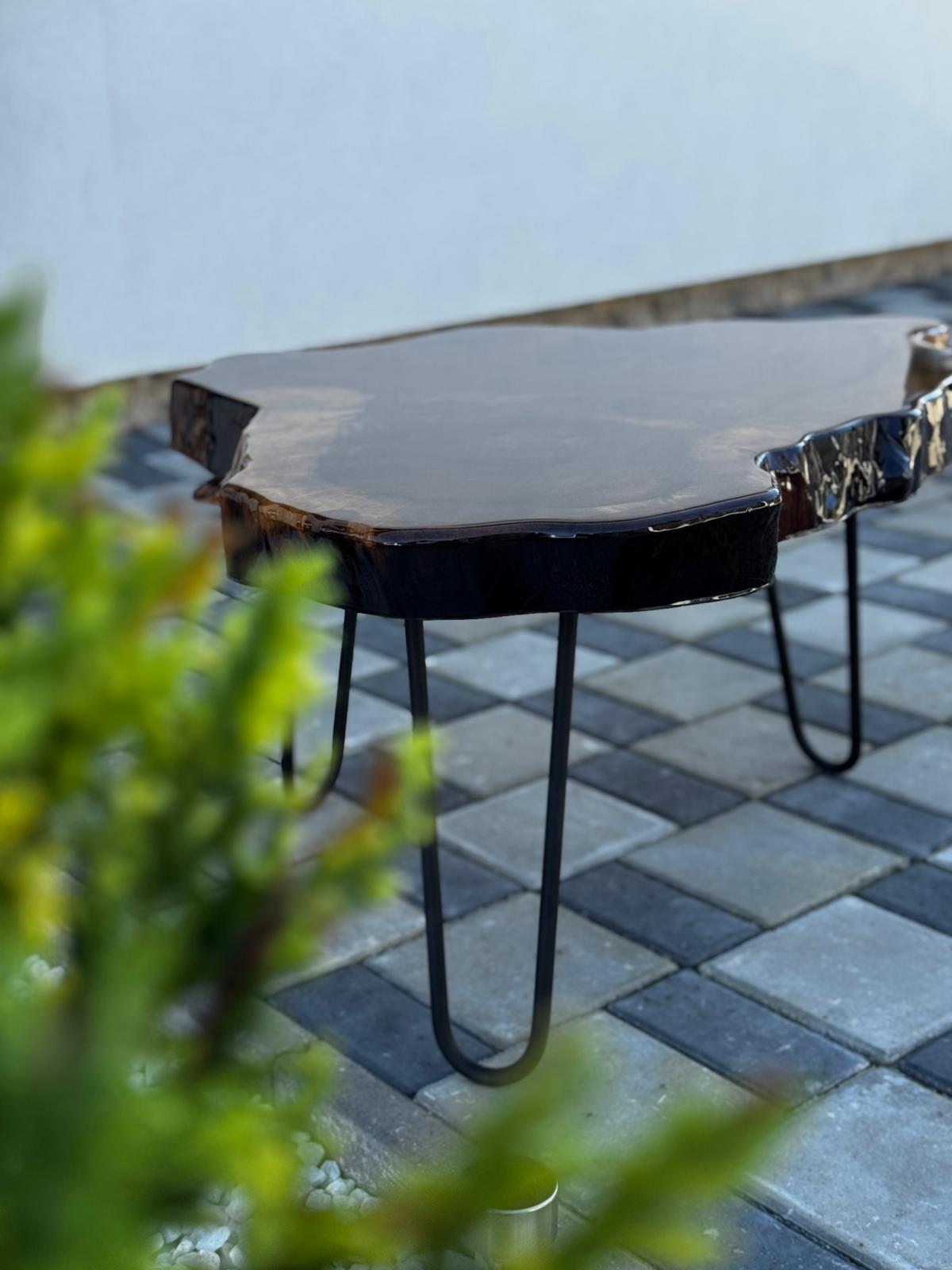 Masă de cafea realizată manual din lemn masiv de nuc, cu blat gros de 8 cm și rășină epoxidică transparentă. Picioare metalice vopsite electrostatic, foarte rezistente. Design unic, ideal pentru living modern sau rustic.