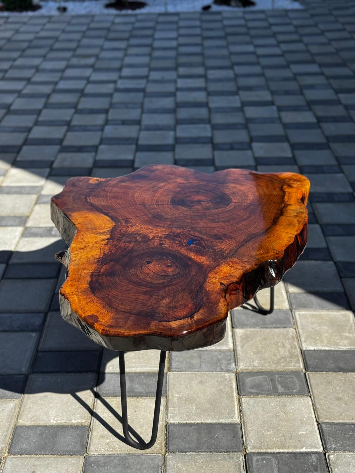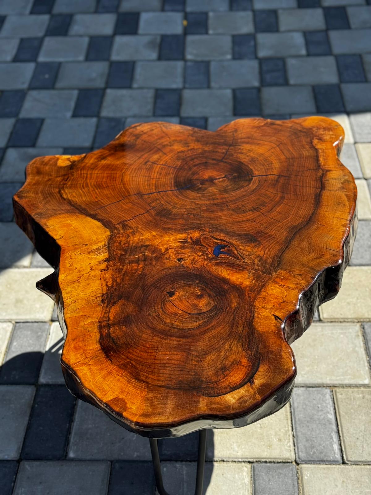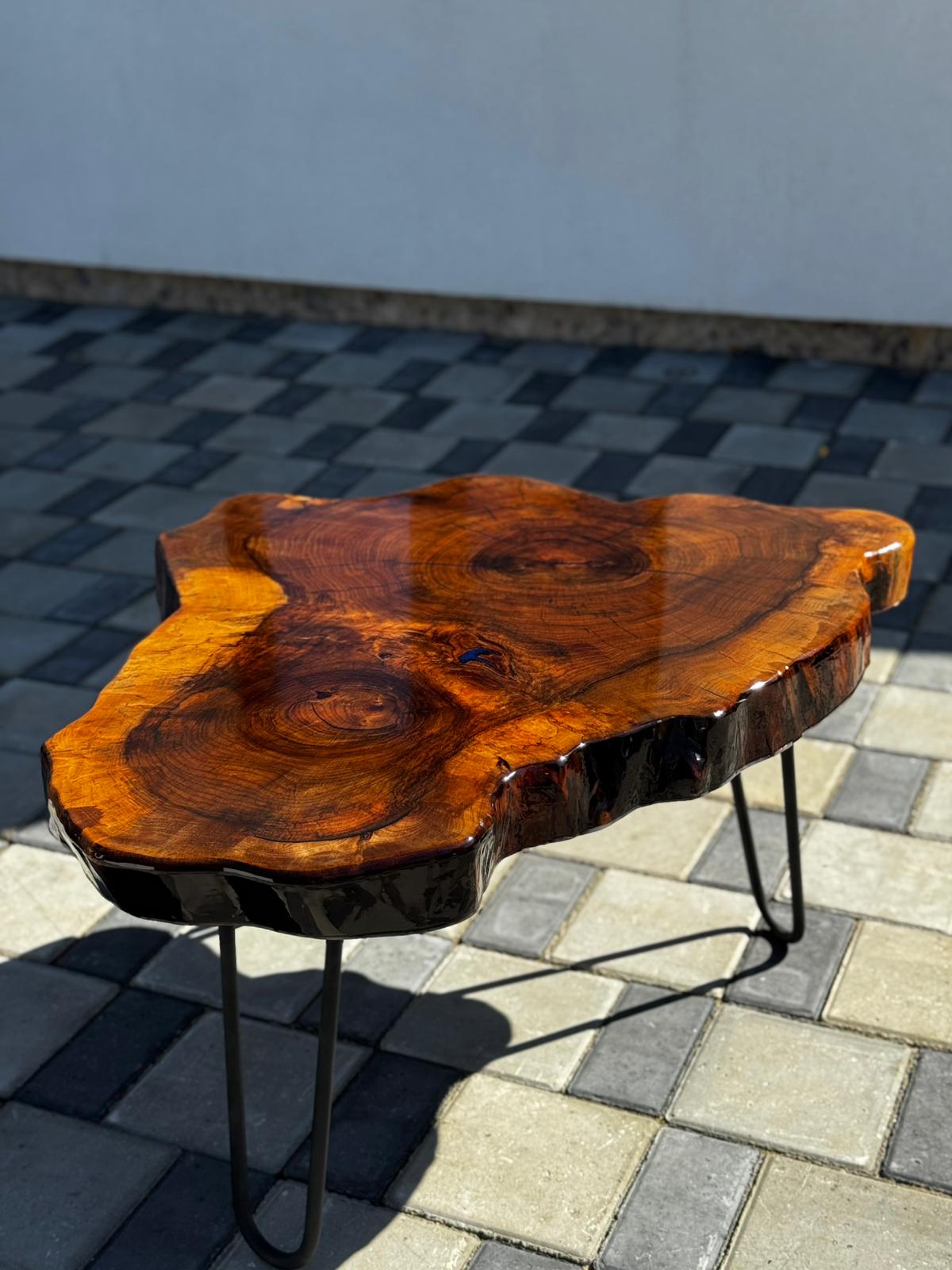 Blat 8 cm lemn de nuc + rășină epoxidică. Picioare metalice rezistente. Design unic.