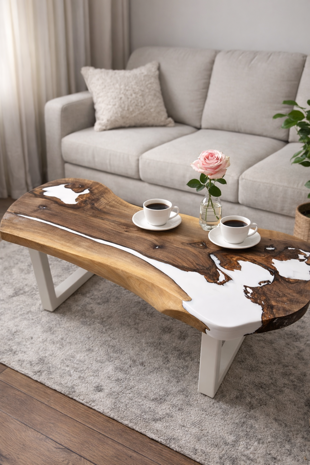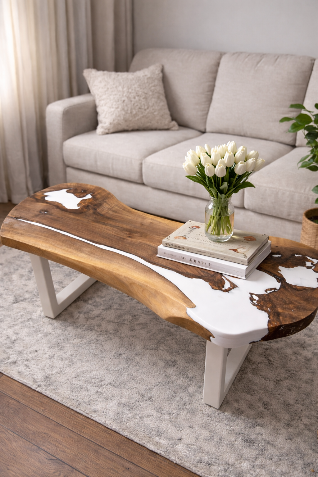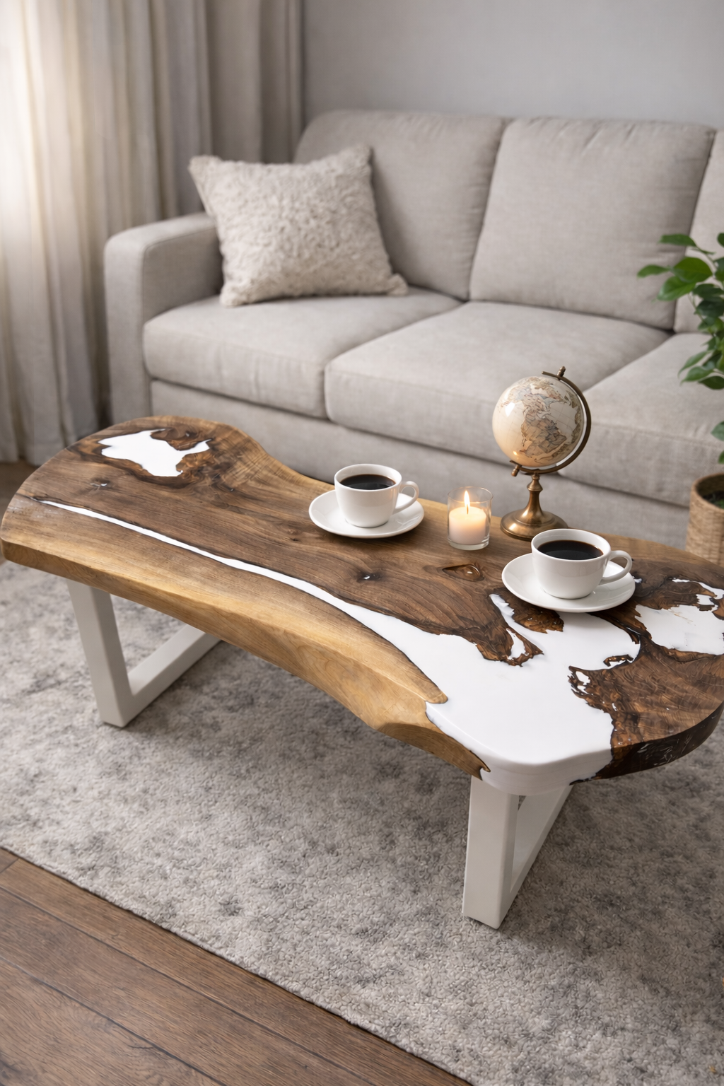 Alege această masă de cafea din nuc și rășină albă dacă îți dorești un produs premium, autentic și spectaculos, care să impresioneze prin naturalețe, eleganță și calitate.