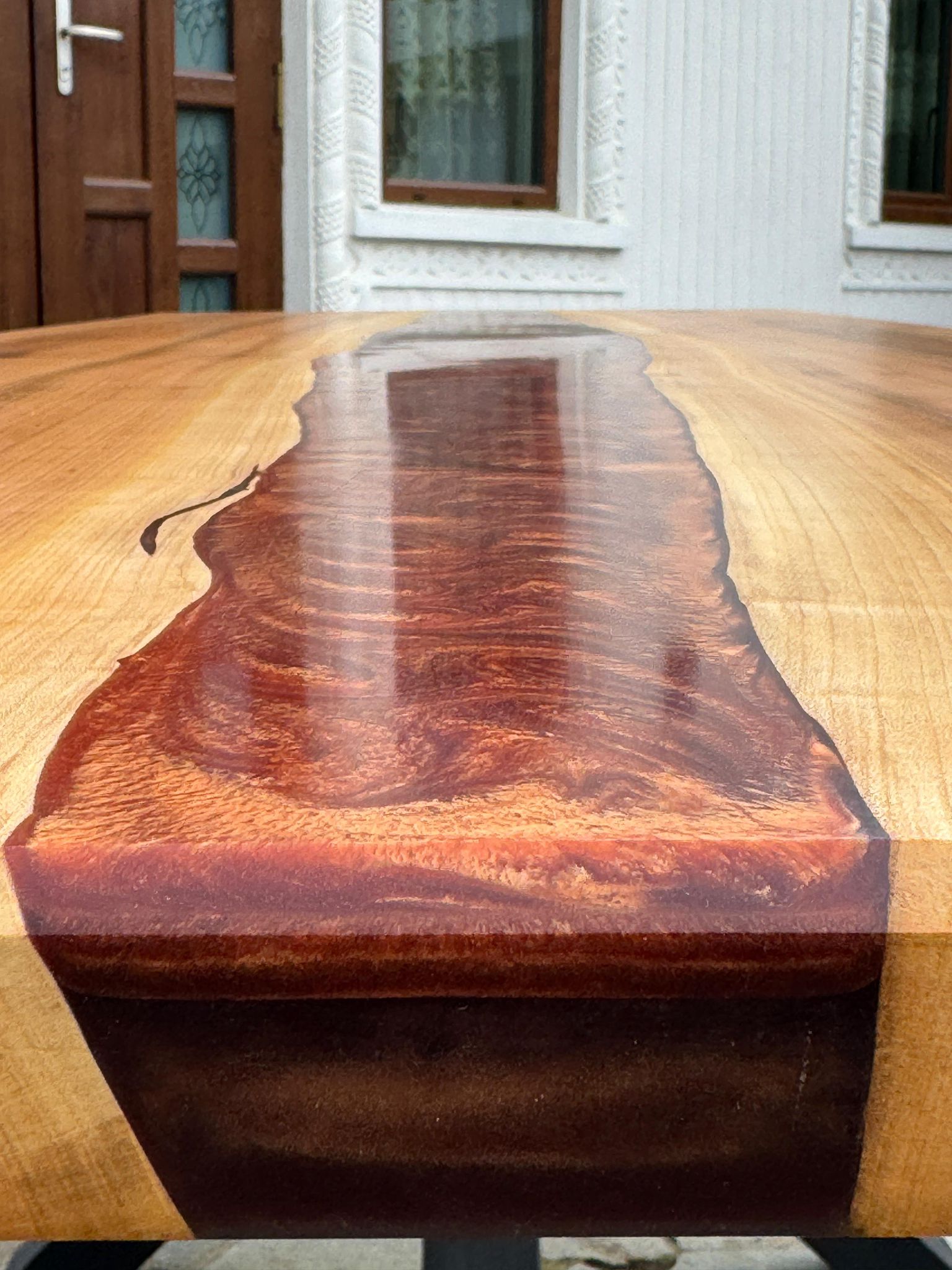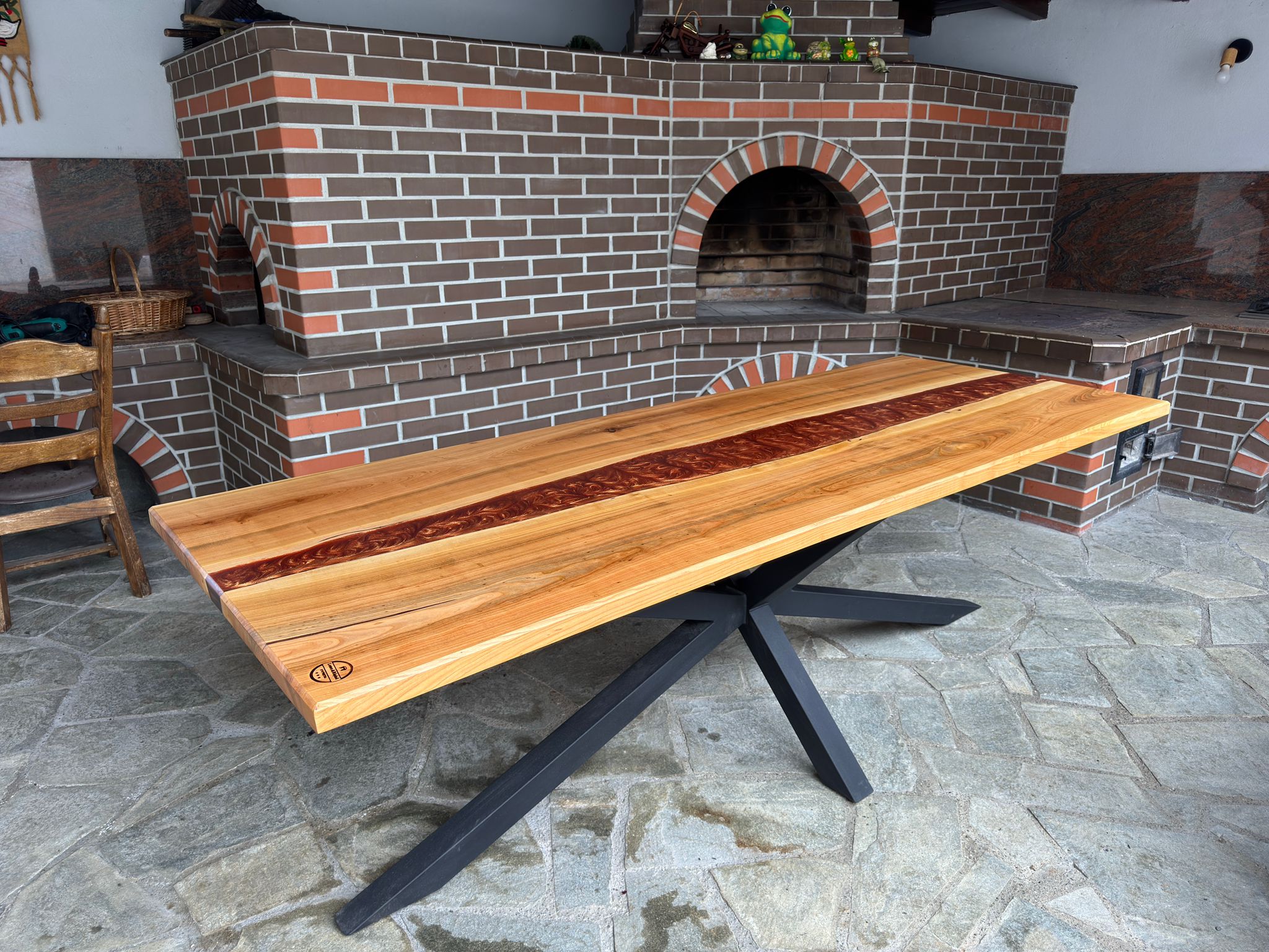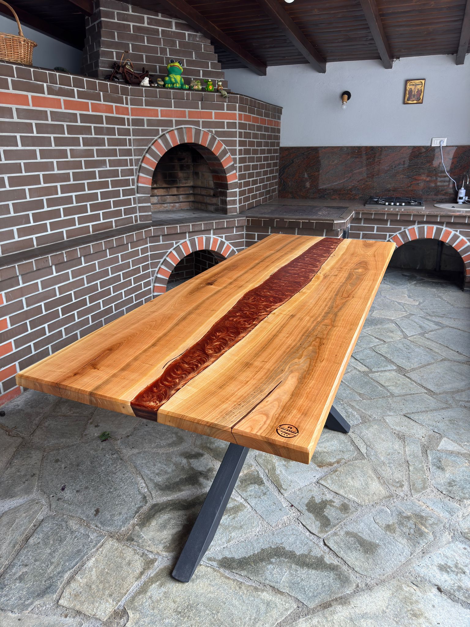 Masă artizanală din lemn de cireș cu rășină epoxidică și picioare tip spider, perfectă pentru dininguri moderne, birouri sau spații elegante.