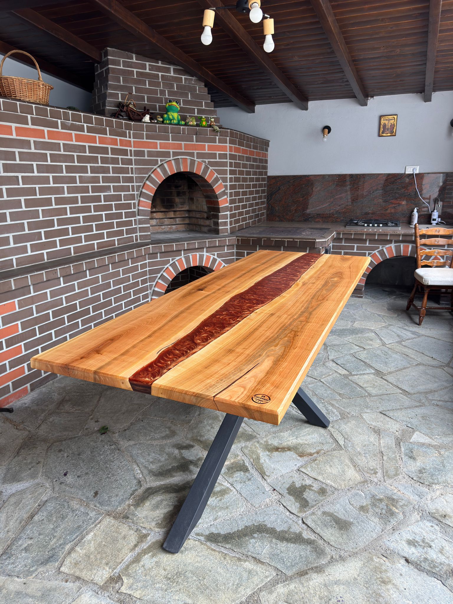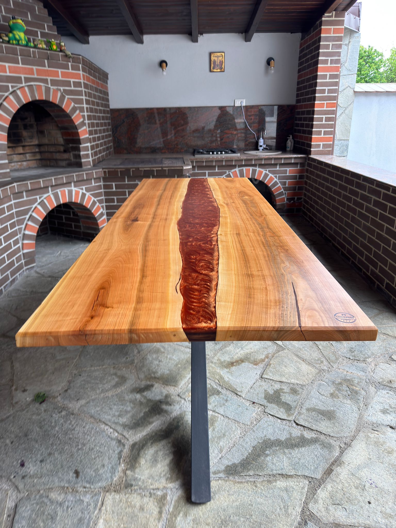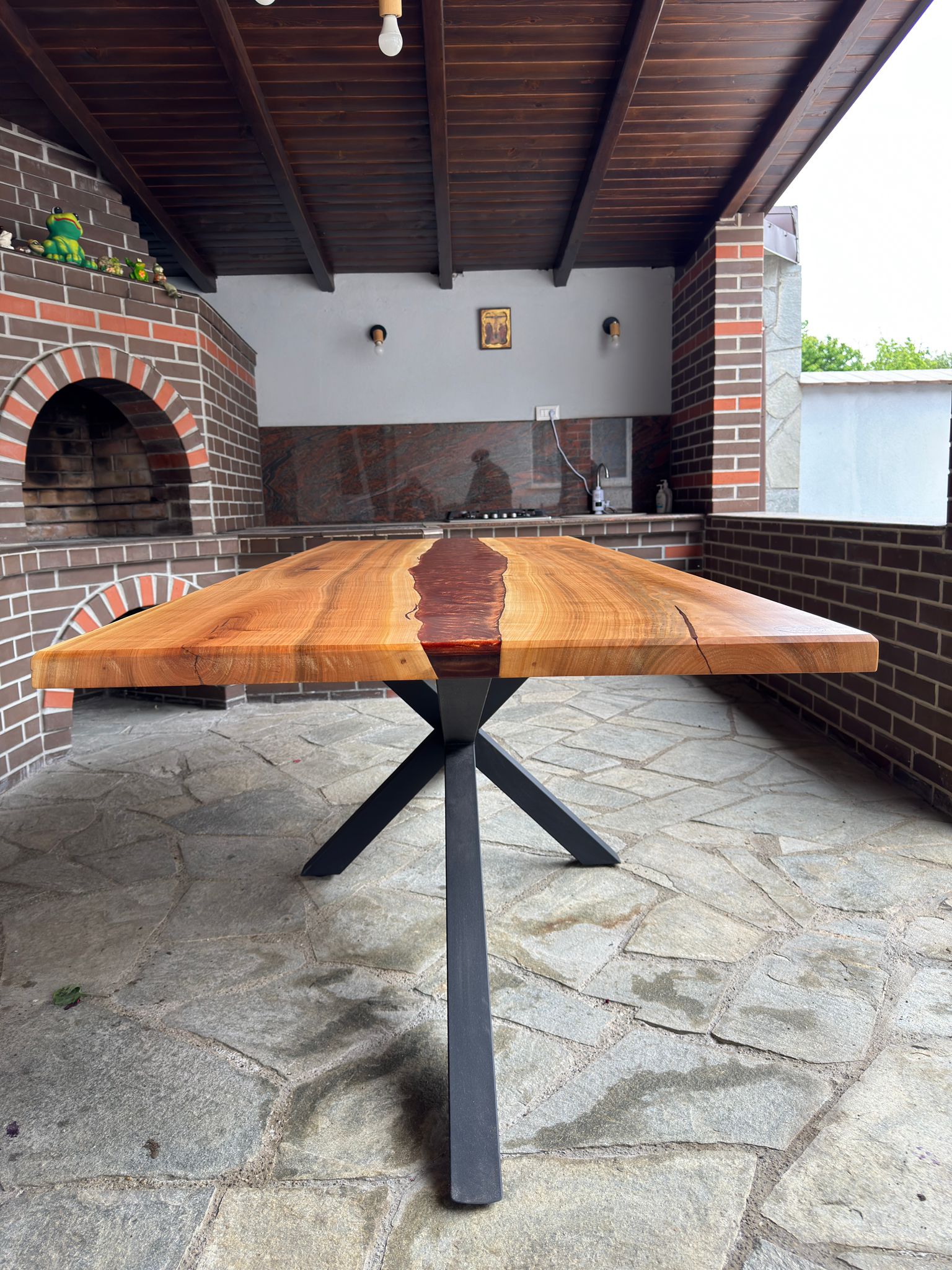 Fiecare masă este realizată manual, combinând frumusețea naturală a lemnului de cireș cu efectul elegant al rășinii epoxidice. Picioarele tip spider oferă stabilitate și un design industrial-modern, iar dimensiunile mari (2500×1000 mm) fac masa ideală pentru reuniuni de familie sau întâlniri de afaceri.