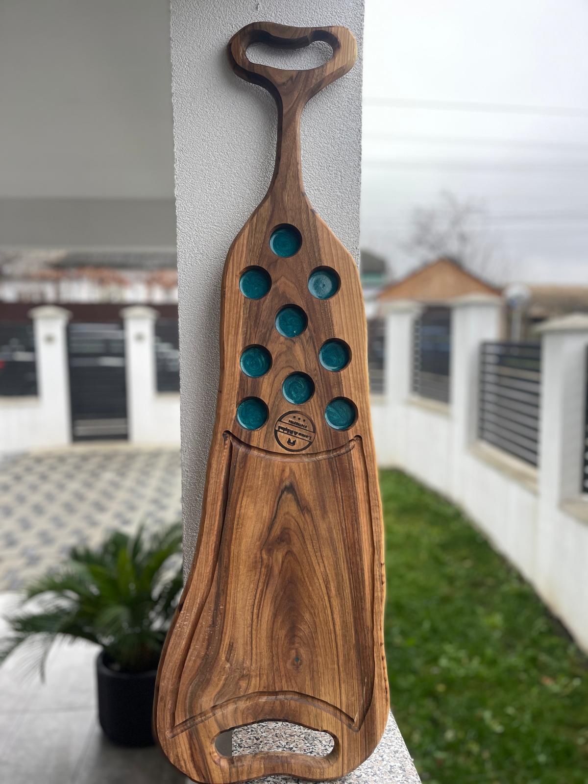 Imaginat și realizat manual în atelierele noastre, acest platou combină frumuseţea naturală a lemnului de nuc cu strălucirea modernă a răşinii epoxidice turcoaz. Fiecare fibră a lemnului şi fiecare curbură a răşinii fac acest produs cu adevărat unic. Finisajul cu ulei alimentar certificat pentru contact direct cu alimentele vă garantează siguranţă şi durabilitate. Folosiţi-l pentru brânzeturi fine, fructe, aperitive sau ca element central la masa de familie — sau oferiţi-l cadou cuiva drag, pasionat de design natural şi artizanat. Întreținere simplă: curăţare manuală, fără maşină de spălat vase, pentru a păstra textura şi frumuseţea lemnului.