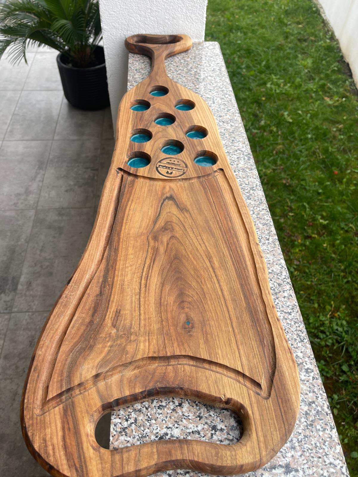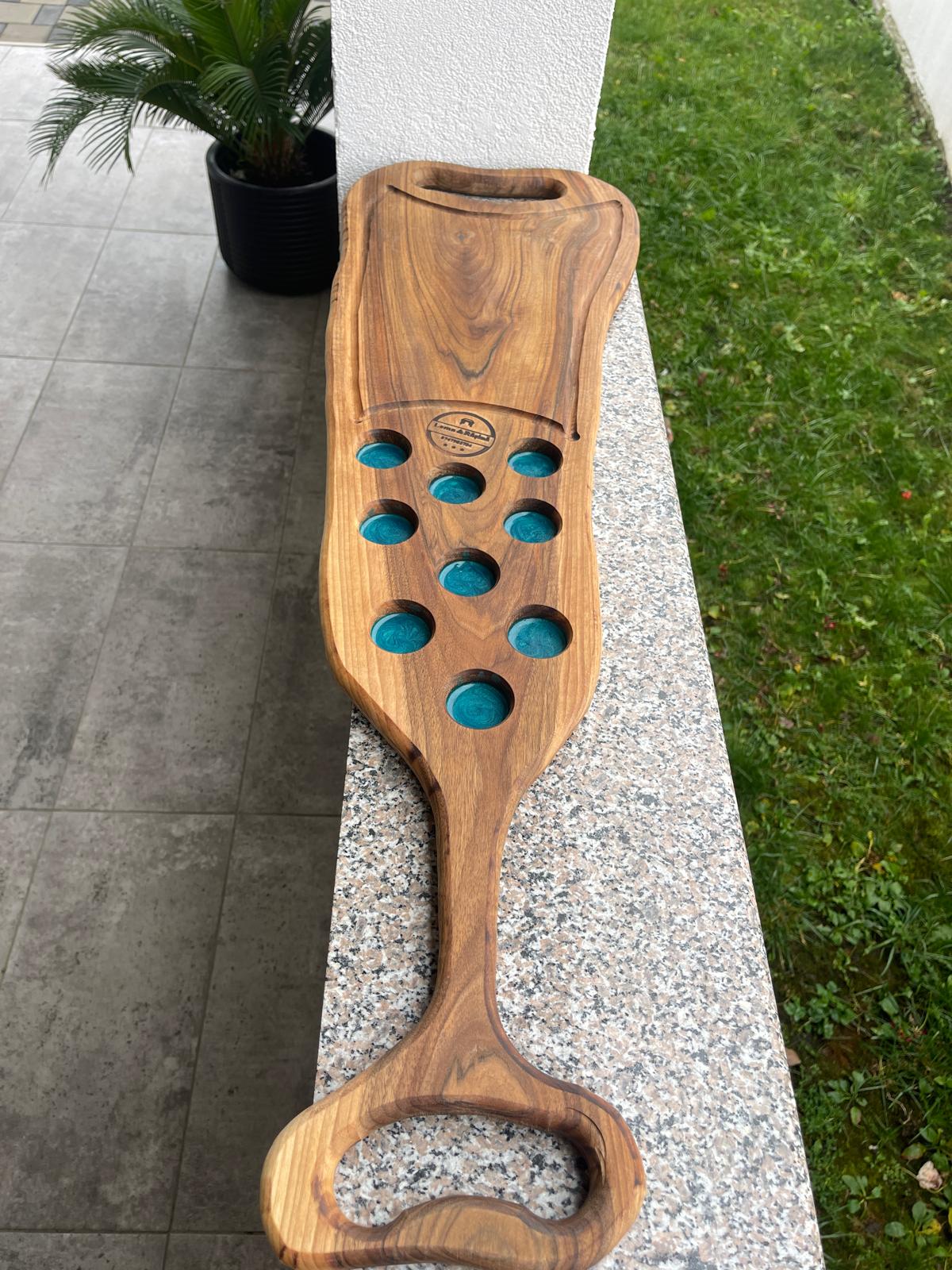Un platou unic din lemn de nuc masiv cu inserţii de răşină epoxidică turcoaz, finisat cu ulei alimentar. Perfect pentru servire elegantă, prezentare gourmet sau cadou sofisticat.