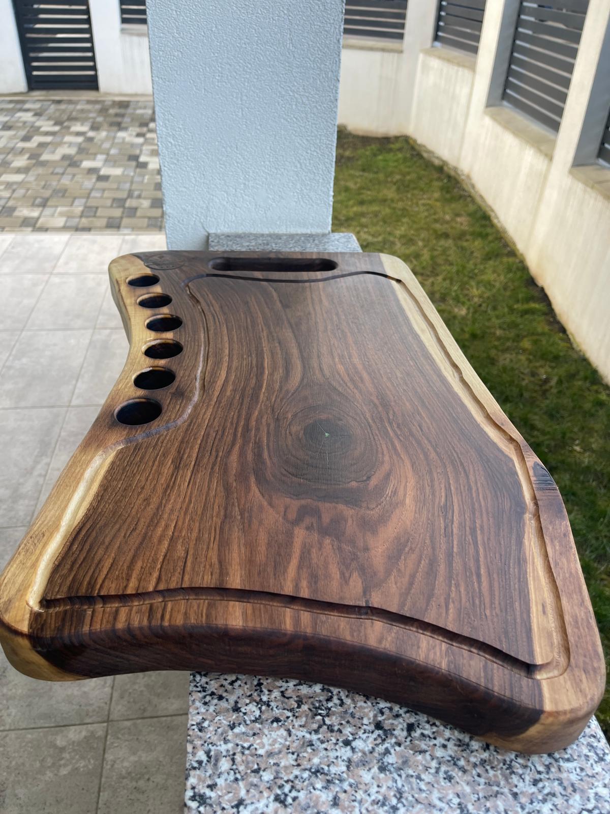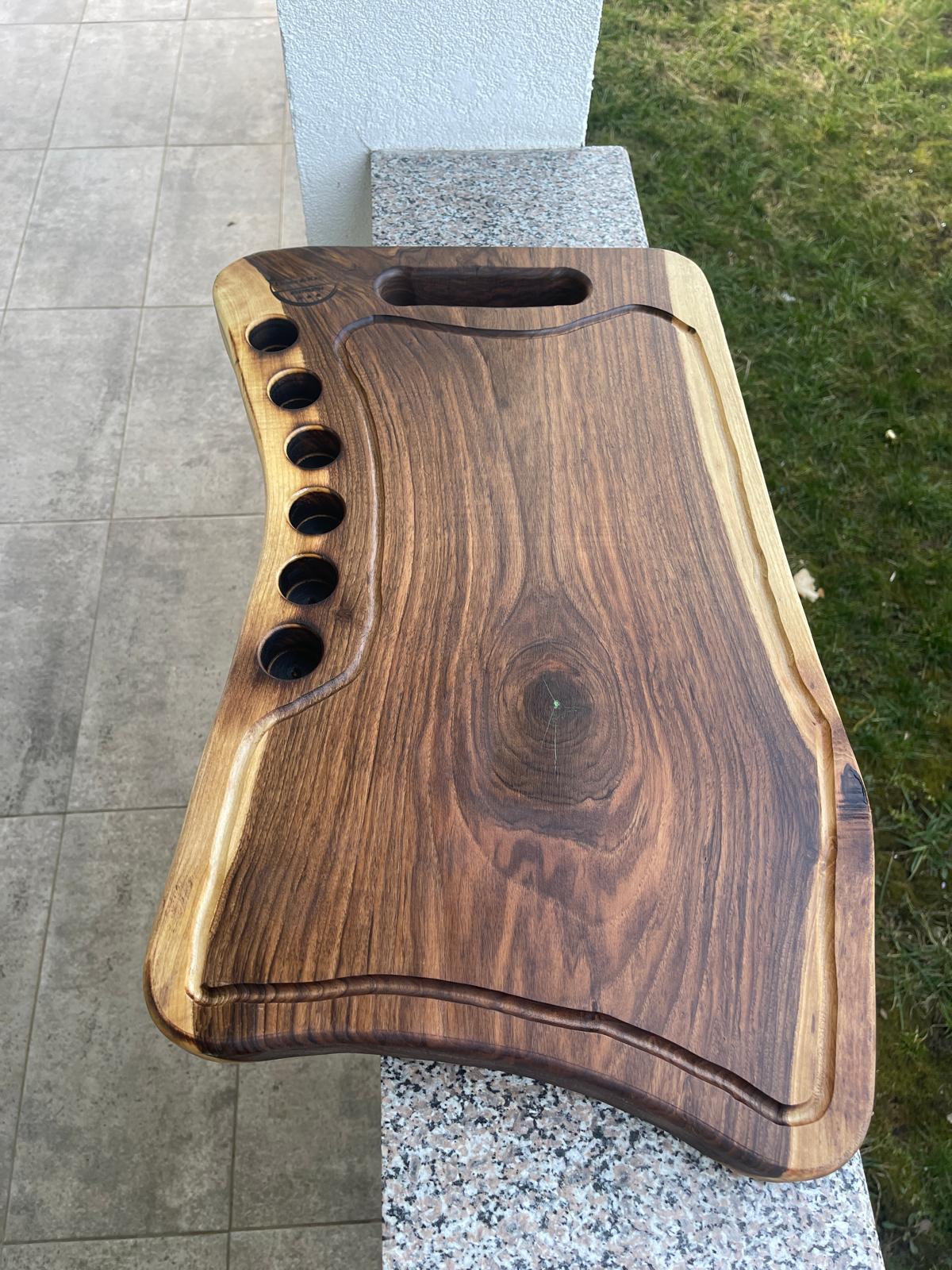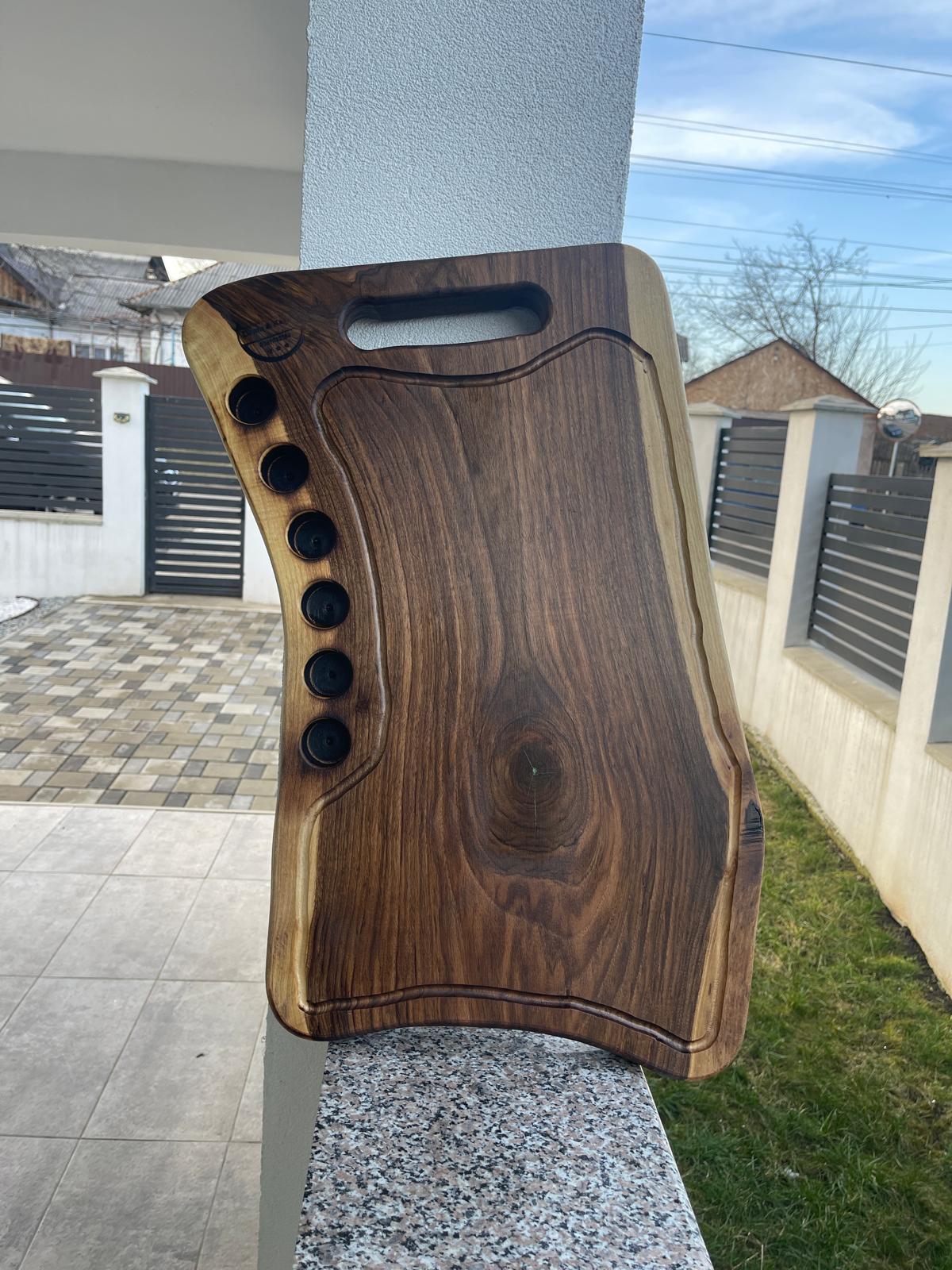 Platou unicat din lemn masiv de nuc, cu inserții de rășină epoxidică verde, 6 găuri pentru shot-uri și canal de scurgere pentru lichide. Dimensiuni 60x37x4 cm. Design autentic și modern.