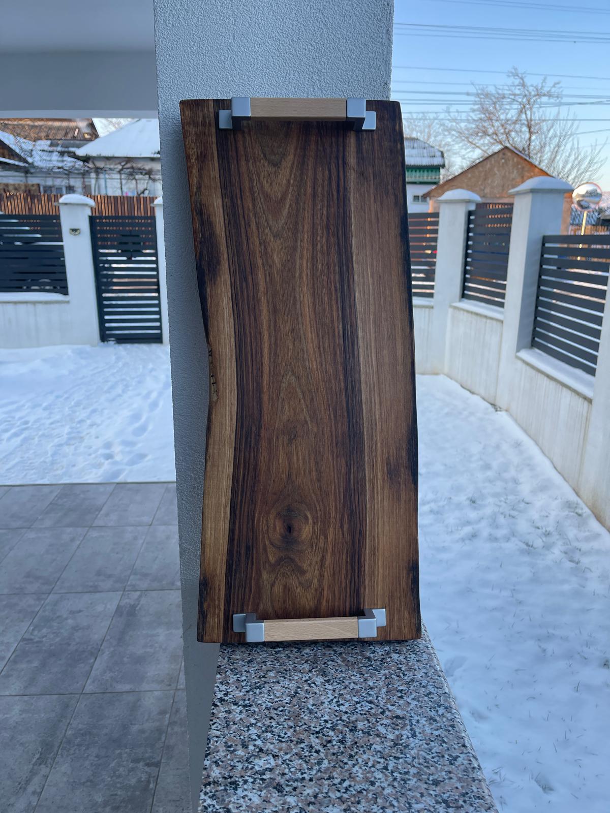 Cu dimensiuni de 60 × 23 cm și o grosime de 3,5 cm, platoul oferă stabilitate și o suprafață generoasă pentru servirea aperitivelor, deserturilor, brânzeturilor sau preparatelor speciale. Mânerele integrate asigură o manevrare ușoară și un plus de funcționalitate, fără a compromite estetica naturală a lemnului.
