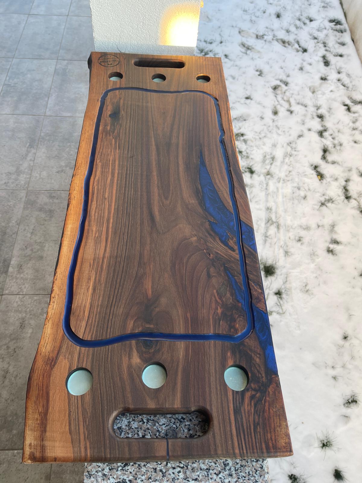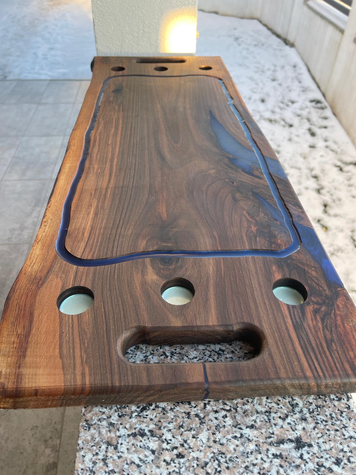 Platoul are un design complex și spectaculos, fiind prevăzut cu două fețe pentru utilizare versatilă. Inserțiile din rășină epoxidică albastră oferă un aspect modern și elegant, iar cele șase găuri pentru shot-uri, realizate cu rășină albă pe fundal, transformă produsul într-o piesă ideală pentru petreceri sau evenimente speciale. Scurgătorul pentru grăsimi adaugă un plus de funcționalitate, fiind perfect pentru servirea cărnii sau a preparatelor suculente.
