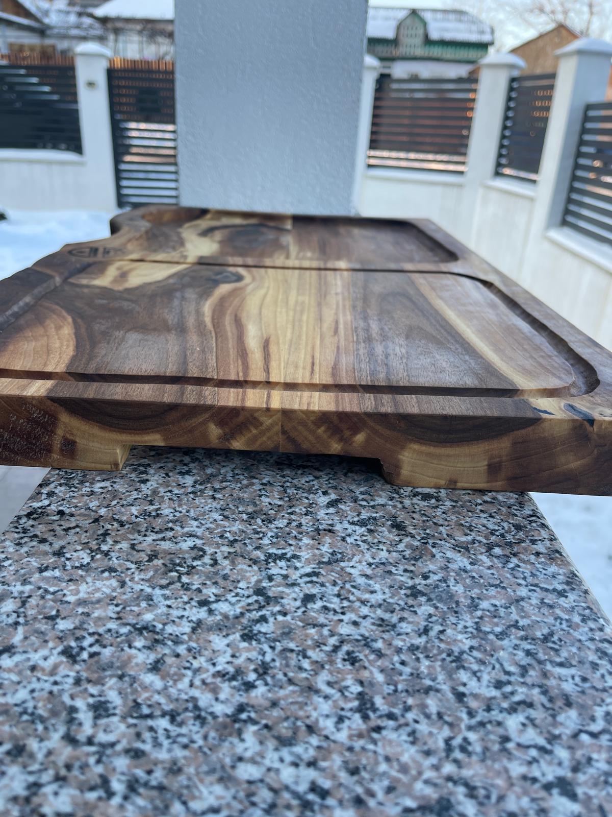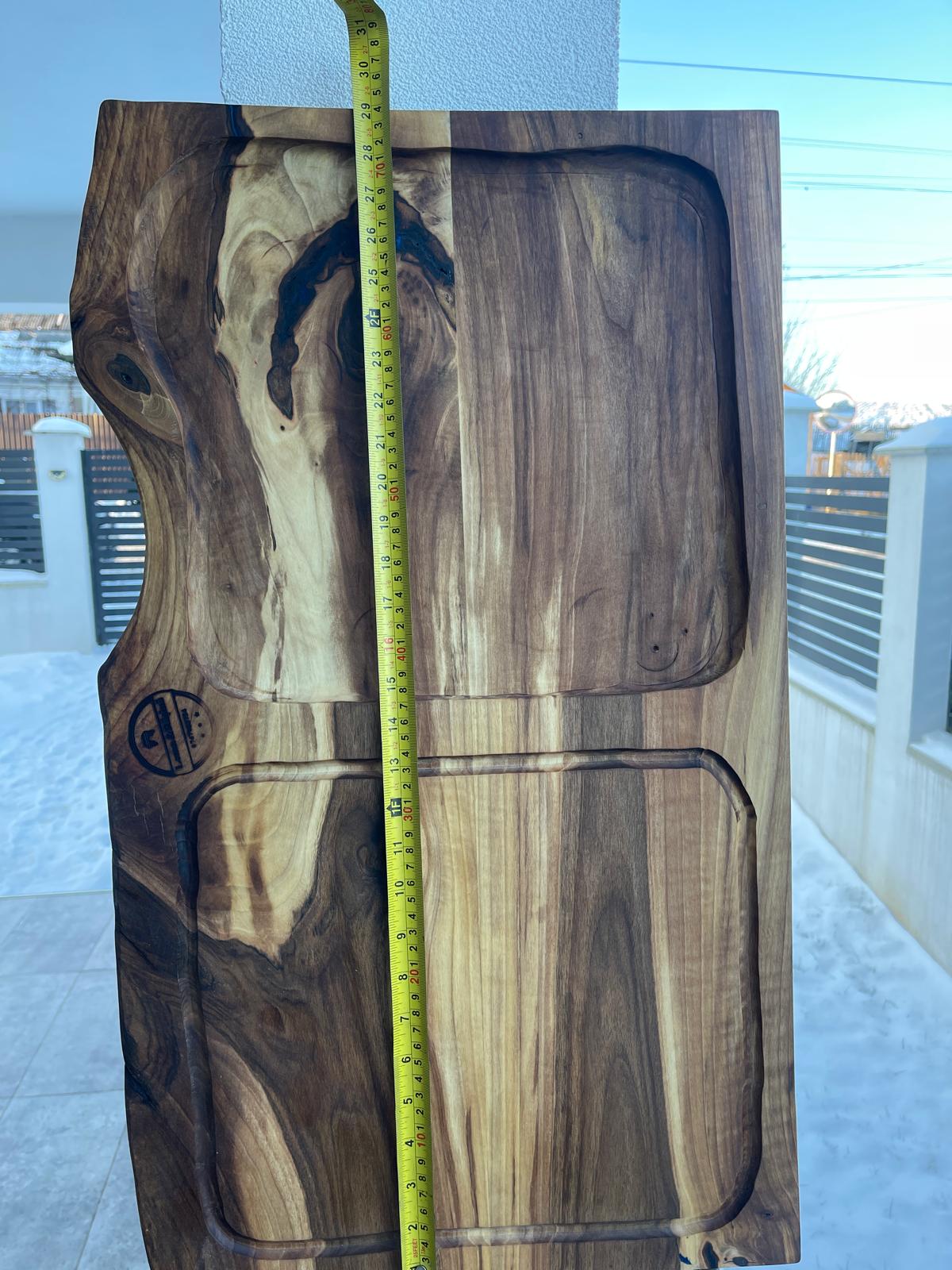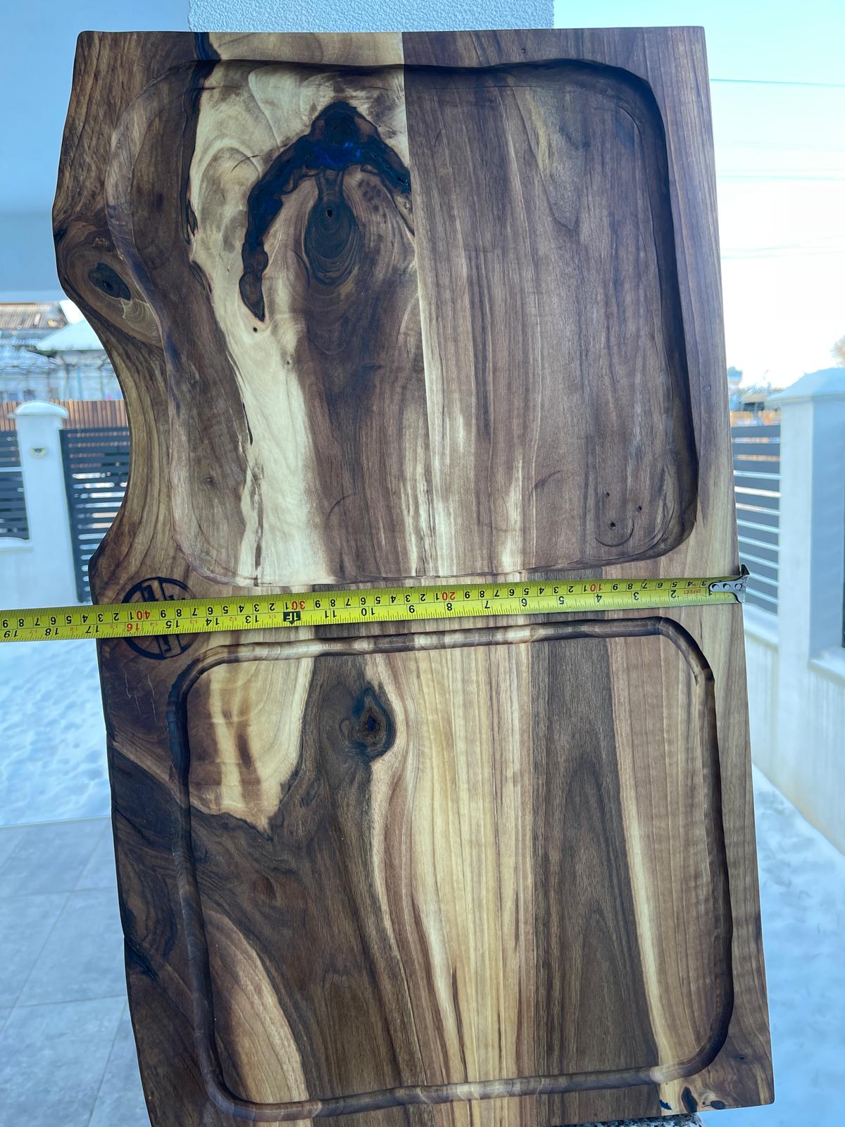 Fiecare piesă este diferită, forma naturală a lemnului fiind păstrată intenționat pentru a evidenția autenticitatea produsului. Acest platou este alegerea perfectă pentru cei care apreciază designul natural, produsele artizanale și materialele premium.