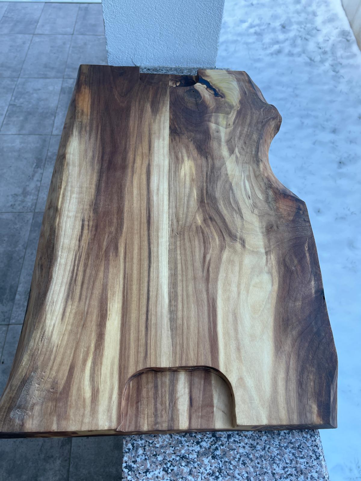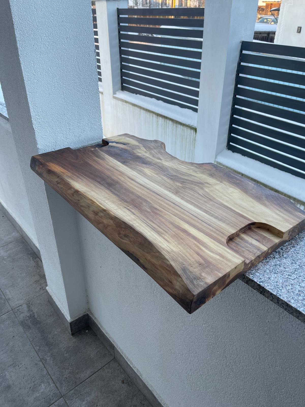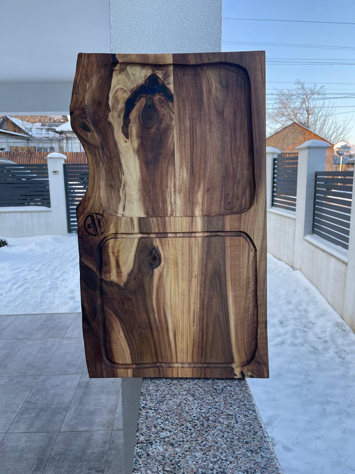 Fiecare piesă este diferită, forma naturală a lemnului fiind păstrată intenționat pentru a evidenția autenticitatea produsului. Acest platou este alegerea perfectă pentru cei care apreciază designul natural, produsele artizanale și materialele premium.
