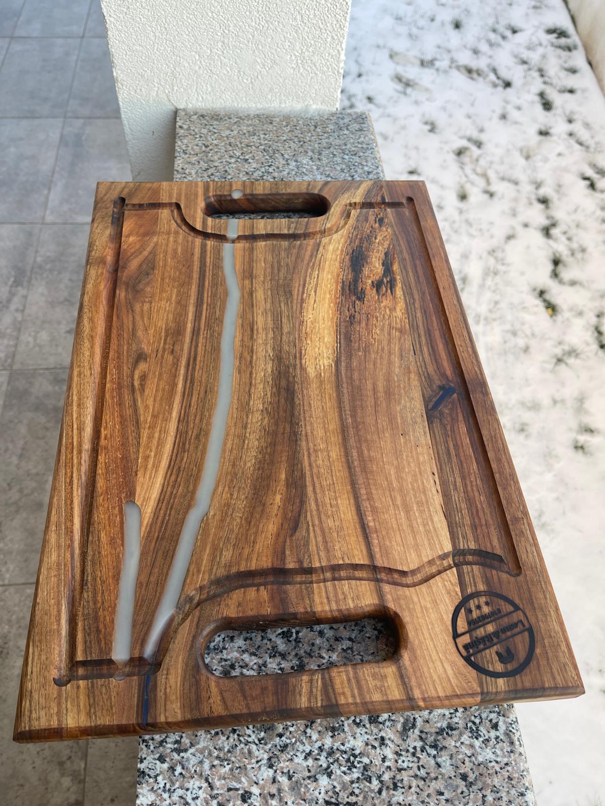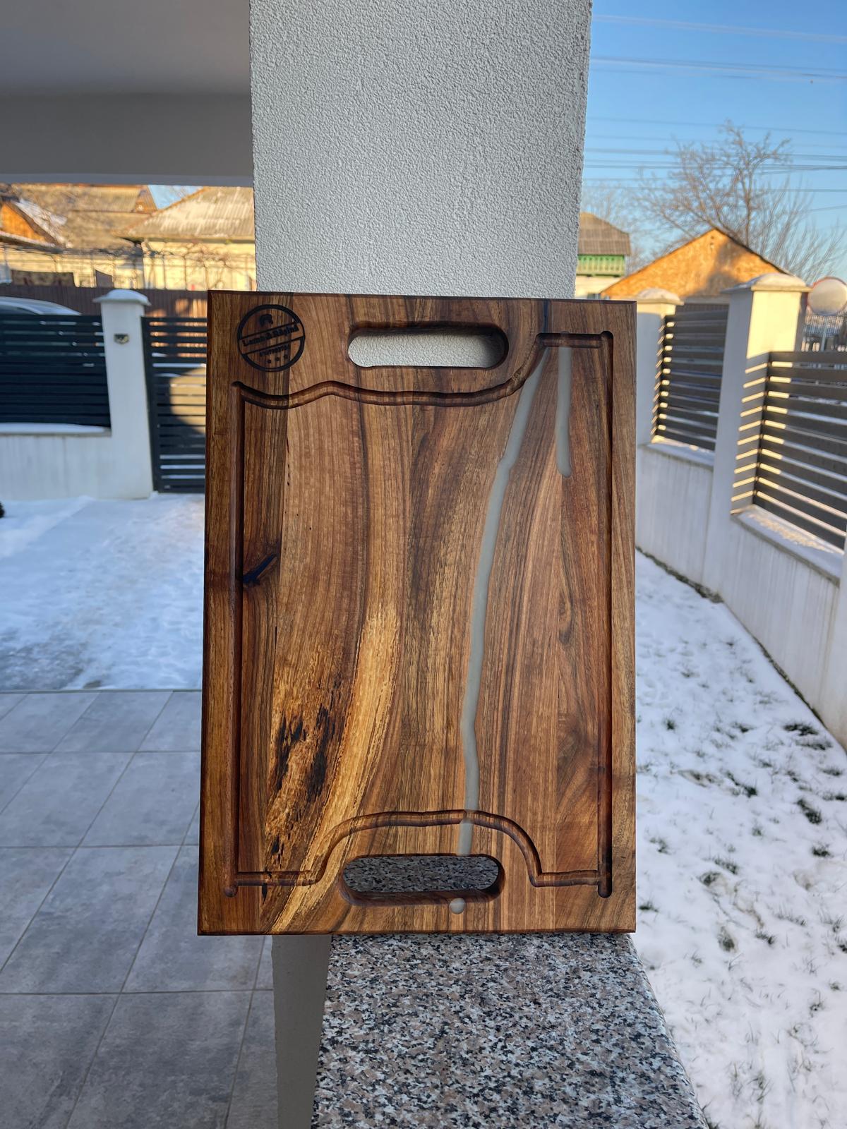 Platou handmade din lemn de nuc masiv, cu inserții din rășină epoxidică alb-fumurie, finisat cu ulei safe food pentru protecție și siguranță în contactul cu alimentele. Două fețe de utilizare oferă versatilitate, iar combinația de stil rustic și elegant îl face ideal pentru servire decorativă sau prezentarea preparatelor. Dimensiuni 50×35 cm.