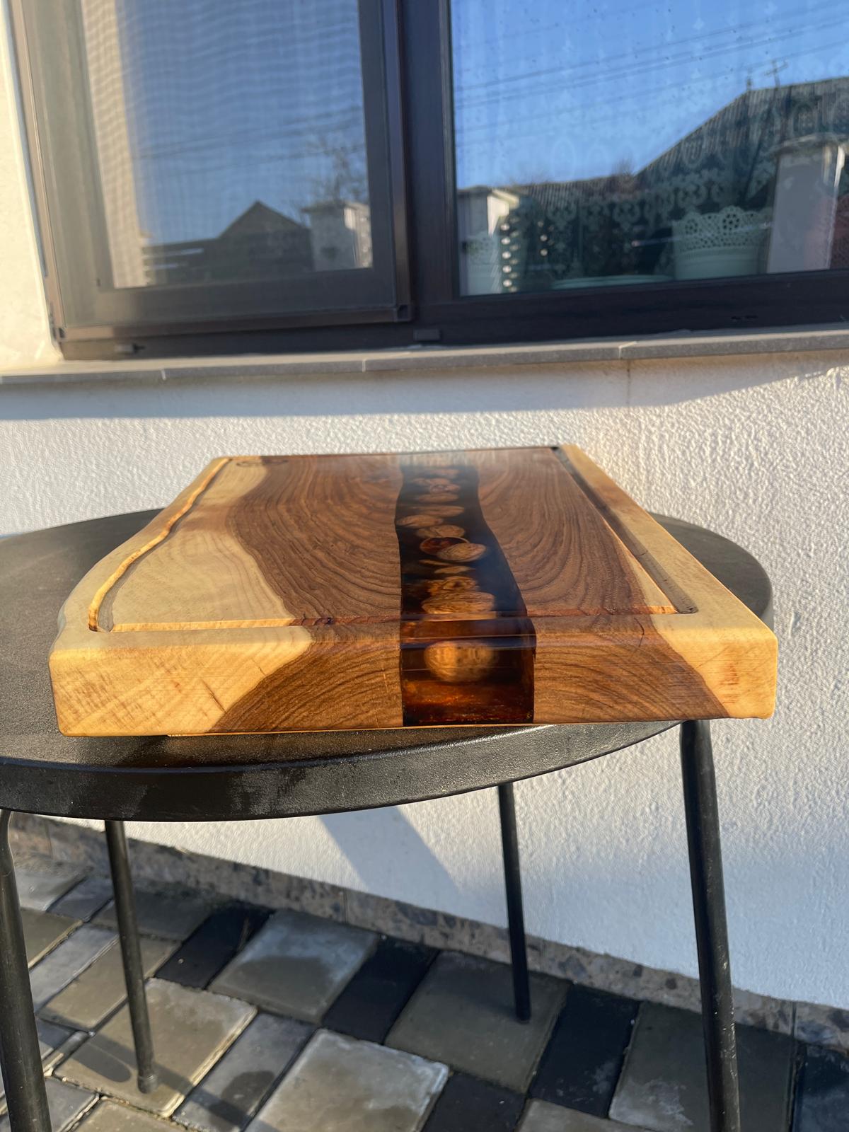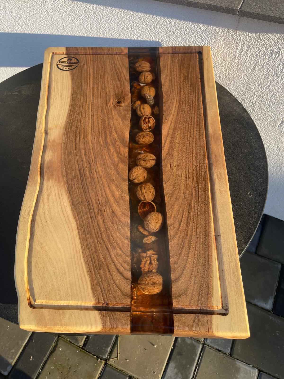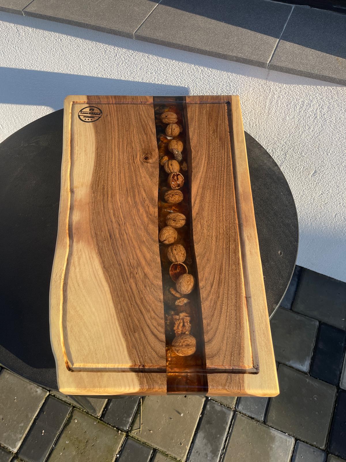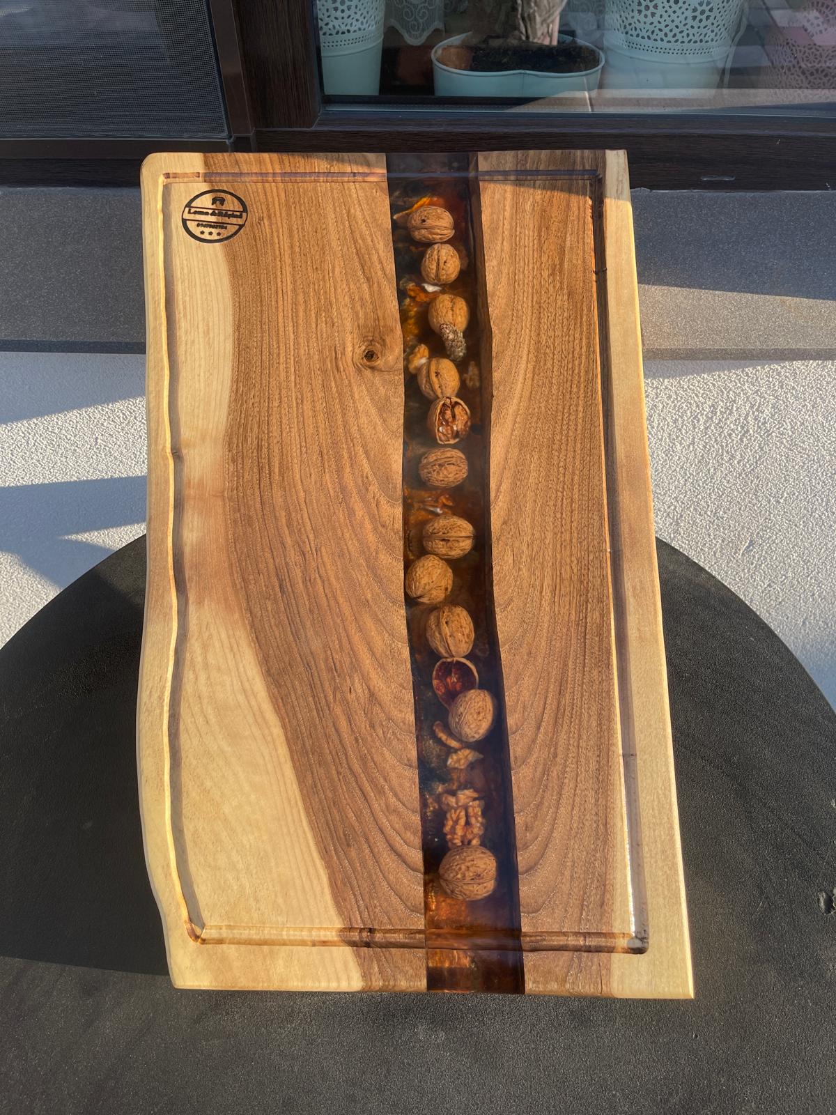 Platou artizanal realizat din lemn masiv de nuc, cu inserție centrală din rășină epoxidică în care sunt încorporate nuci naturale, pentru o tematică autentică și originală.