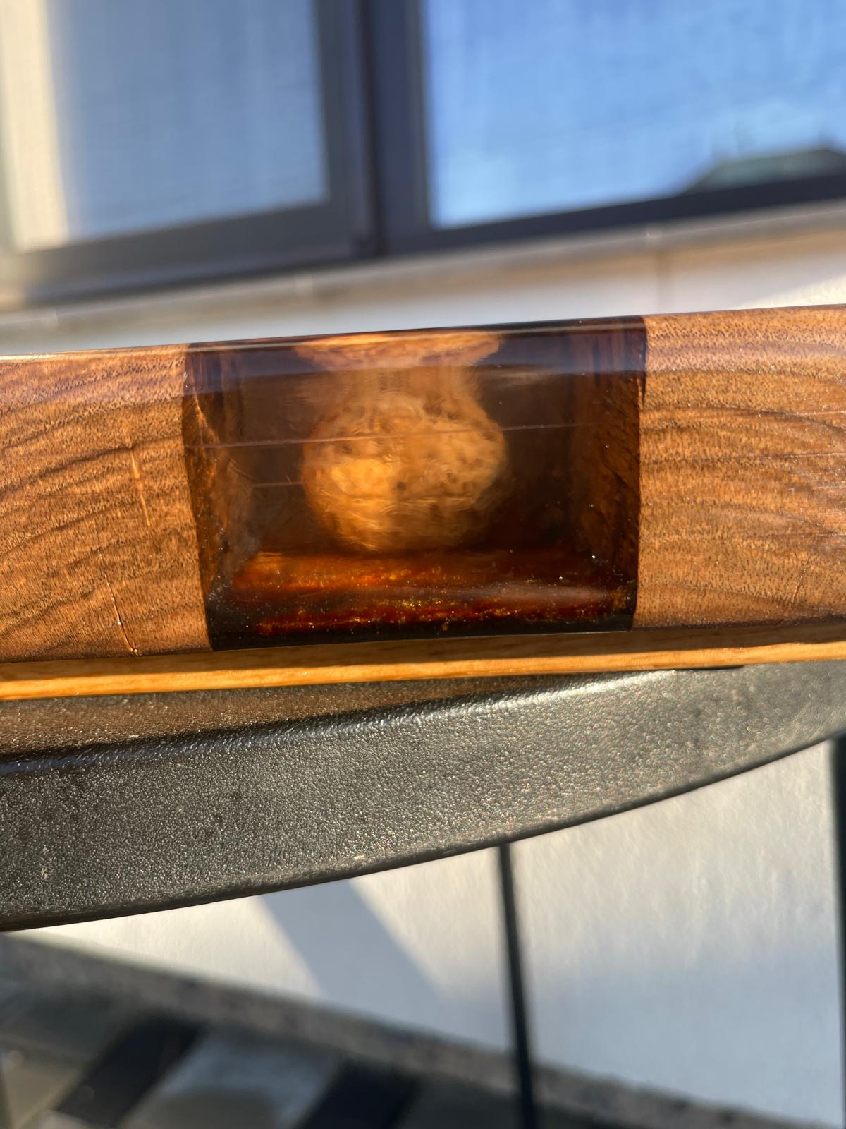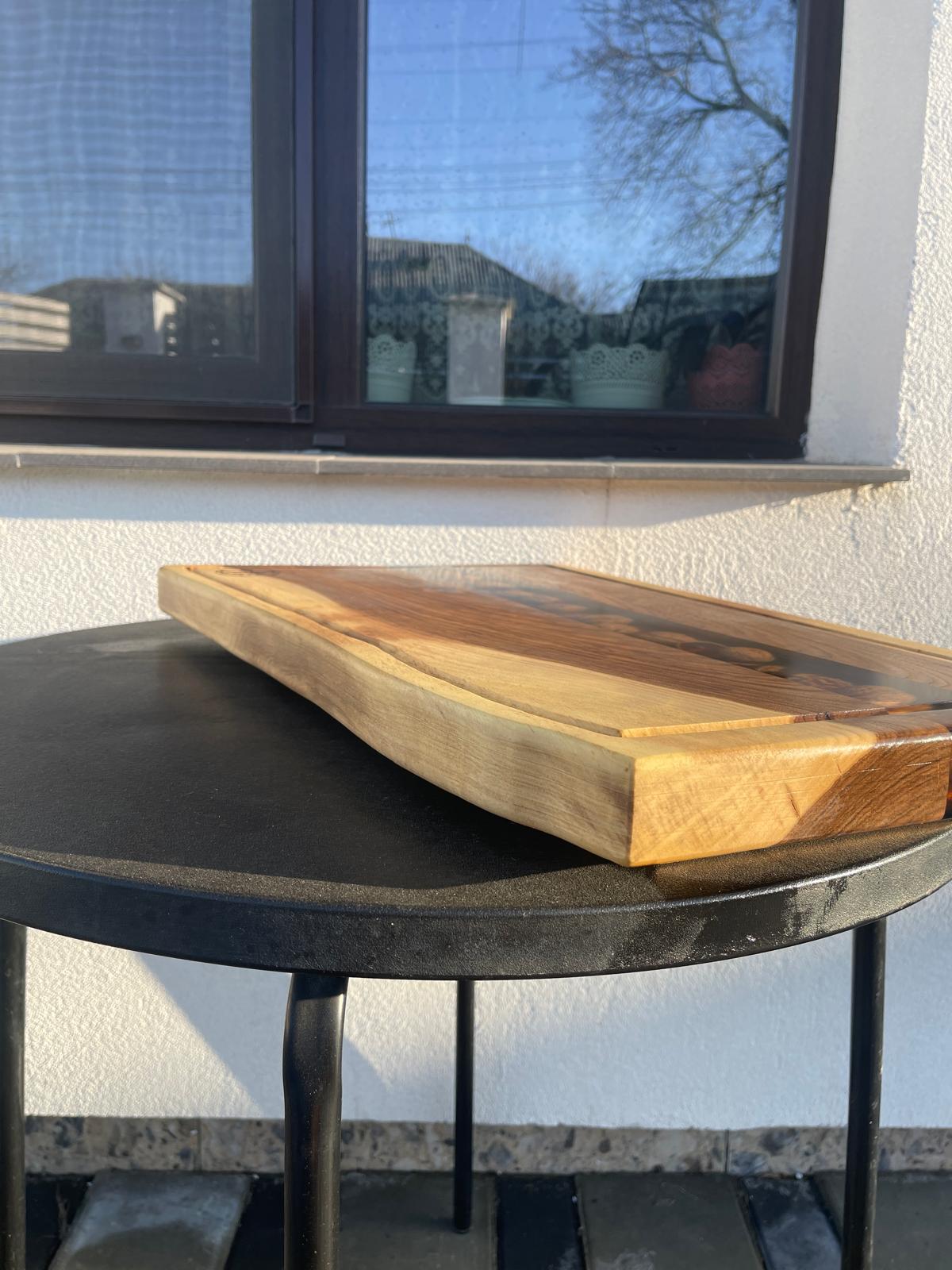 Designul păstrează forma naturală a lemnului, cu margini organice care evidențiază frumusețea fibrei. Inserția din rășină epoxidică transparentă, cu tonuri calde, pune în valoare nucile încorporate, creând un efect vizual spectaculos și unic.