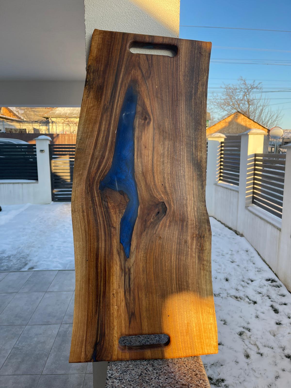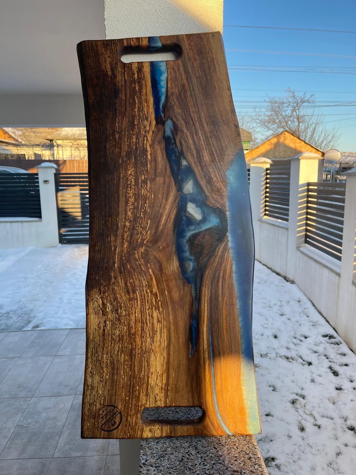 Cu dimensiunile de 85x37x2,5 cm, platoul oferă o suprafață generoasă pentru servire și prezentare, fiind ideal pentru evenimente speciale, platouri gourmet sau ca obiect decorativ în bucătării și dining. Este un produs handmade, unicat, care îmbină estetica artistică cu funcționalitatea premium.