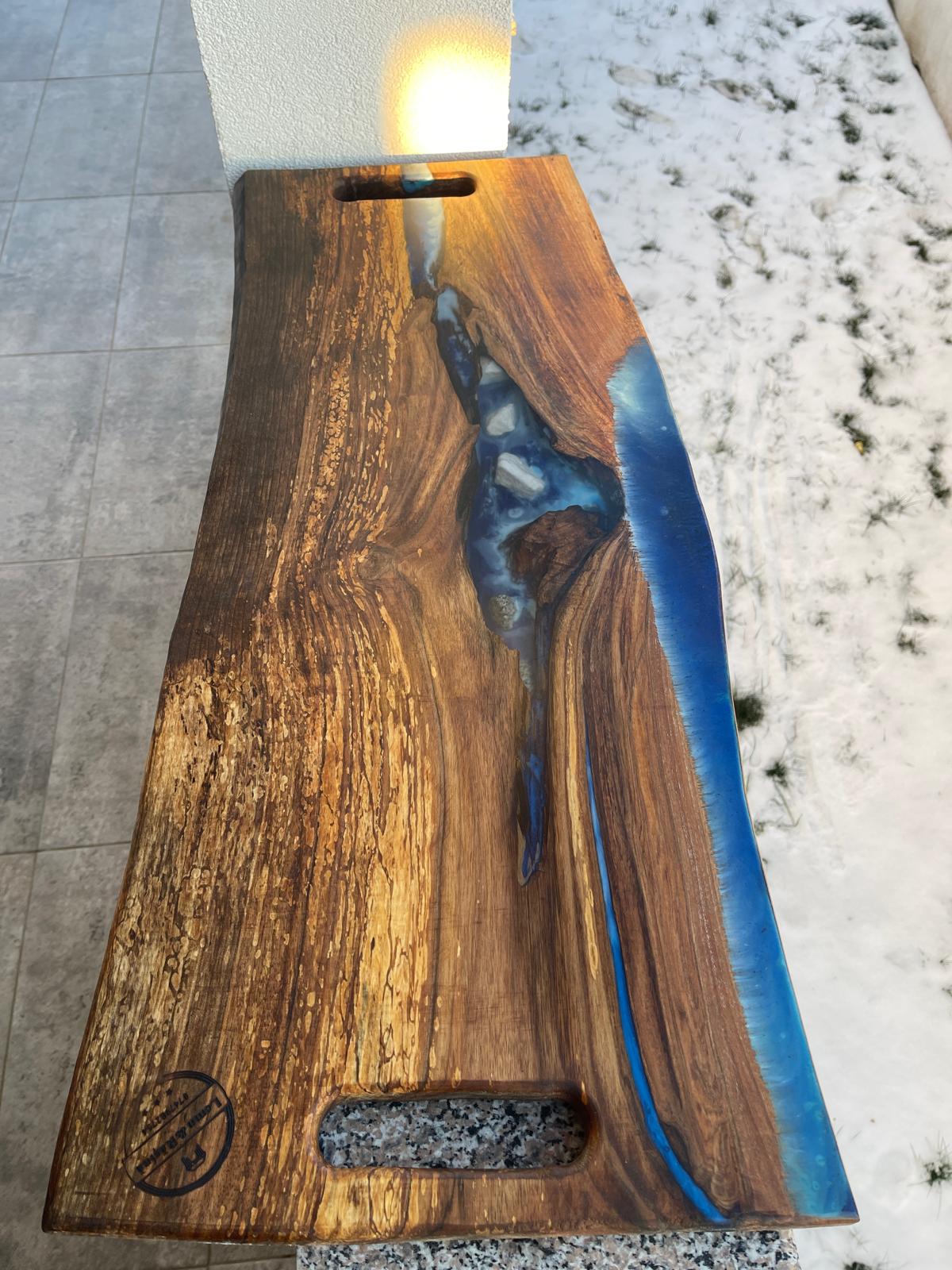 Platoul se remarcă prin designul său artistic, inspirat de tematica apei, cu valuri delicate realizate din rășină epoxidică albastră și pietre naturale încorporate, completate de straturi de rășină transparentă care evidențiază frumusețea detaliilor. Această combinație creează un efect vizual spectaculos și transformă platoul într-o piesă de artă funcțională.