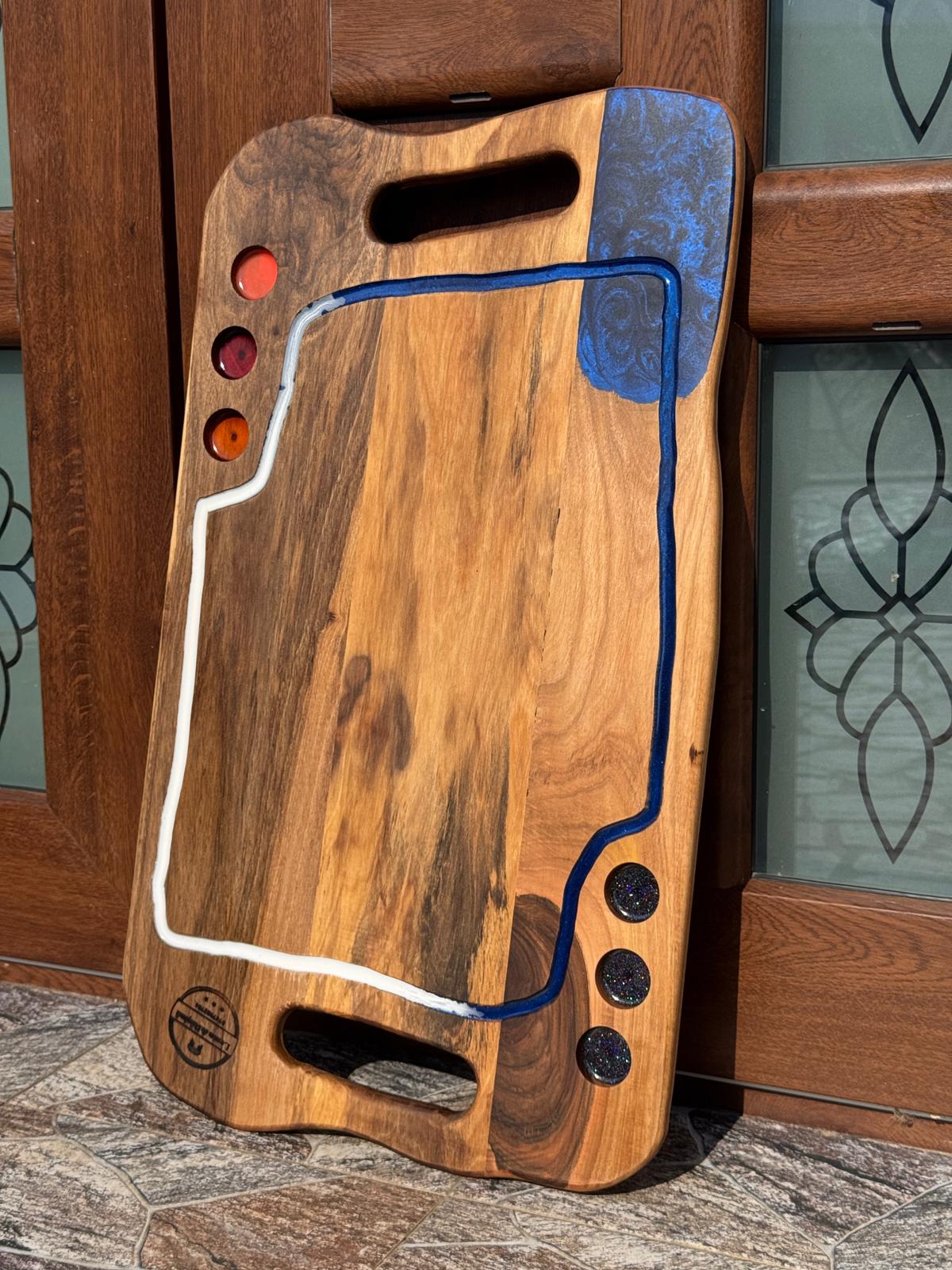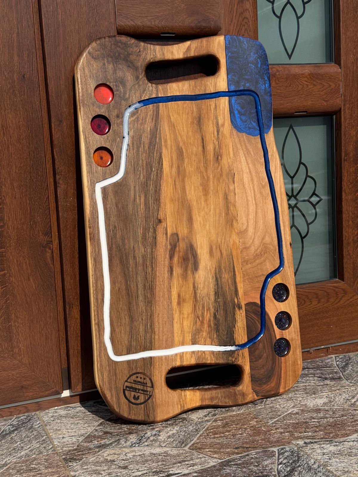 Lemnul de nuc oferă durabilitate și o textură bogată, iar inserțiile de rășină epoxidică creează un contrast vizual spectaculos. Acest platou poate fi folosit pentru servire, degustări sau ca element decorativ deosebit.
