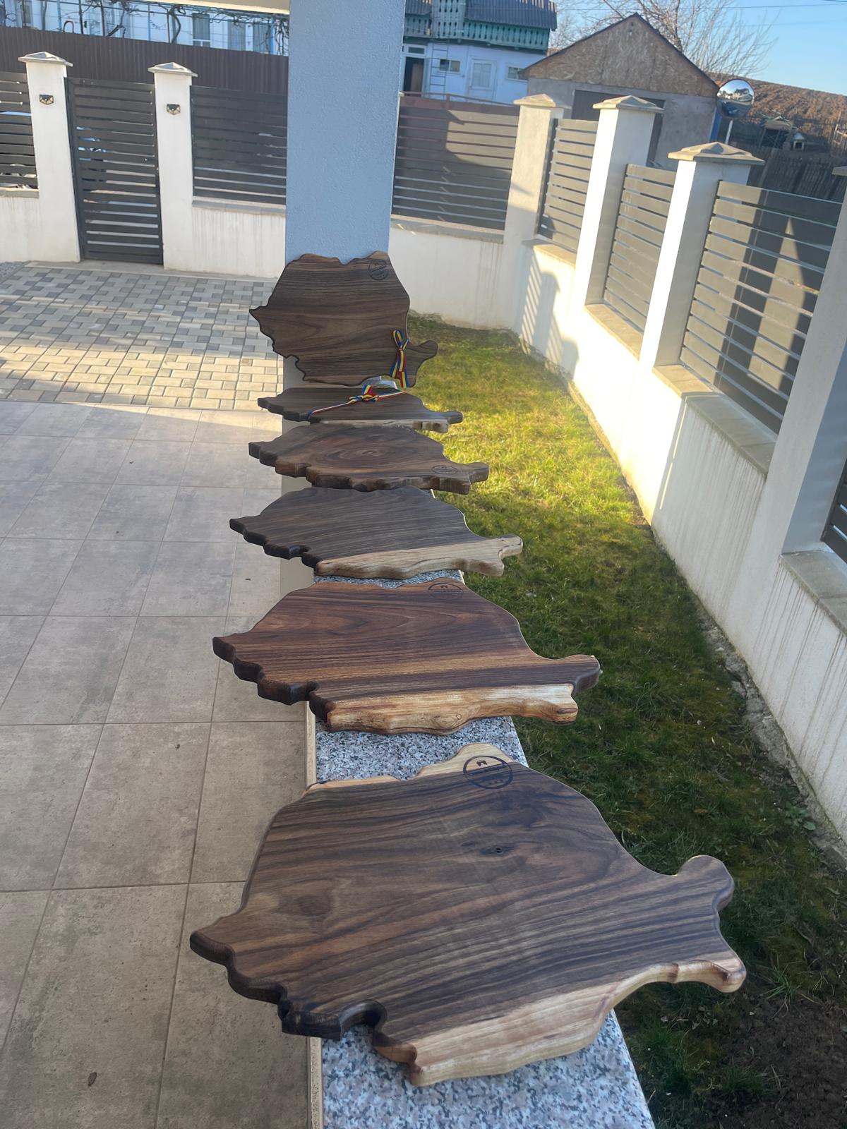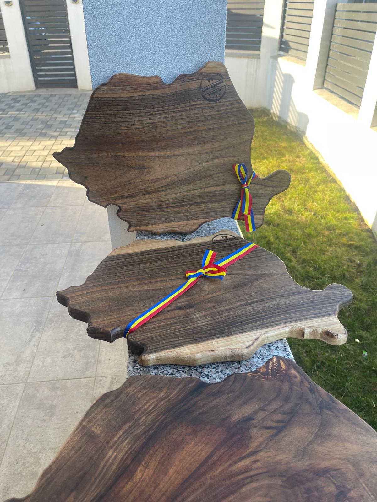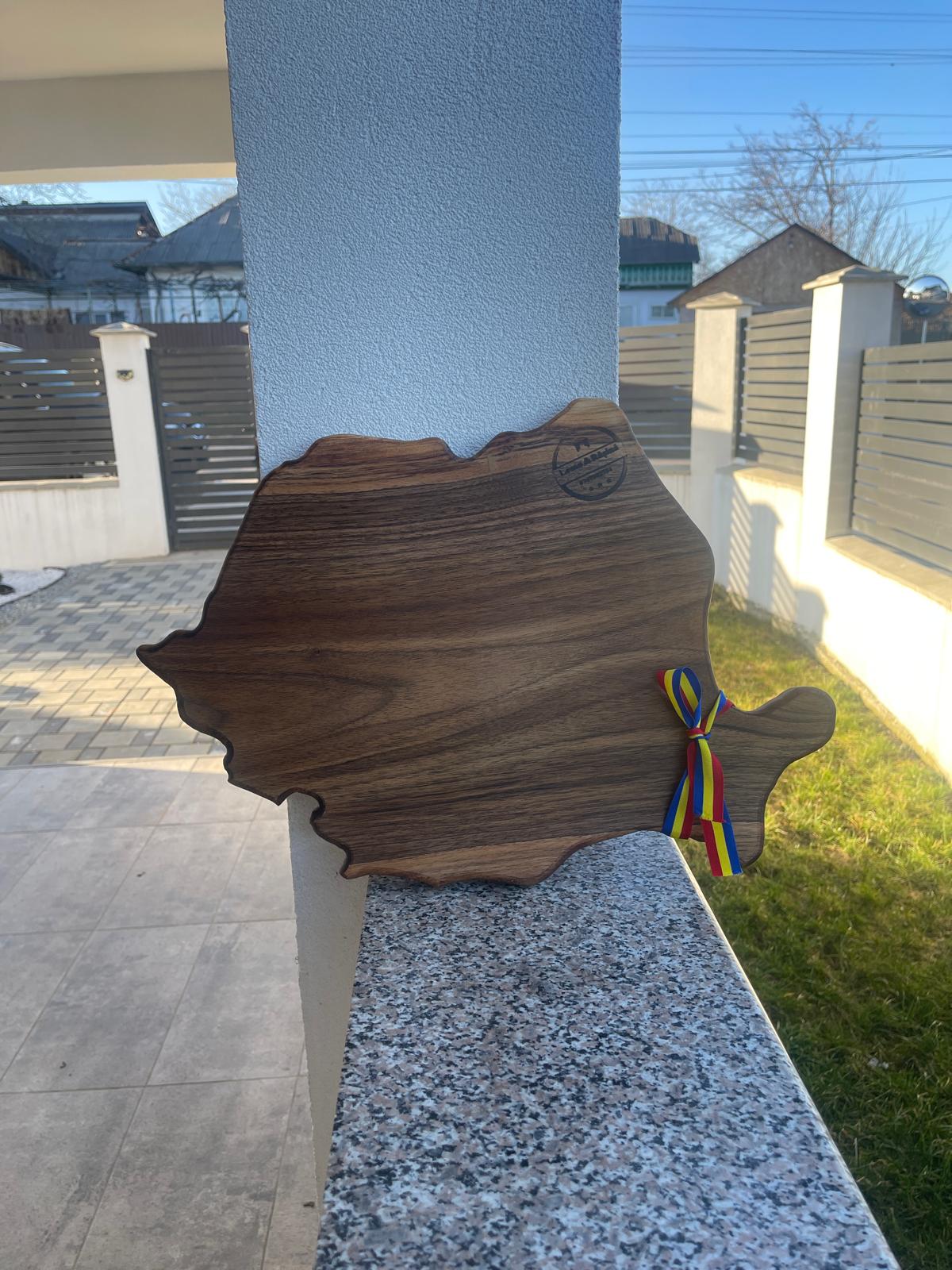 Platou special realizat manual din lemn masiv de nuc, decupat în forma României – o piesă unică perfectă pentru servire sau cadou.