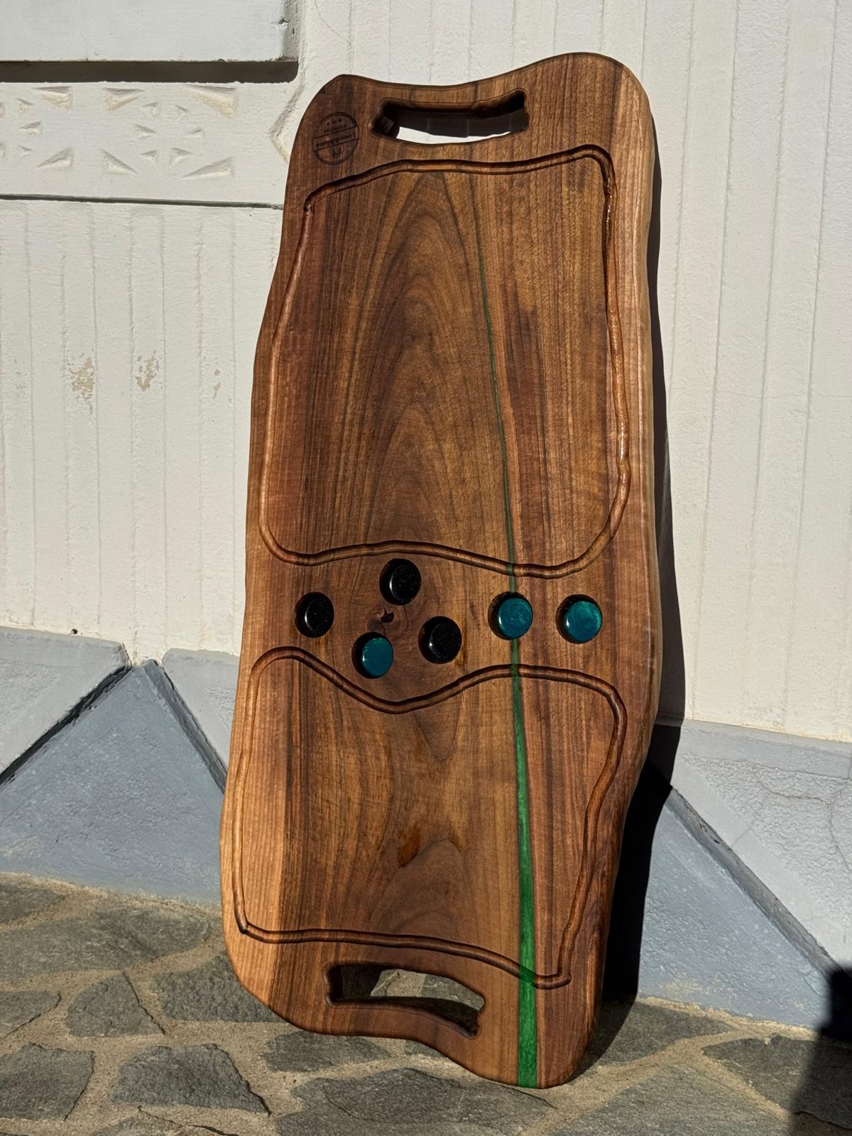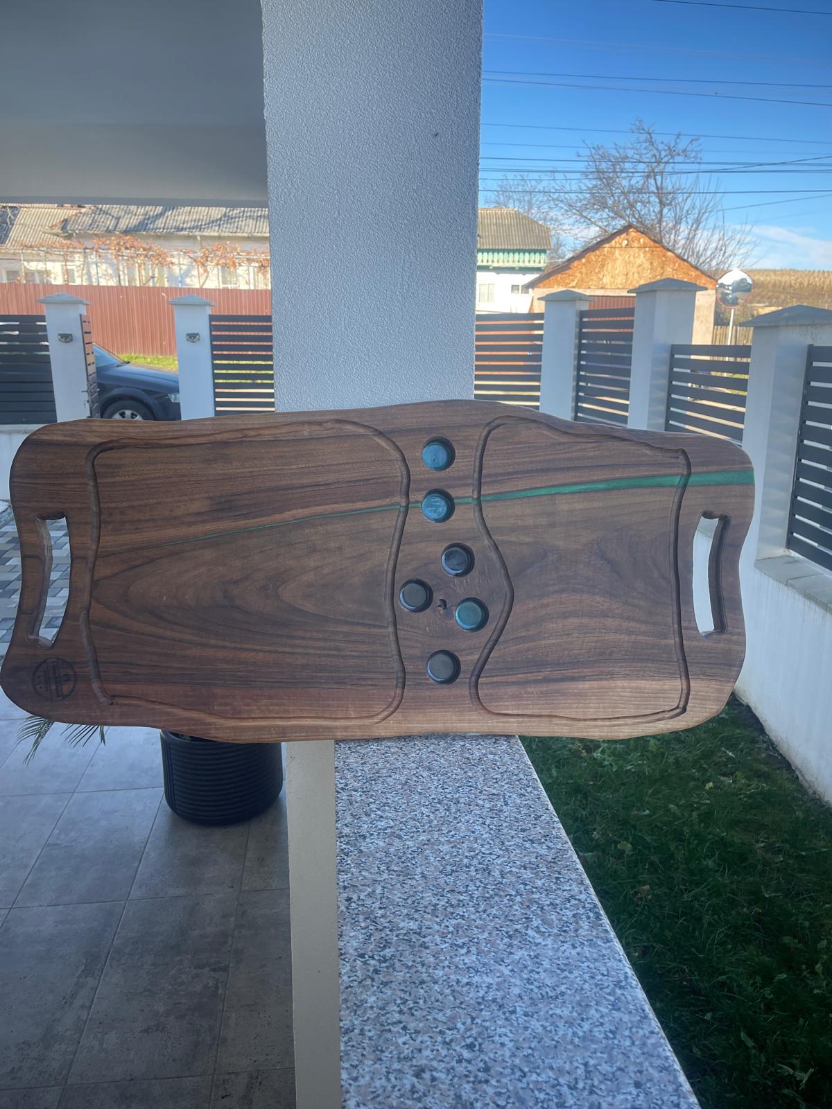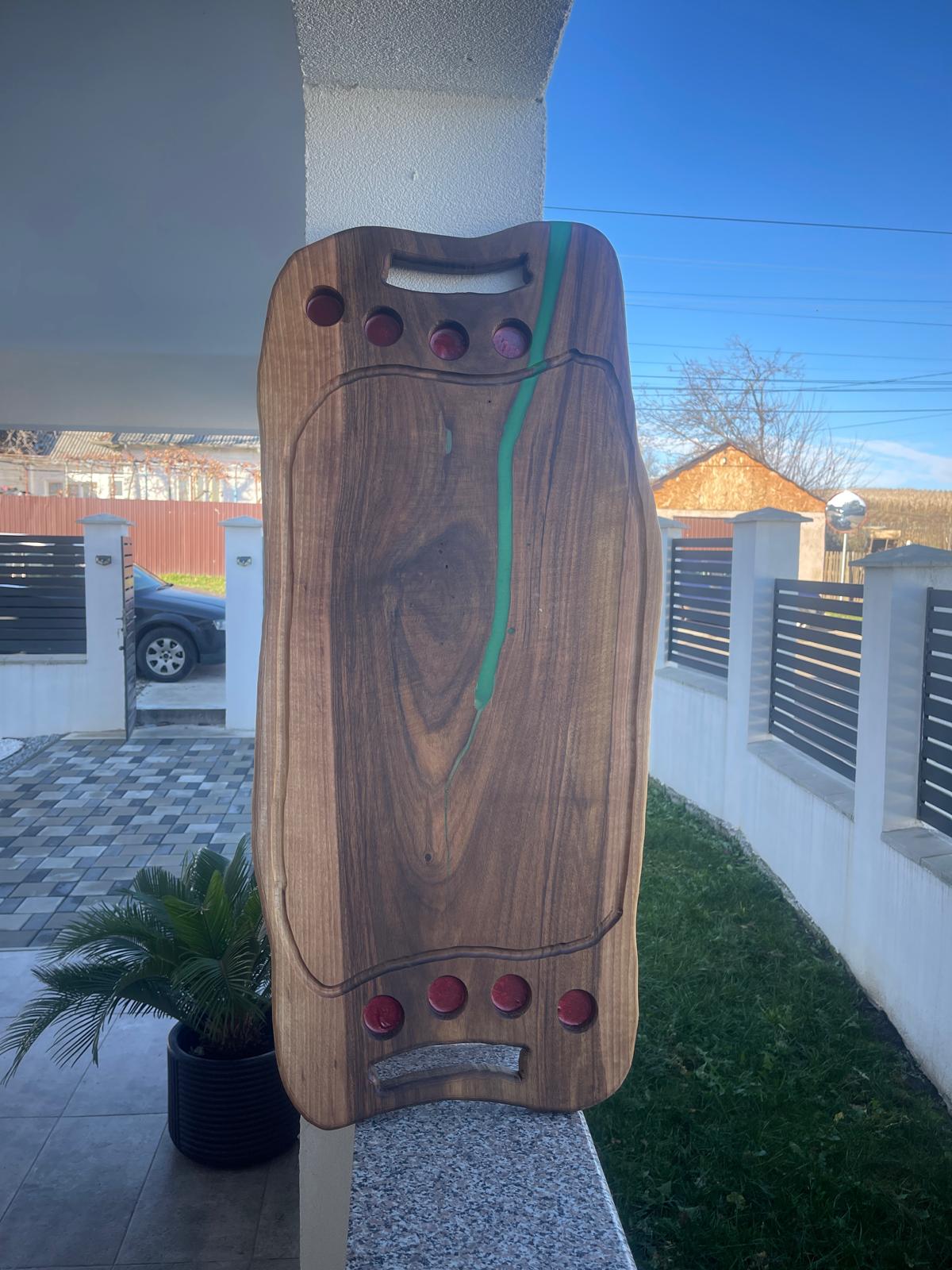 Alege eleganța naturală a unui platou de servire realizat manual din lemn masiv de nuc și rășină epoxidică verde. Designul său cu două fețe îți permite să îl folosești în mai multe moduri — fie pentru servirea preparatelor, fie ca piesă decorativă deosebită.