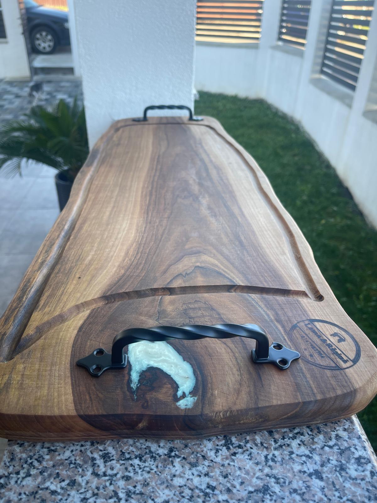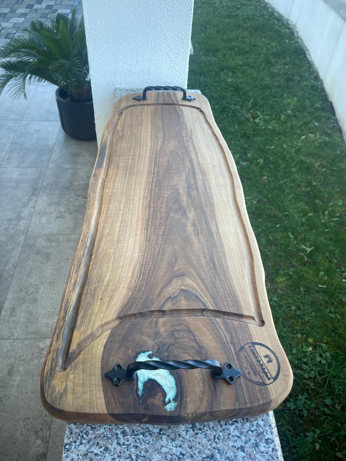 Un platou de servire elegant și durabil, realizat manual din lemn masiv de nuc, completat cu o inserție rafinată din rășină epoxidică albă. Mânerele din fier forjat adaugă un aspect rustic și o notă de autenticitate, transformând fiecare servire într-o experiență deosebită.