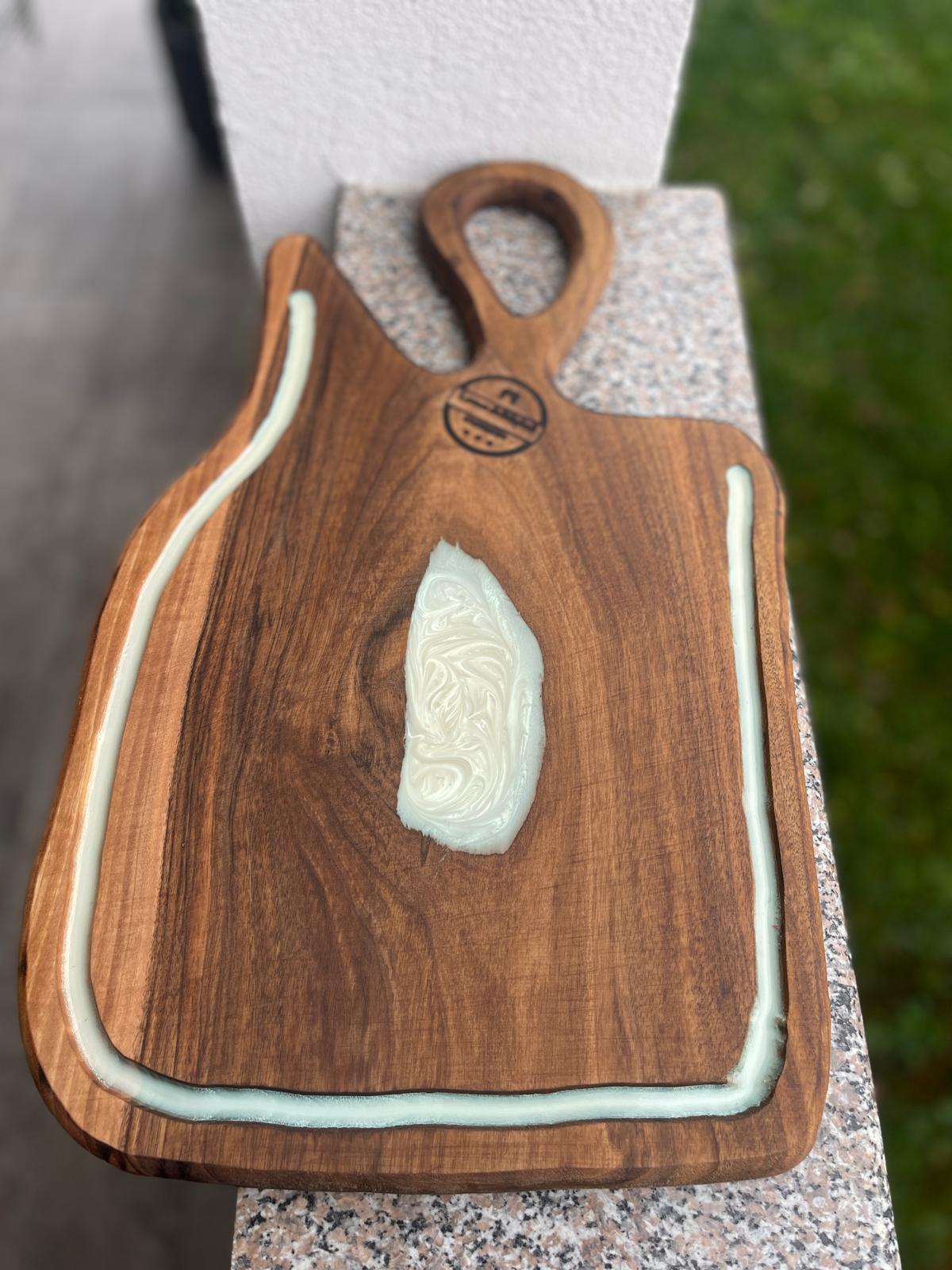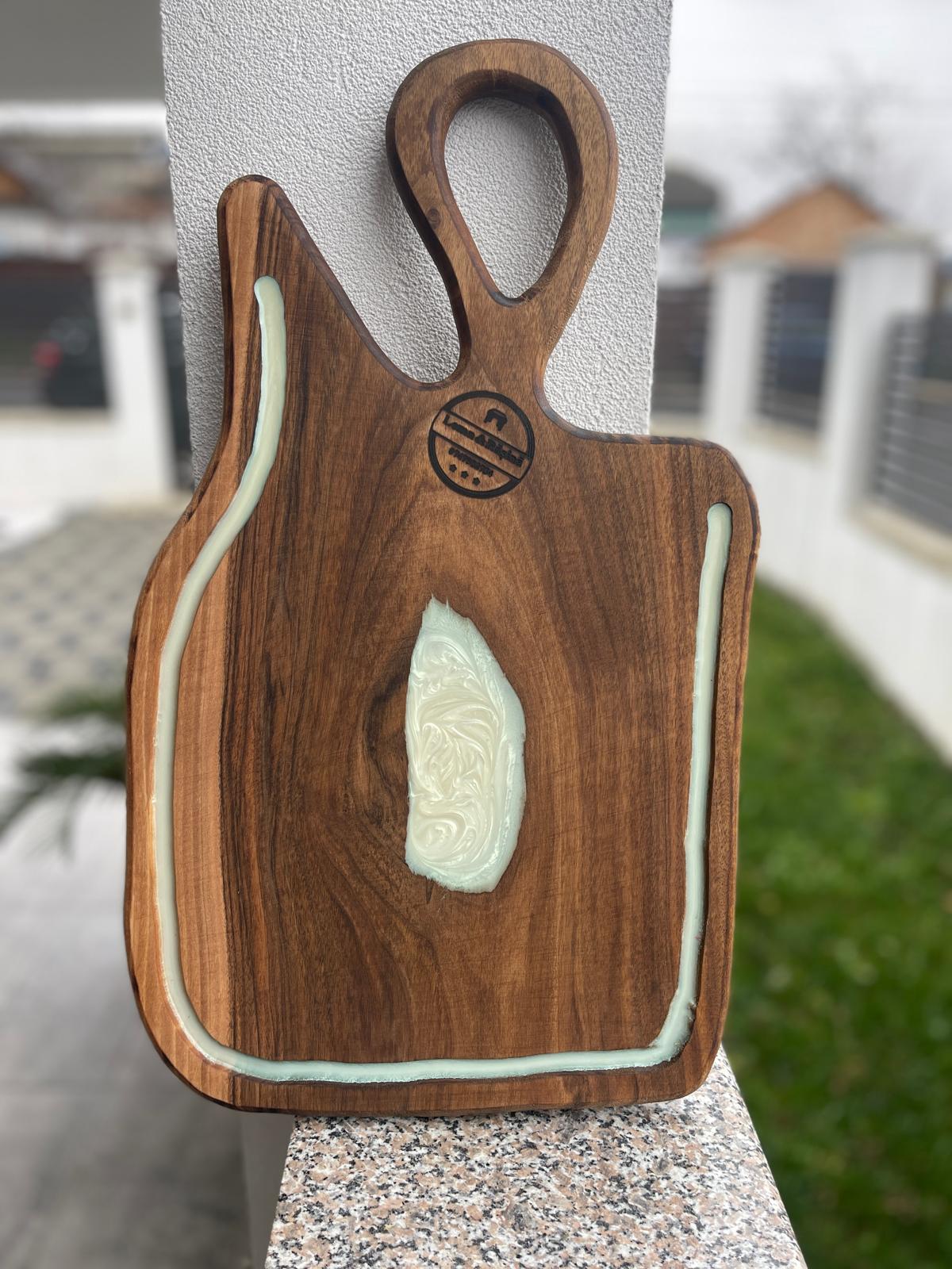 Acest platou/tocător combină frumusețea lemnului de nuc cu eleganța rășinii epoxidice albe, creând un accesoriu practic și estetic. Inserțiile de rășină adaugă un contrast vizual delicat, transformând piesa într-un element decorativ și funcțional pentru bucătărie, bar sau masă de servire.