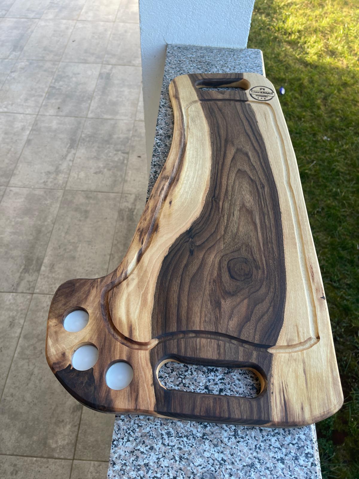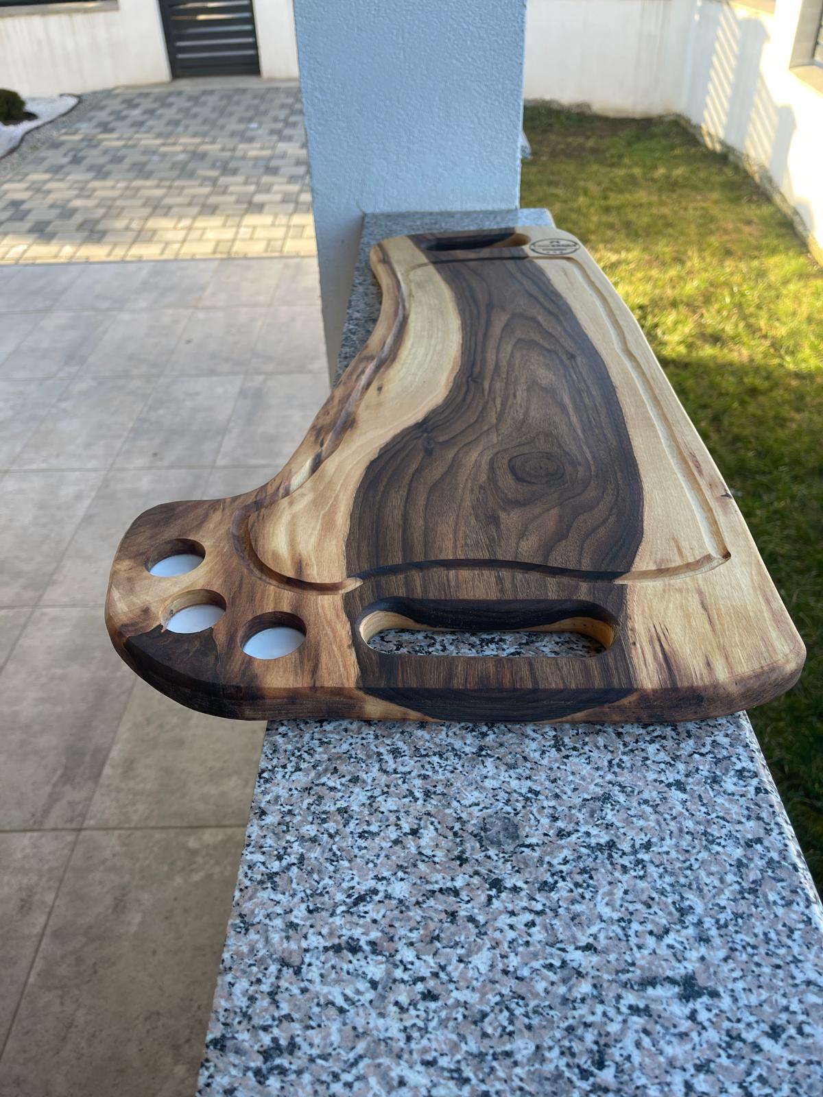 Platou premium realizat manual din lemn masiv de nuc, conceput special pentru servirea băuturilor și a shot-urilor.