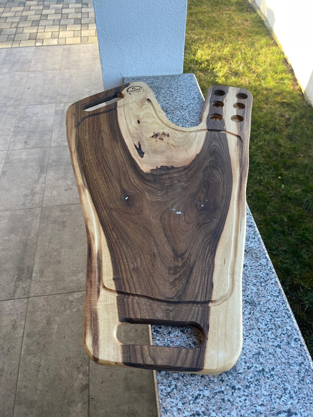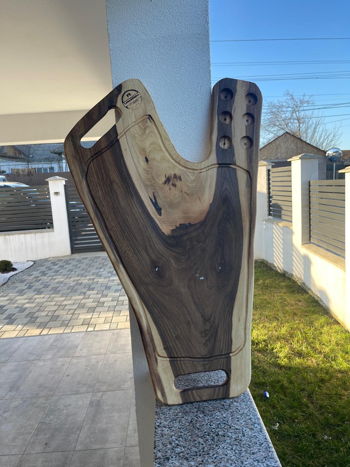 Acest platou pentru shot-uri este realizat manual din lemn masiv de nuc și este conceput pentru servirea băuturilor într-un mod spectaculos.