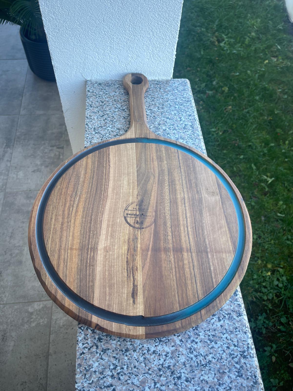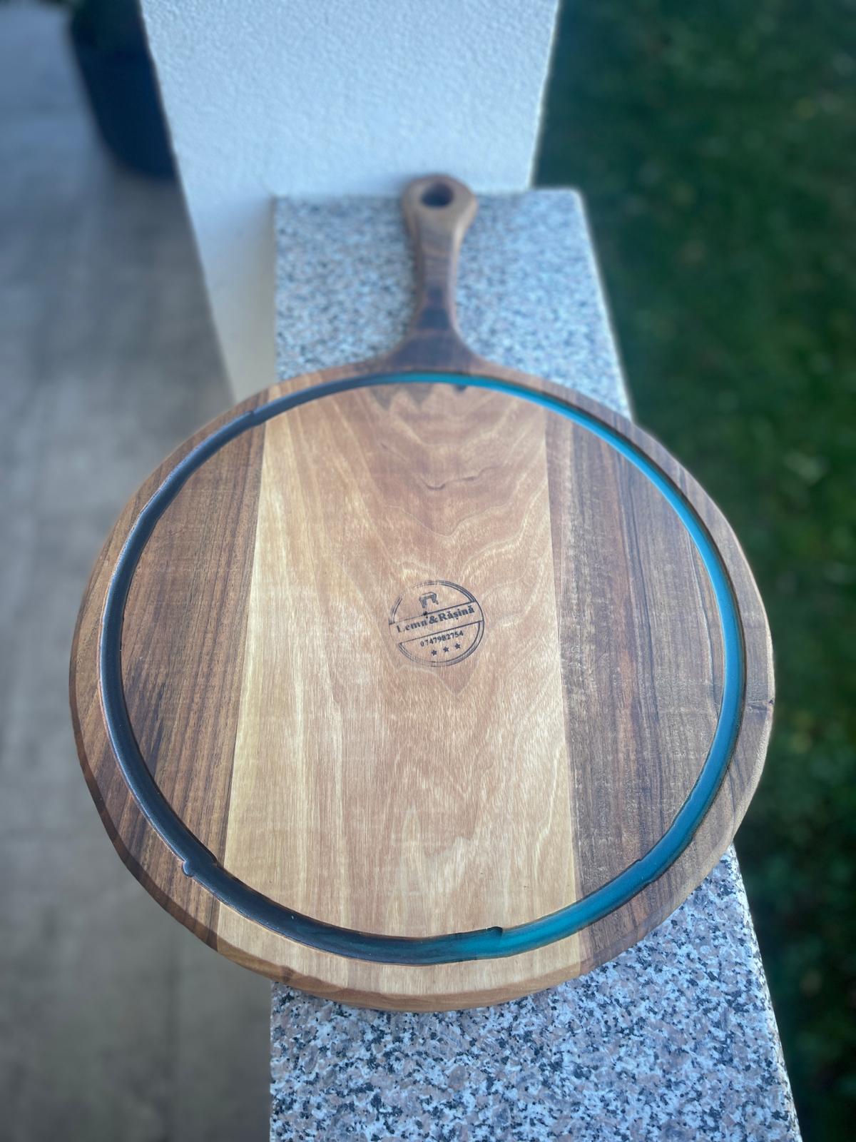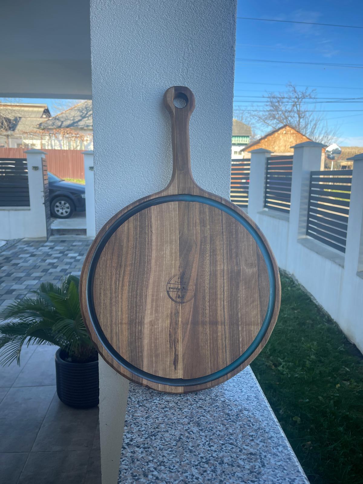 Savurează pizza ca la pizzerie pe un platou rotund lucrat manual, realizat din lemn masiv și completat cu rășină epoxidică decorativă. Fiecare platou este unic, combinând frumusețea naturală a lemnului cu luciul elegant al rășinii, transformând fiecare masă într-o experiență specială.