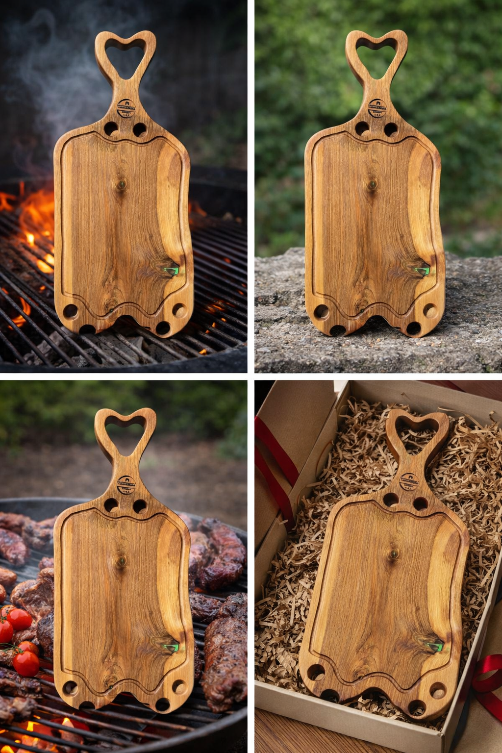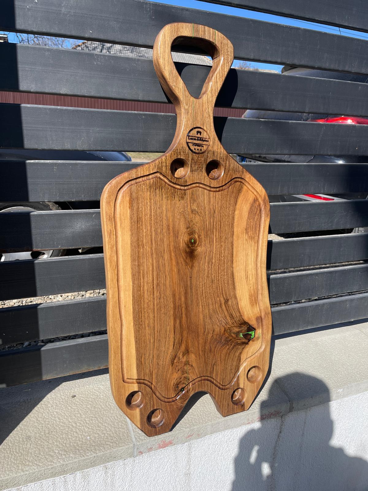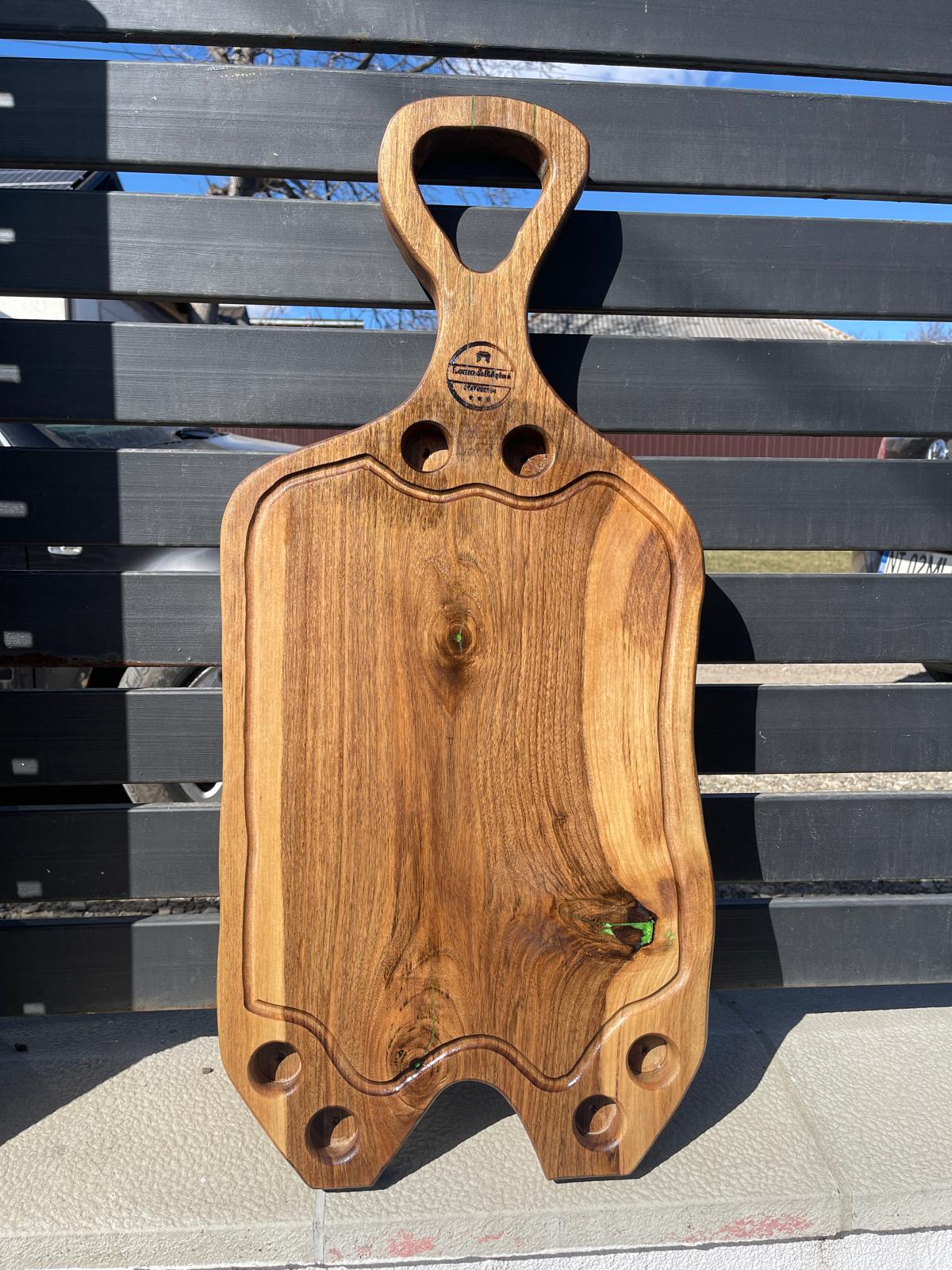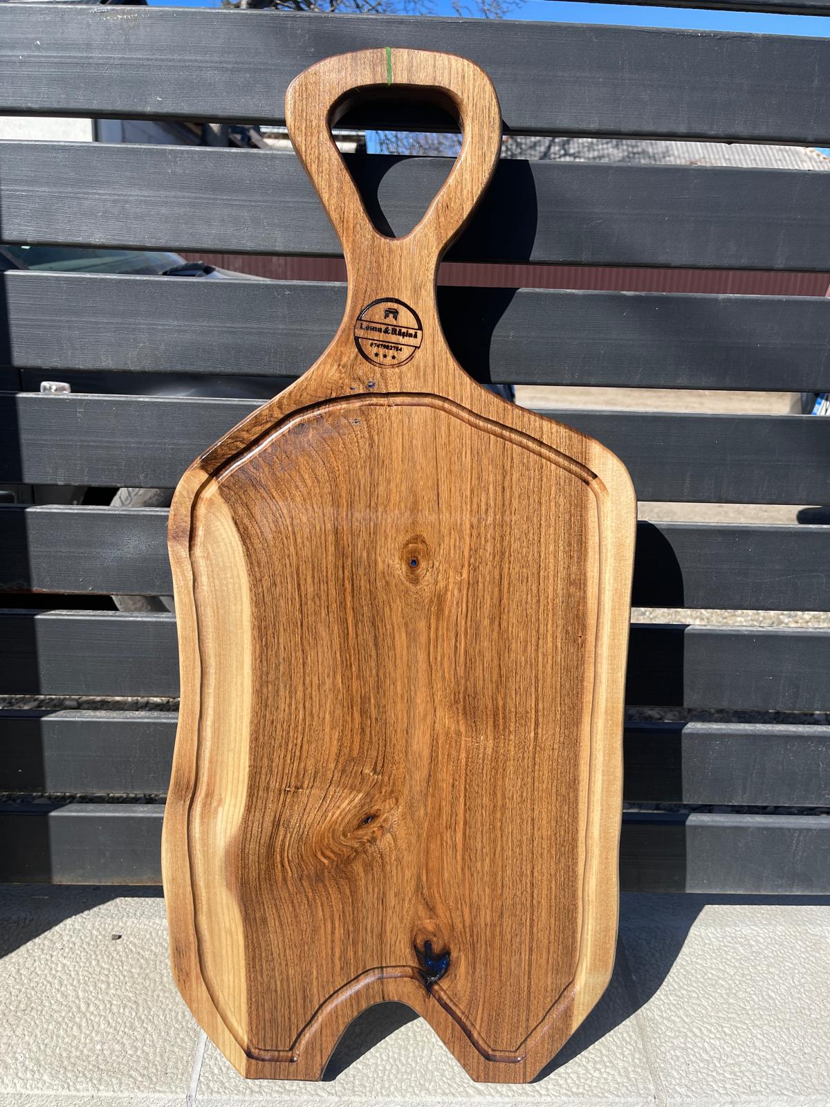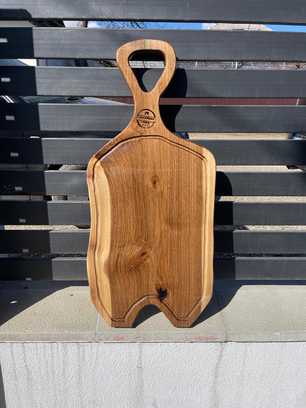 Acest platou este realizat manual din lemn masiv de nuc, fiind o piesă unică ce pune în valoare frumusețea naturală a lemnului. Fiecare fibră, nod și formă naturală oferă caracter și autenticitate produsului.