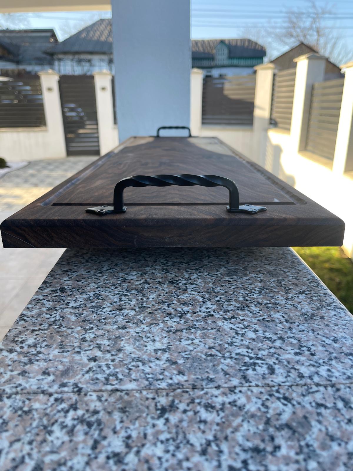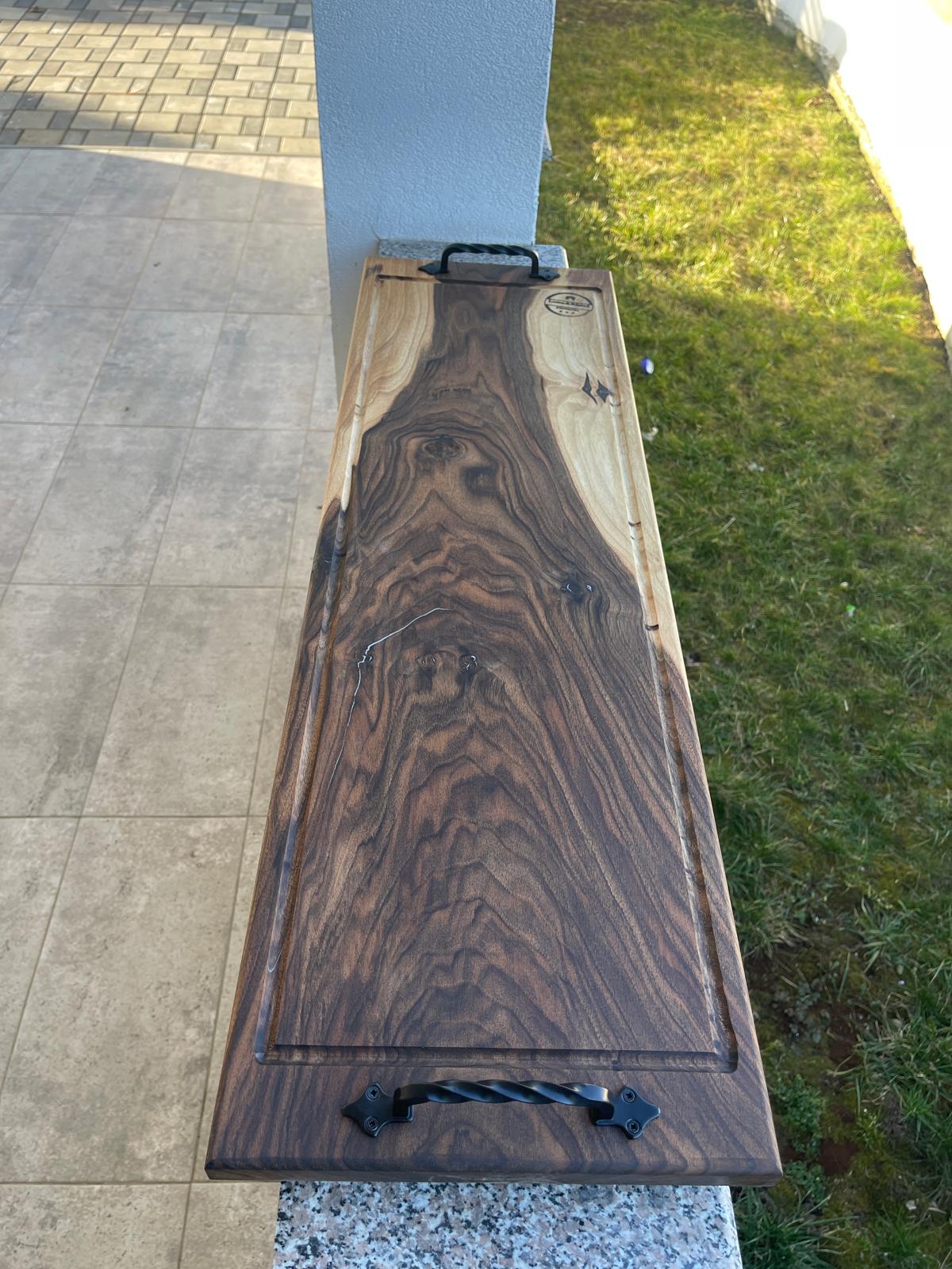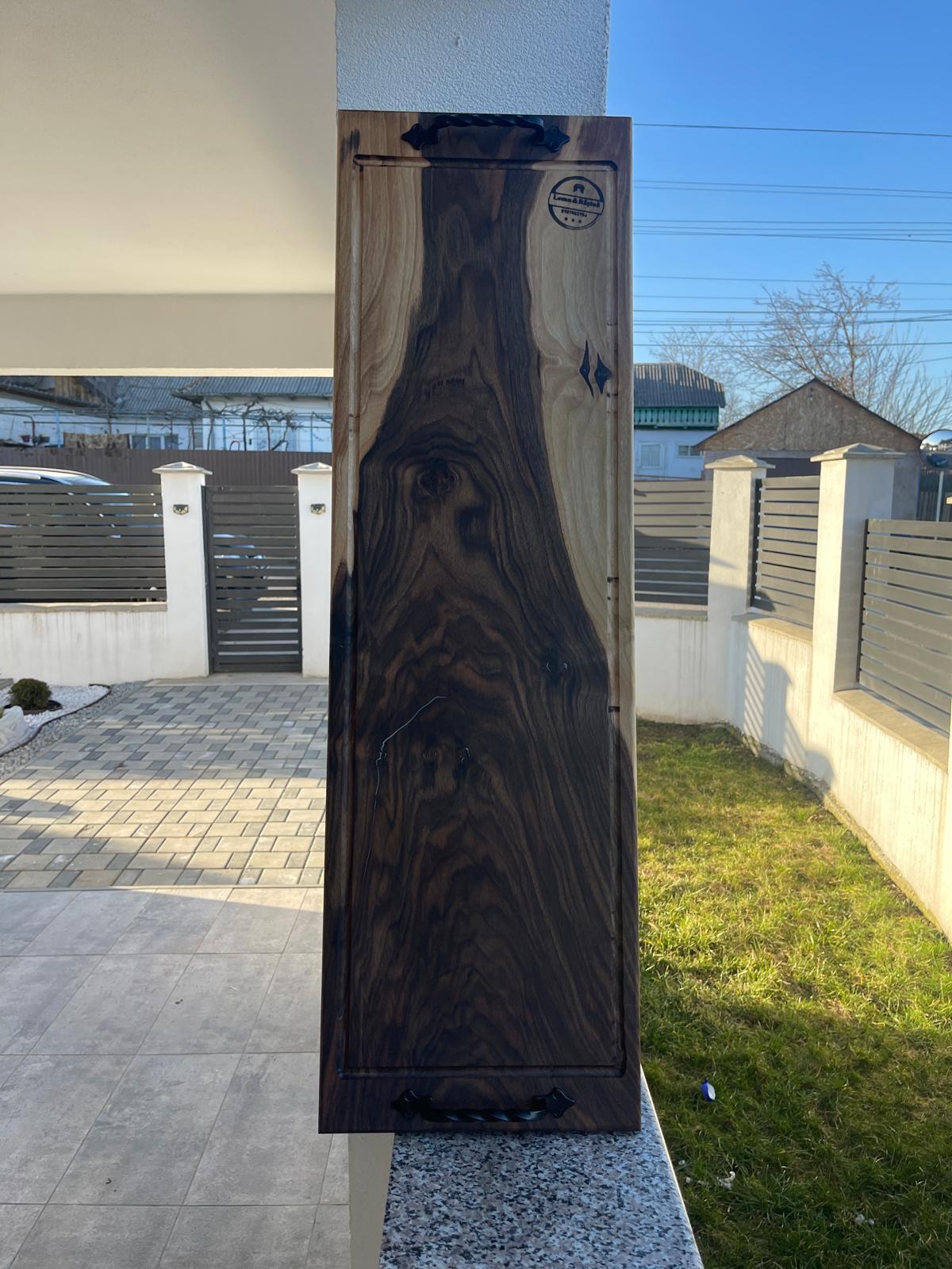 Acest platou premium este realizat manual din lemn masiv de nuc și impresionează prin formatul său generos, aspectul elegant și detaliile atent lucrate.