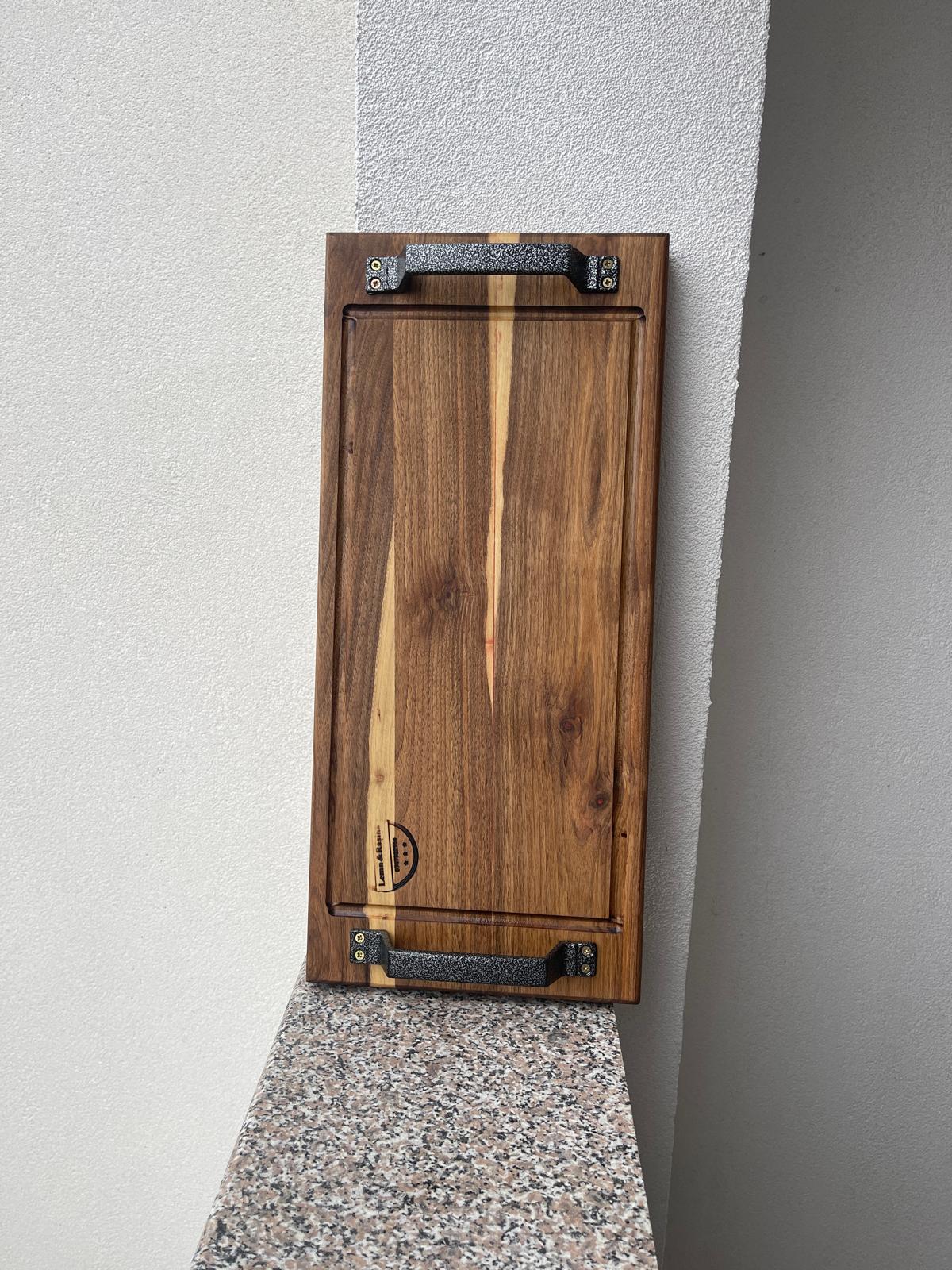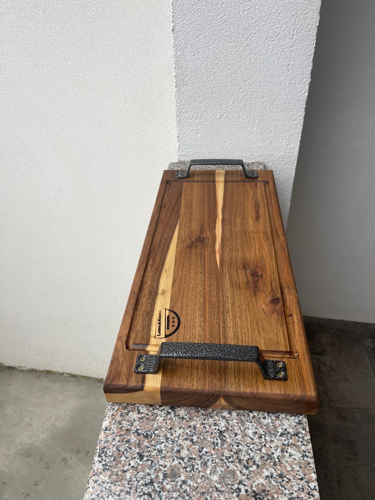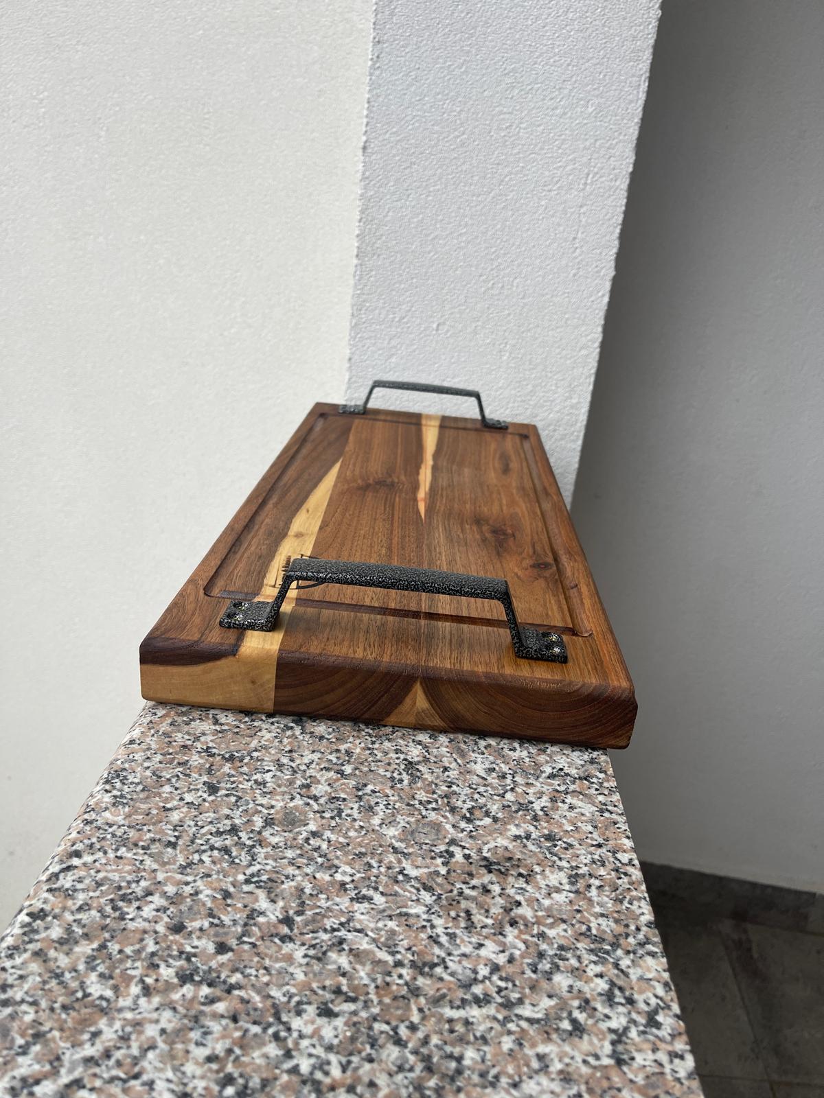 Acest platou din lemn masiv de nuc îmbină eleganța naturală a lemnului cu robustețea elementelor metalice, rezultând un produs premium cu prezență puternică.