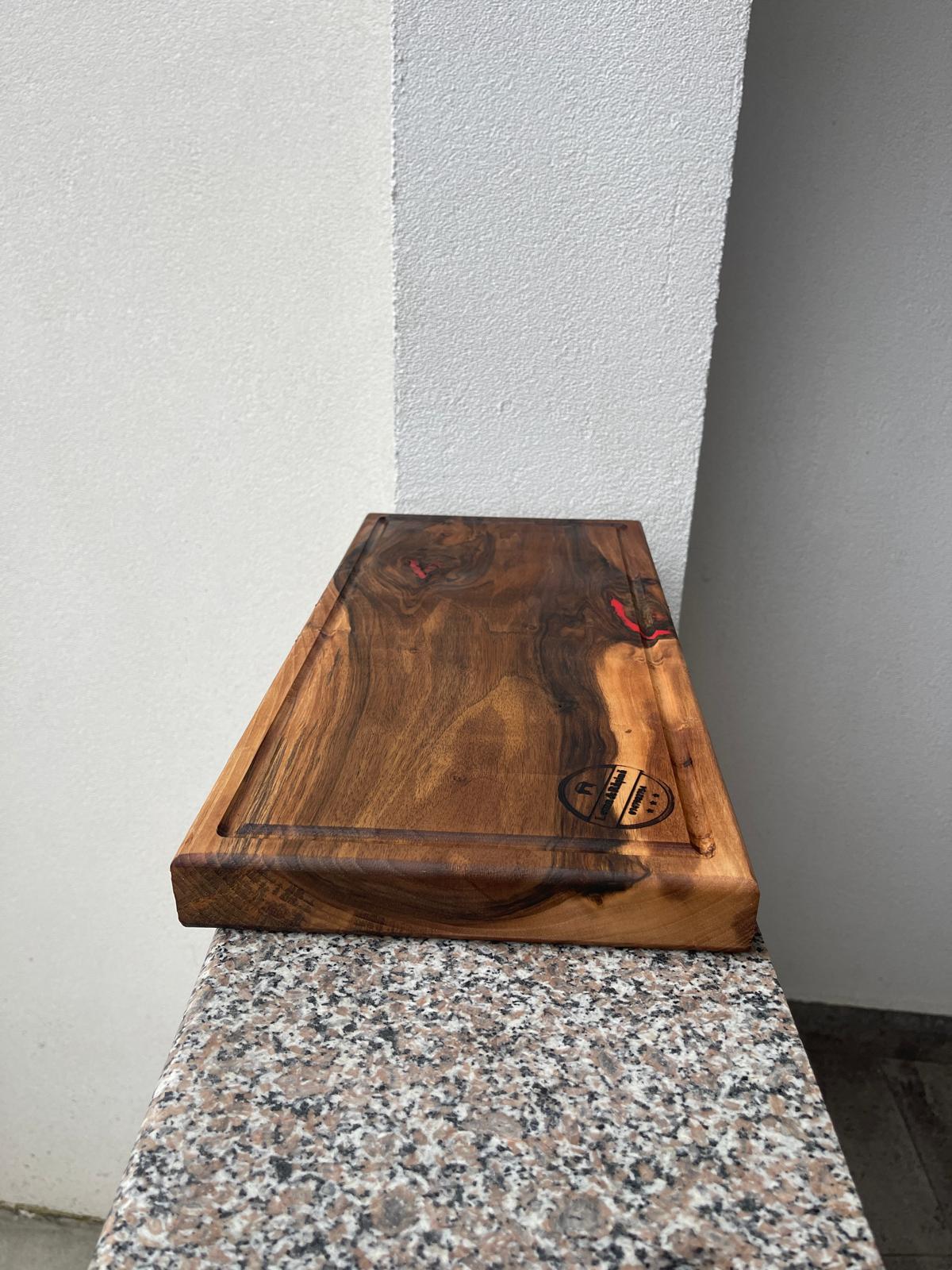 Acest platou din lemn masiv de nuc este o piesă premium, unde natura și măiestria lucrului manual se întâlnesc într-un design autentic și rafinat.