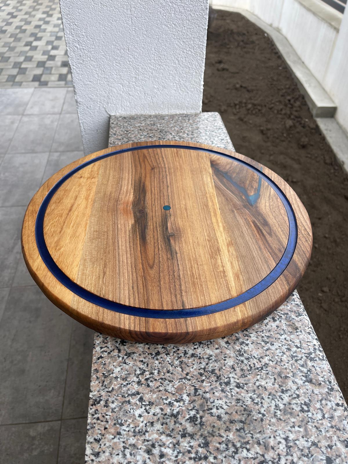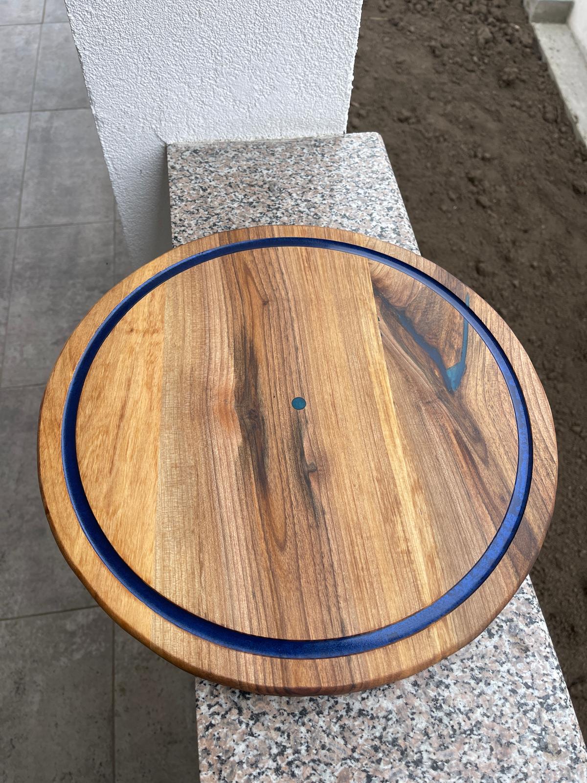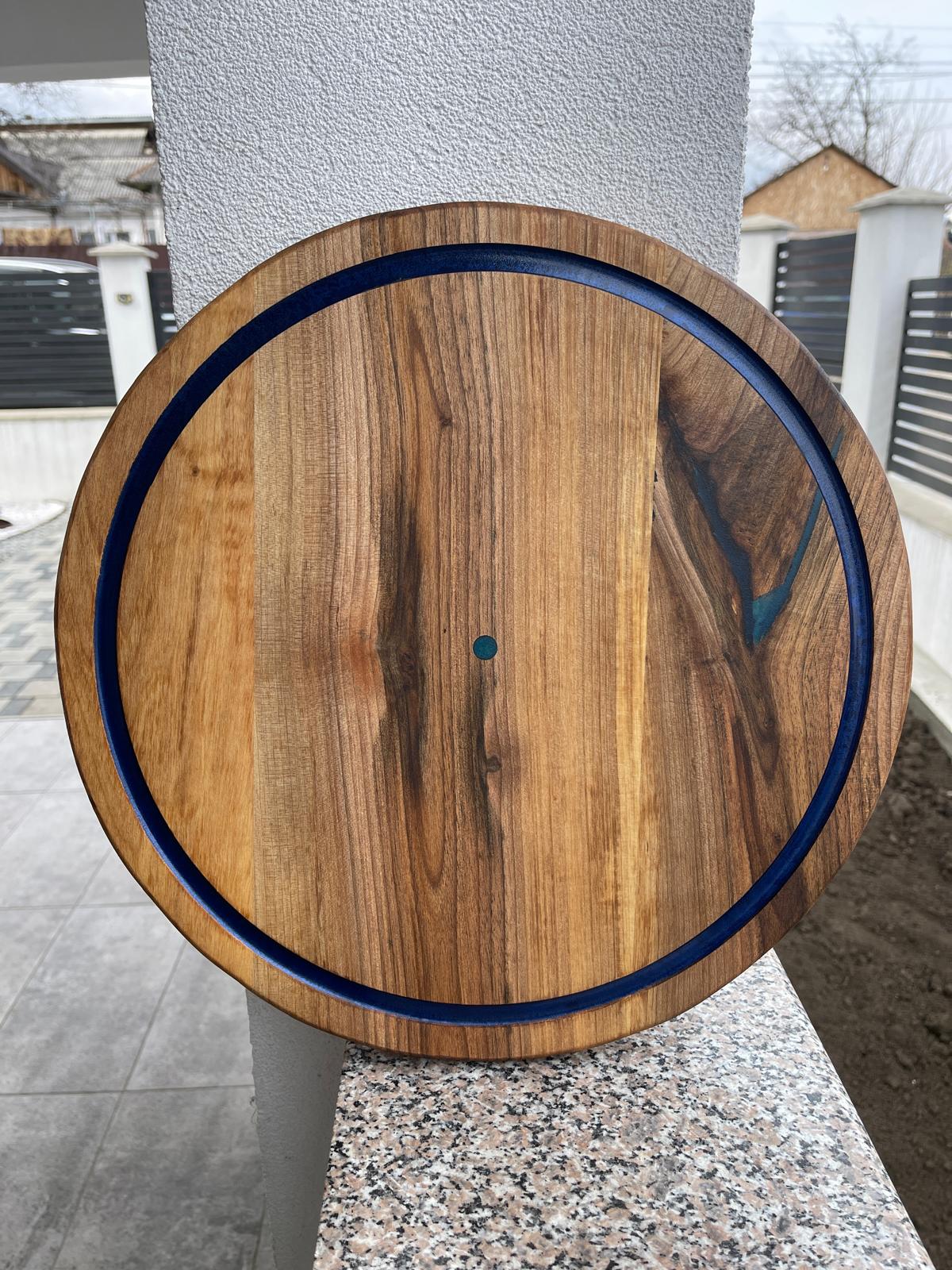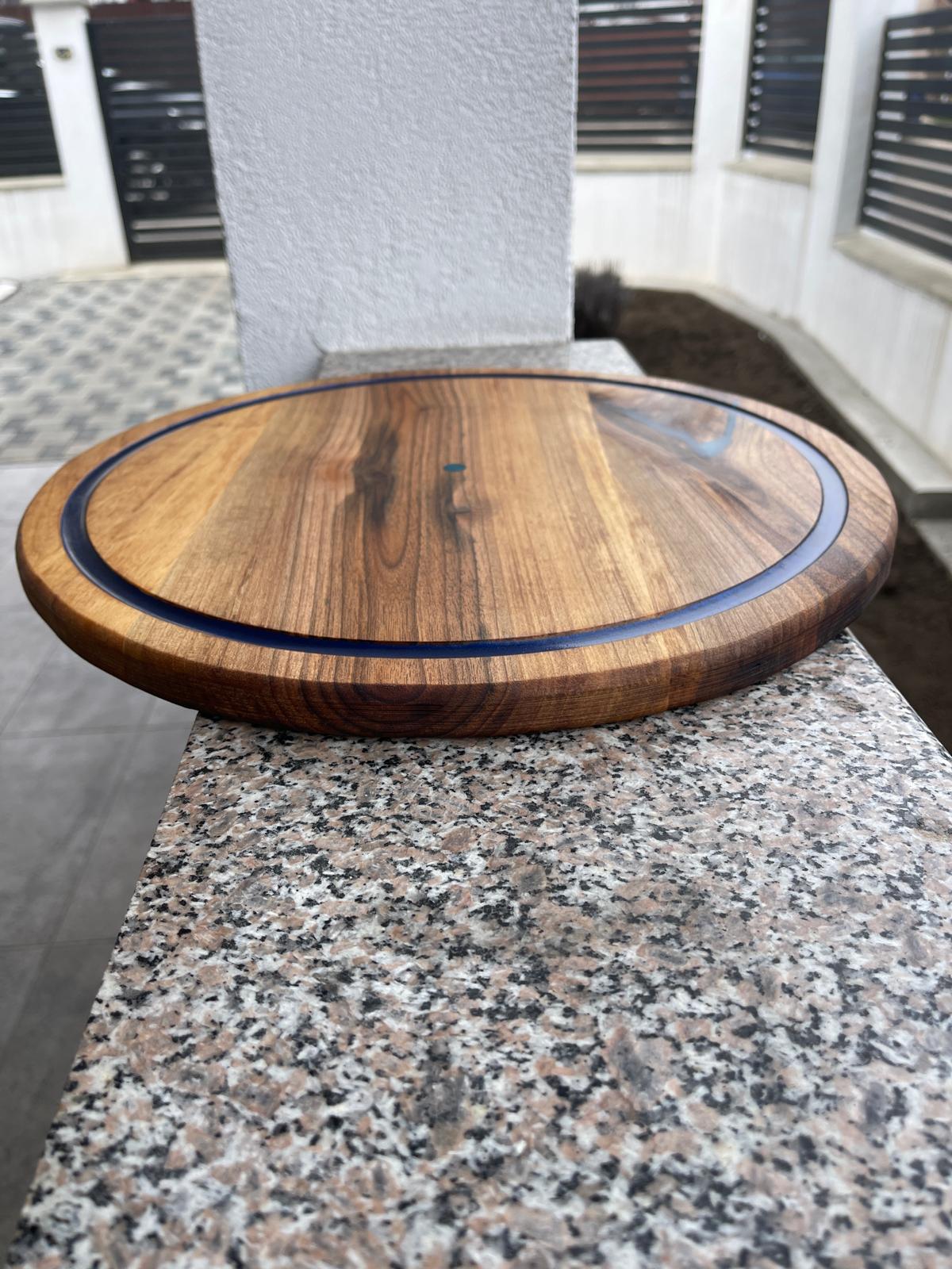Acest platou rotund din lemn masiv de nuc este realizat manual și impresionează prin designul său simplu, dar elegant, accentuat de inserția albastră care conturează perfect forma.