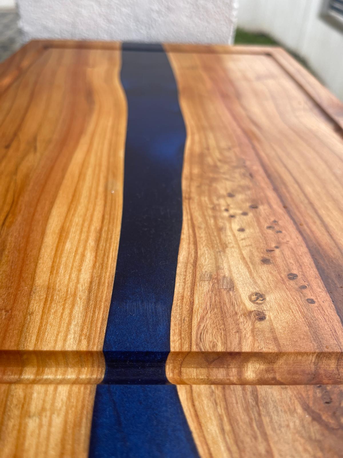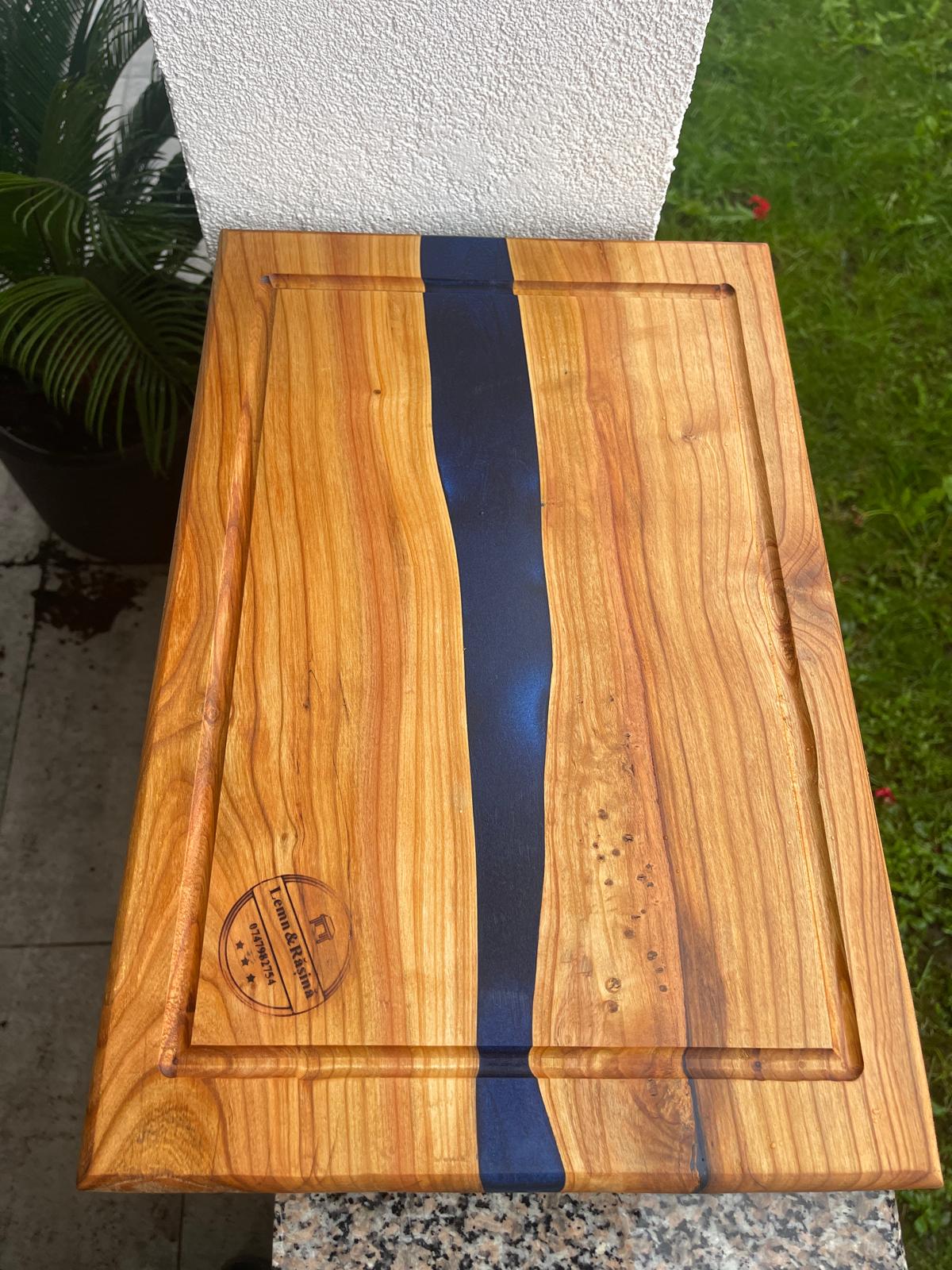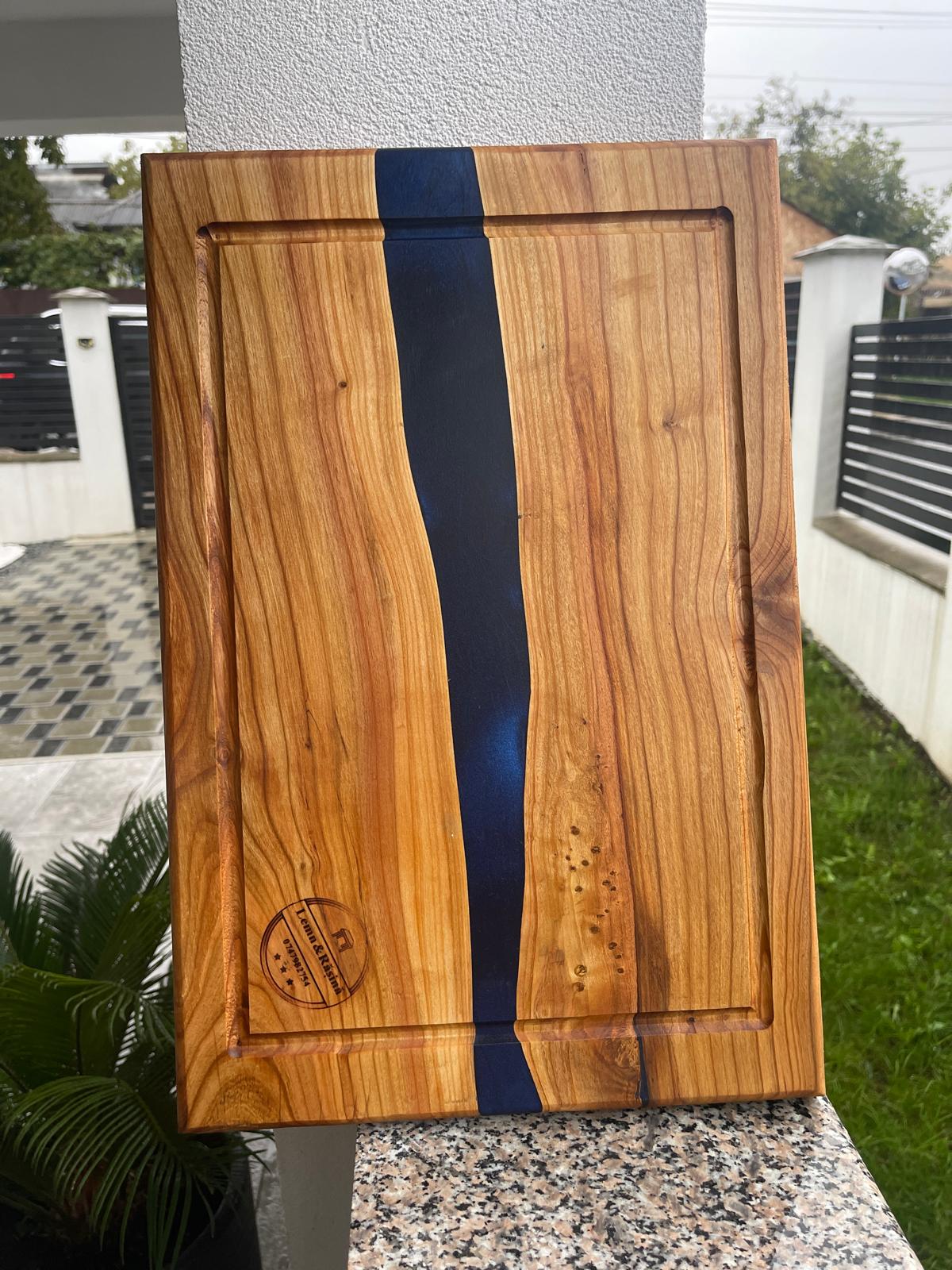 Platou de servire realizat manual din lemn masiv de cireș, cu inserții de rășină epoxidică albastră. Dimensiuni 50×35 cm, ideal pentru aperitive, fructe sau brânzeturi.