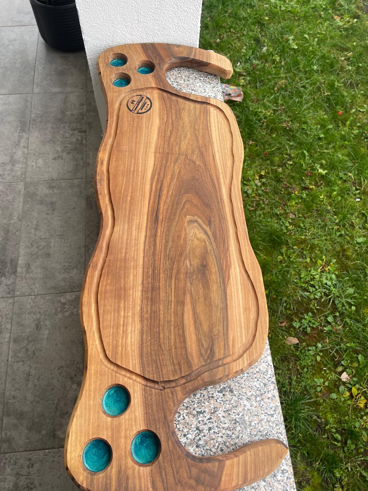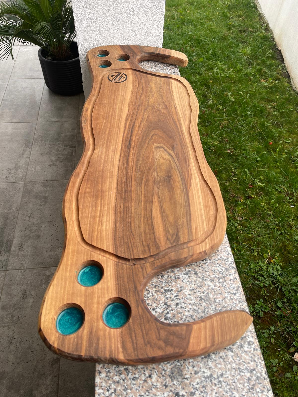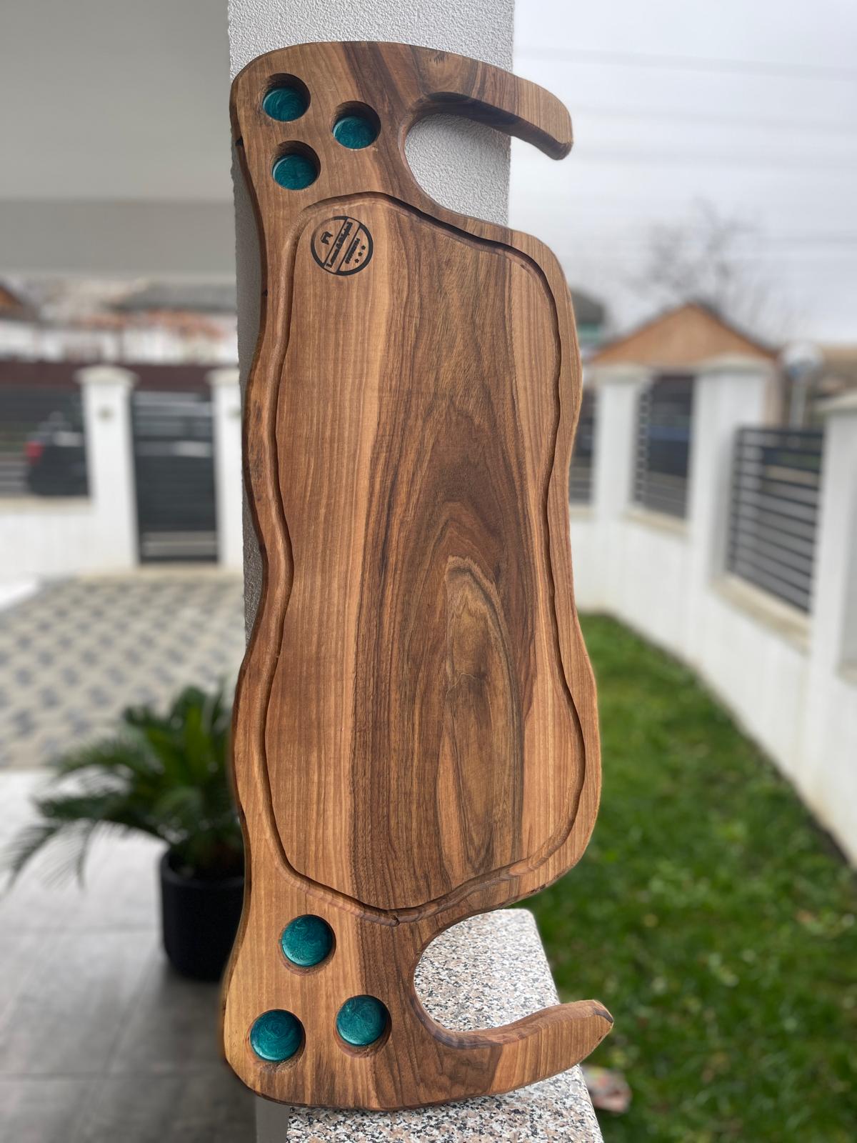 Acest platou de servire pentru shoturi combină lemnul de nuc masiv cu rășina epoxidică turcoaz, creând un efect vizual spectaculos. Cele 6 locașuri pentru shoturi sunt atent finisate pentru stabilitate și confort la servire.