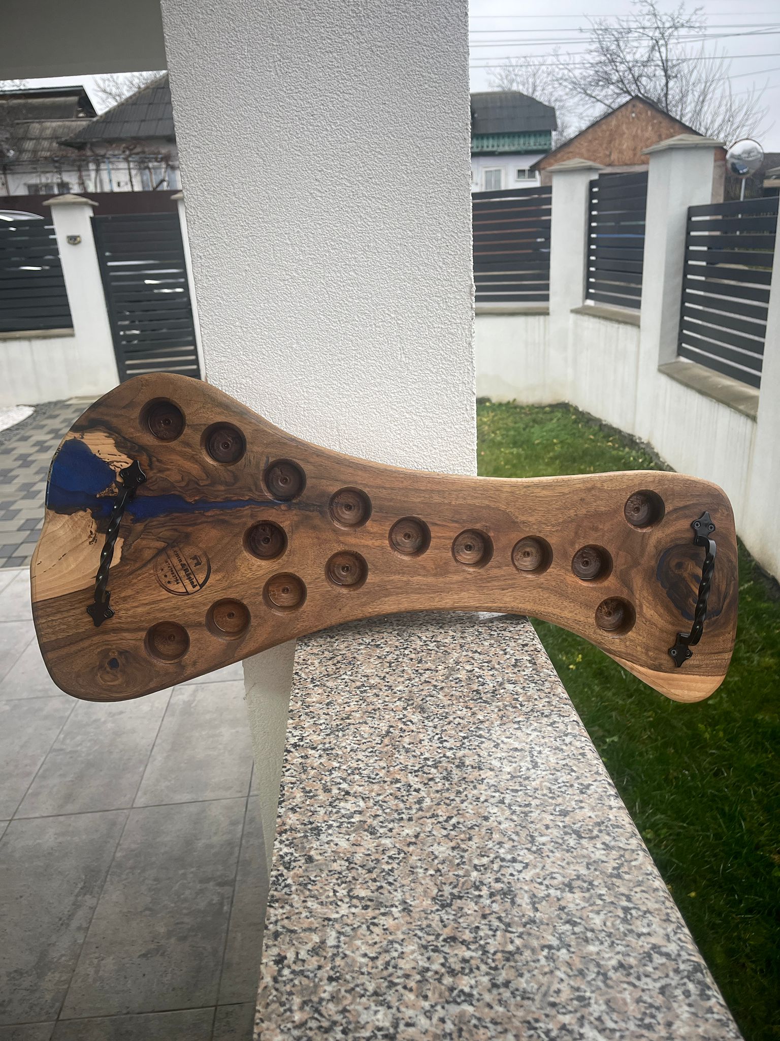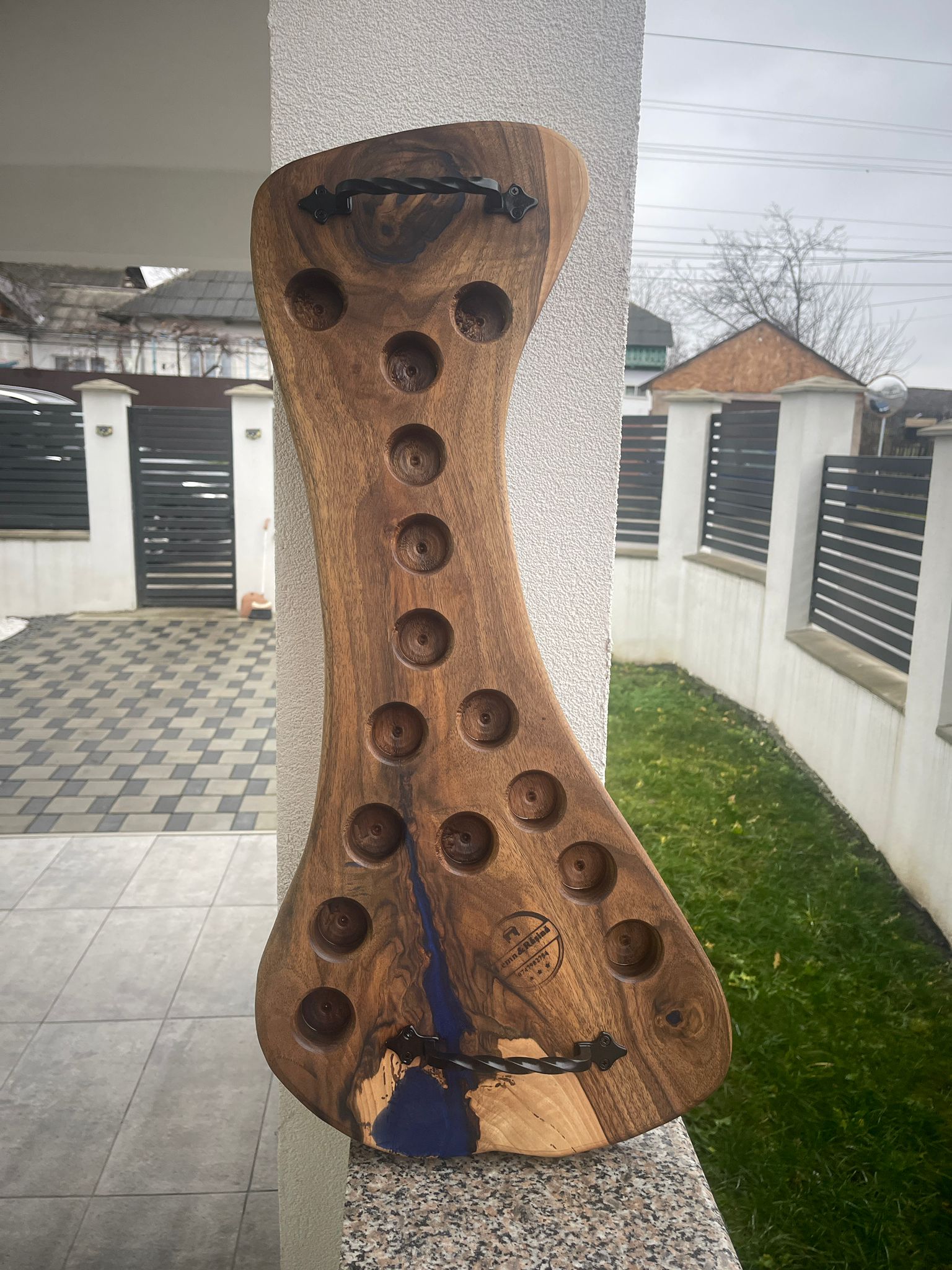 Această tavă de șhout este o piesă unică, combinând frumusețea naturală a lemnului de nuc cu inserții de rășină colorată, oferind un design modern și artistic. Mânerele din fier forjat îi conferă rezistență și un aspect rustic elegant, transformând tava într-un accesoriu funcțional și decorativ.