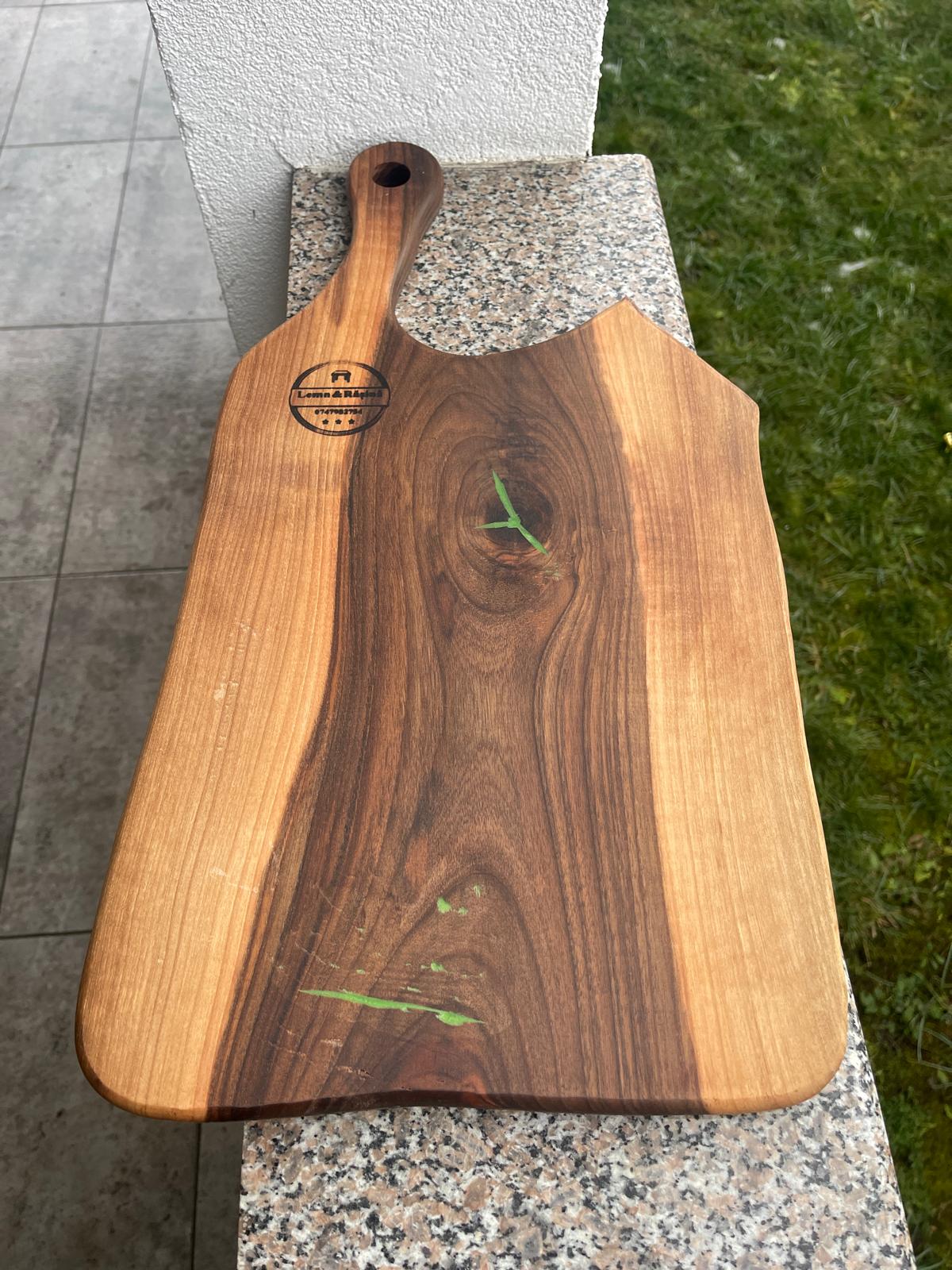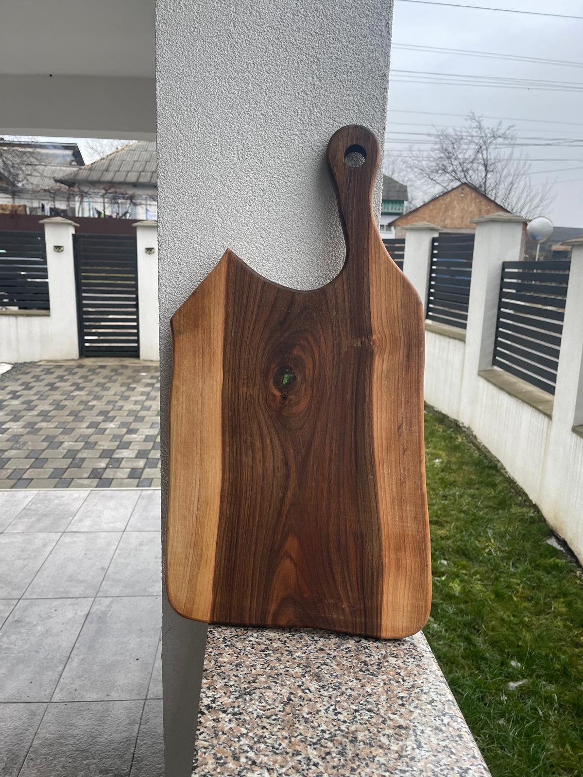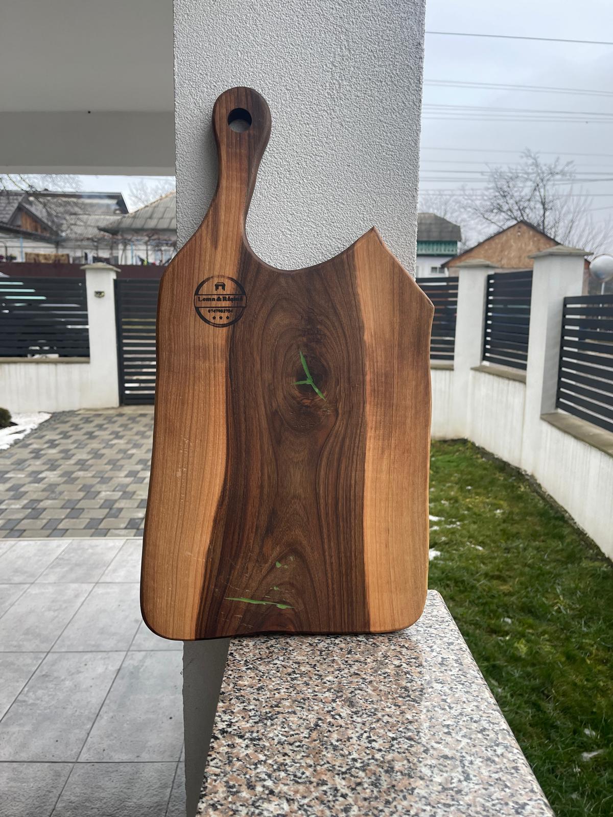 Tocator din lemn de nuc cu dimensiunea 55×38 cm, realizat manual, ce imbina frumusetea naturala a lemnului masiv cu detalii artistice prin insertiile de rasina verde. Lemnul de nuc este cunoscut pentru durabilitatea si aspectul sau elegant, iar insertiile de rasina adauga un contrast modern si un plus de personalitate.