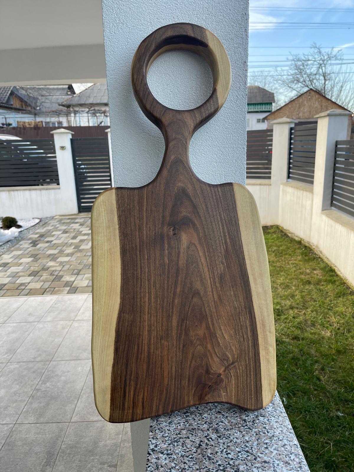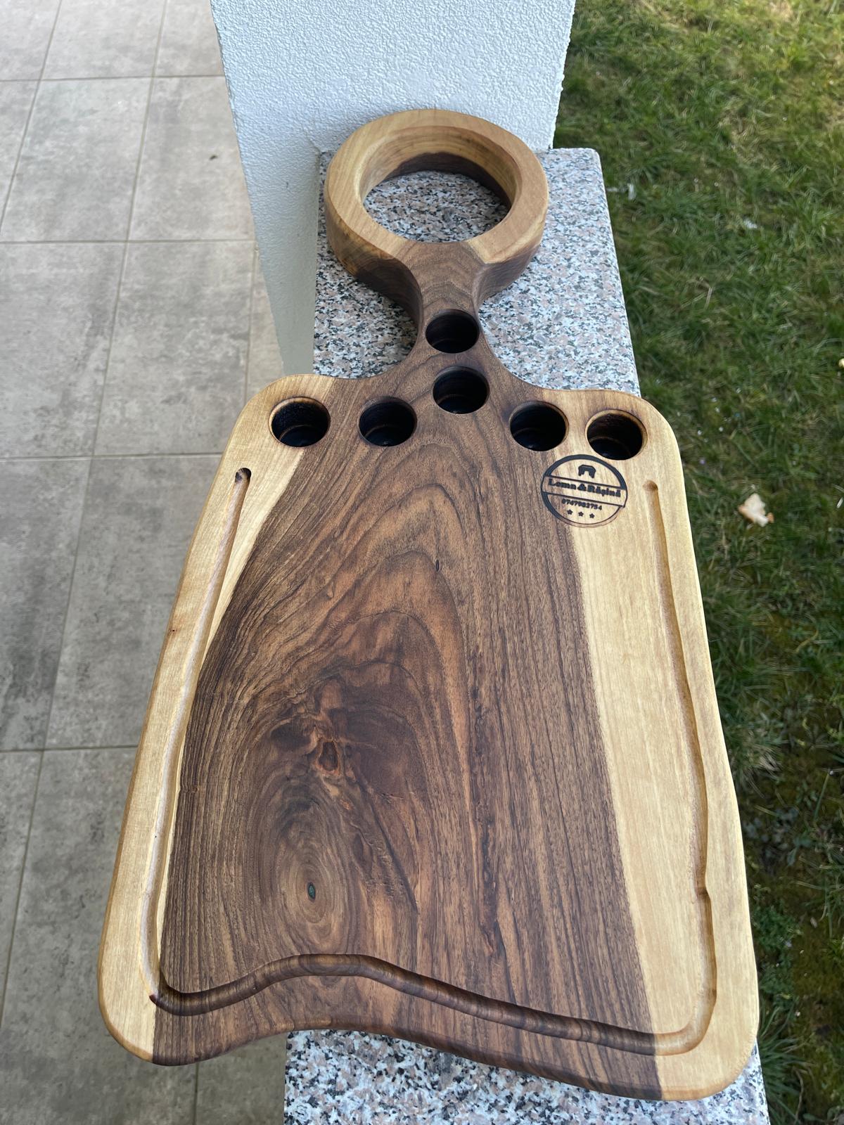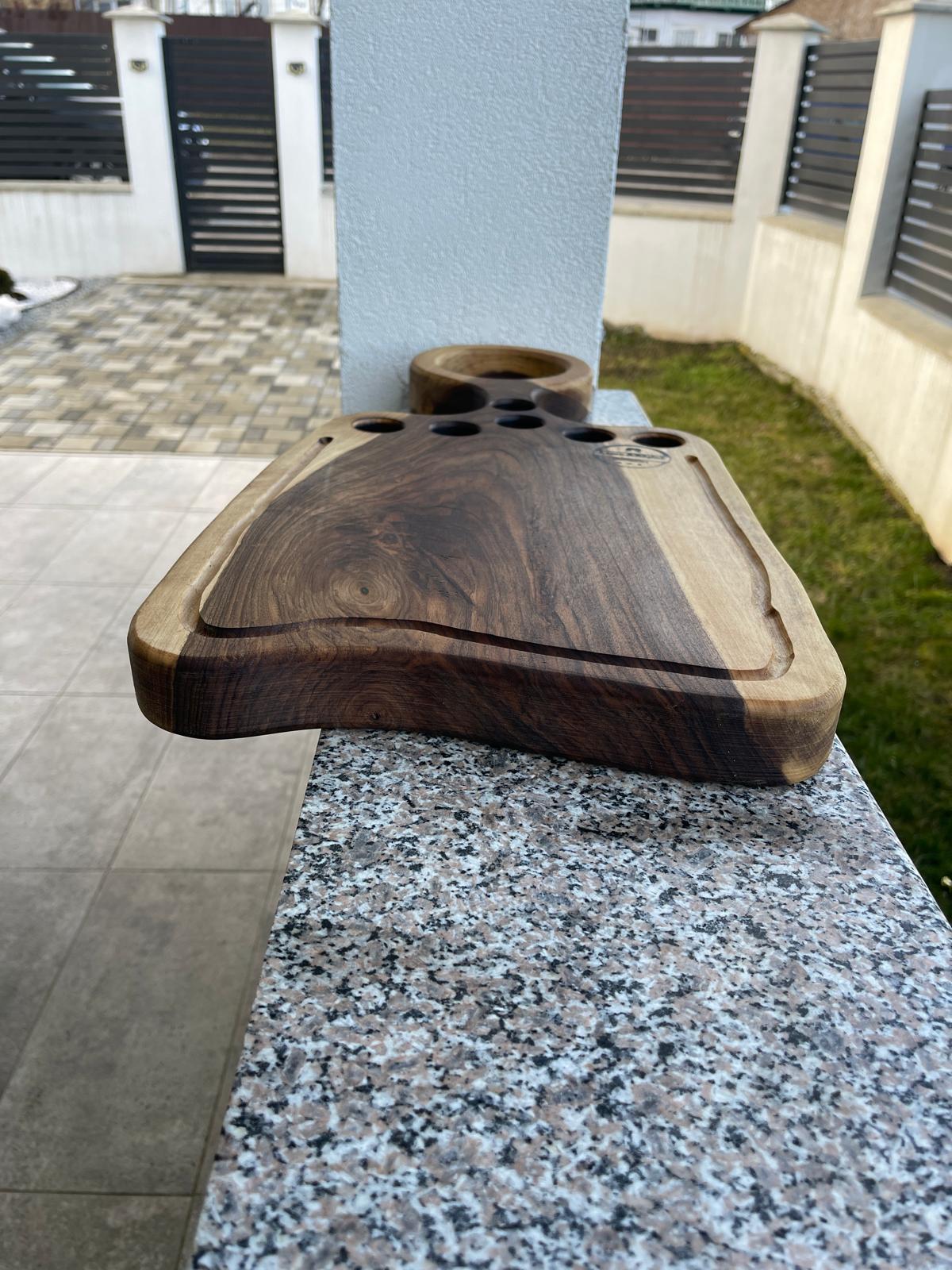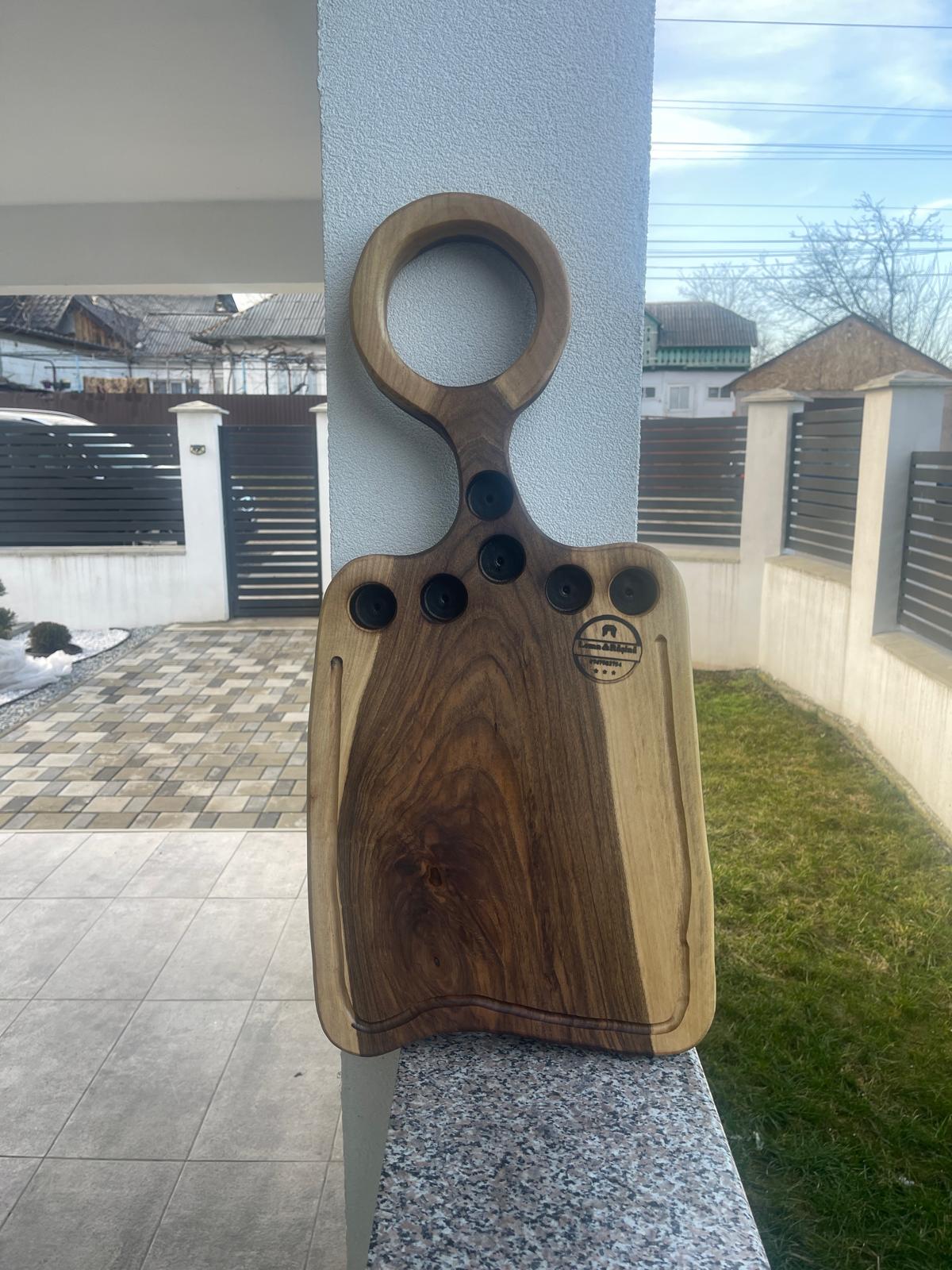 Tocător artizanal realizat din lemn masiv de nuc, cu design special ce include 6 găuri pentru pahare de shot și canal de scurgere pentru lichide. Dimensiune generoasă de 65x32x4 cm, cu grosime de 4 cm ce oferă stabilitate și prezență solidă.