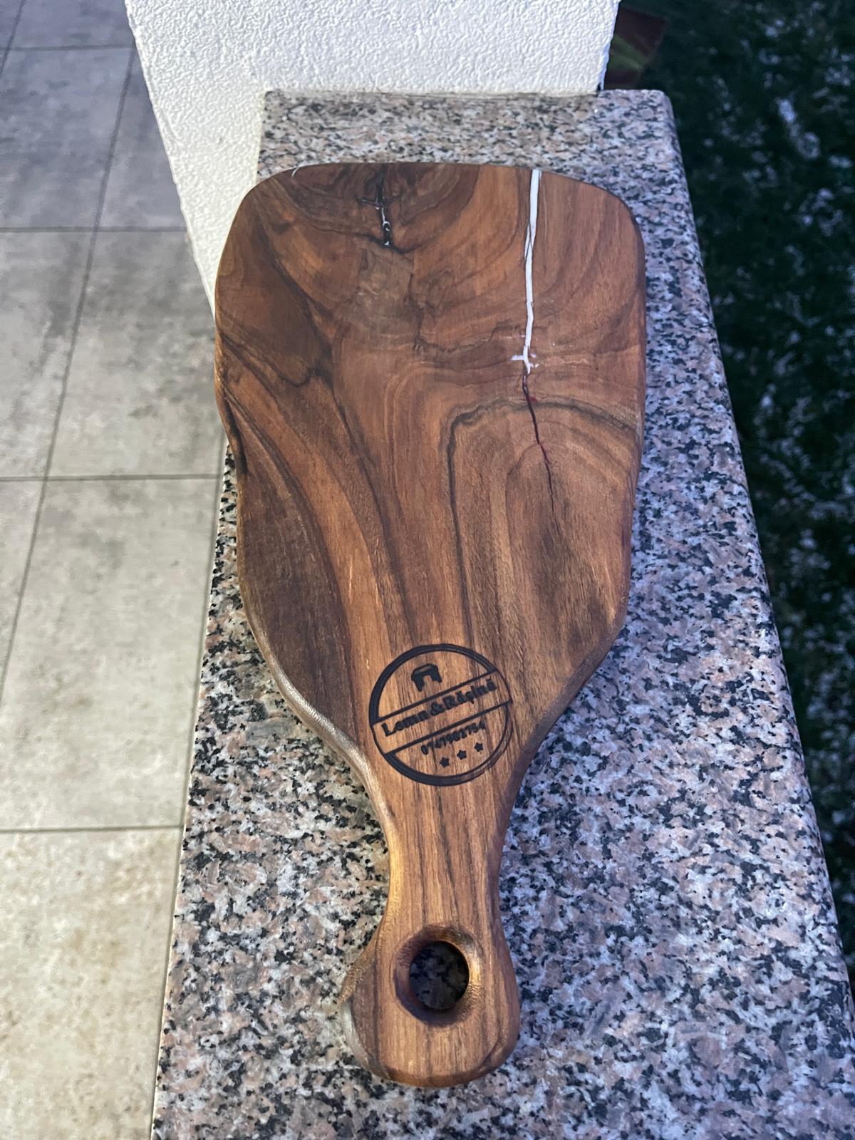 Cu dimensiuni de 40×20 cm, tocătorul este potrivit atât pentru tăierea alimentelor, cât și pentru servirea aperitivelor, brânzeturilor sau gustărilor. Inserțiile de rășină adaugă un contrast de culoare atrăgător și un aspect premium.