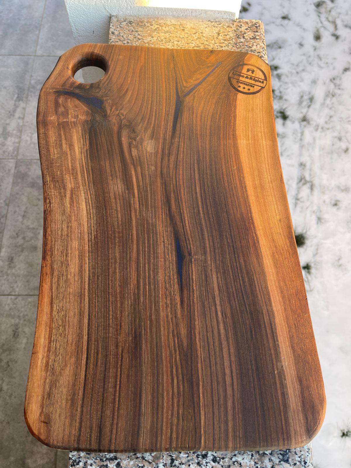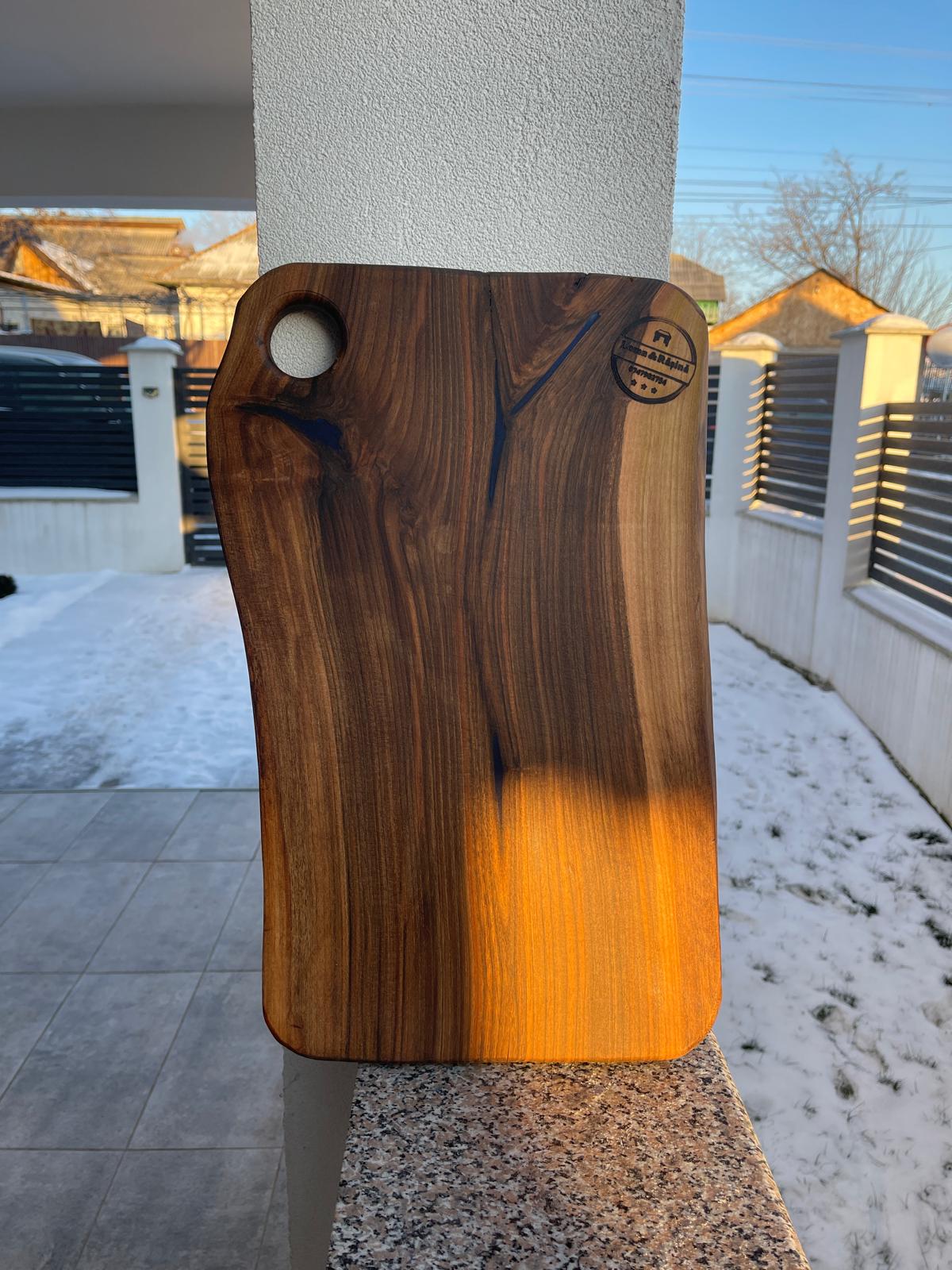Inserțiile din rășină epoxidică albastră creează un contrast vizual deosebit, transformând tocătorul într-un element decorativ modern, dar și funcțional. Combinația dintre lemnul natural și rășina colorată oferă un design echilibrat, potrivit pentru bucătării contemporane sau rustice.