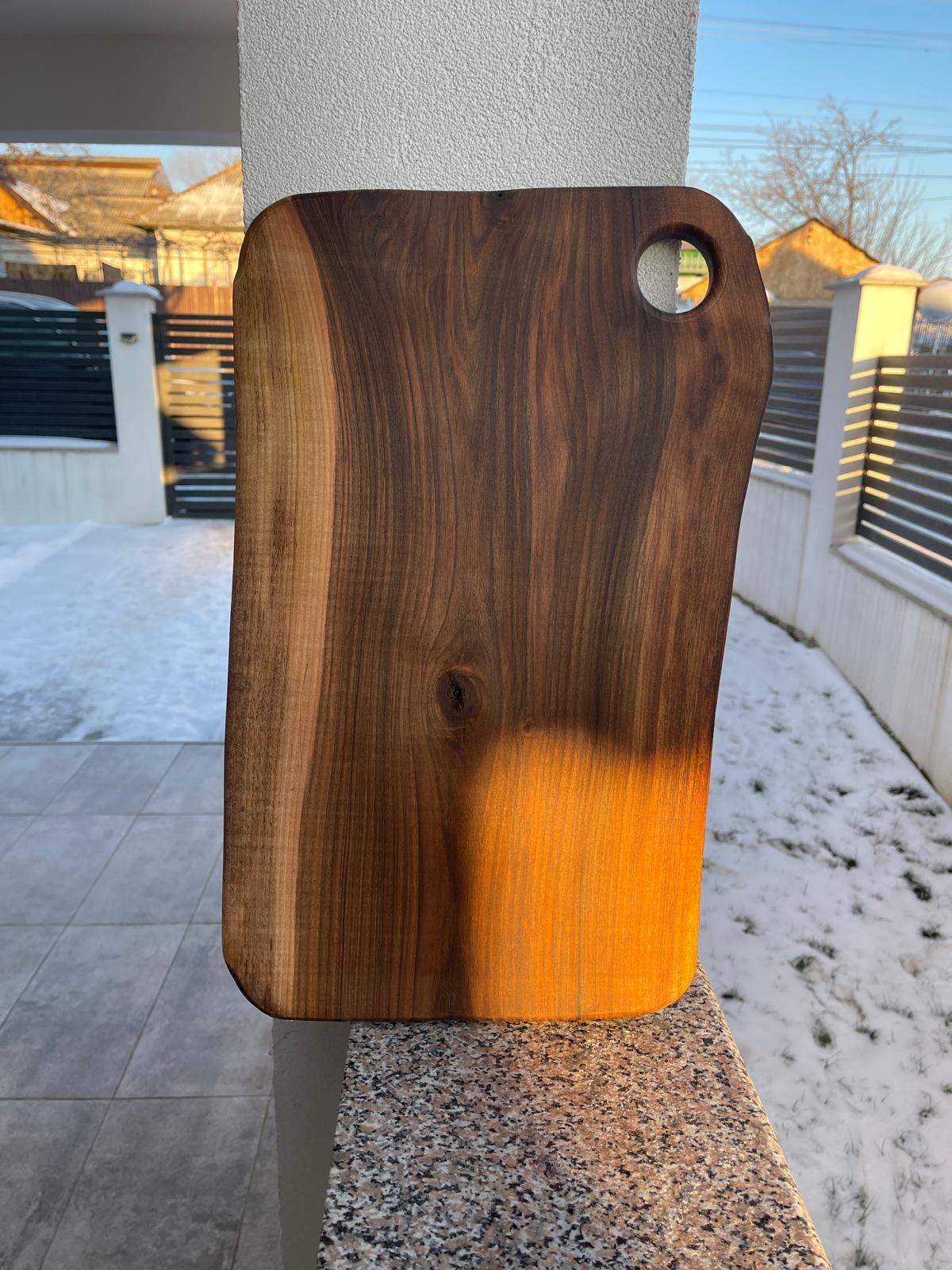 Acest tocător din lemn de nuc este realizat manual din lemn masiv atent selecționat, fiecare piesă fiind unică datorită desenului natural al fibrei. Finisajul cu ulei safe food protejează suprafața și îl face sigur pentru contactul direct cu alimentele, păstrând în același timp aspectul natural al lemnului.
