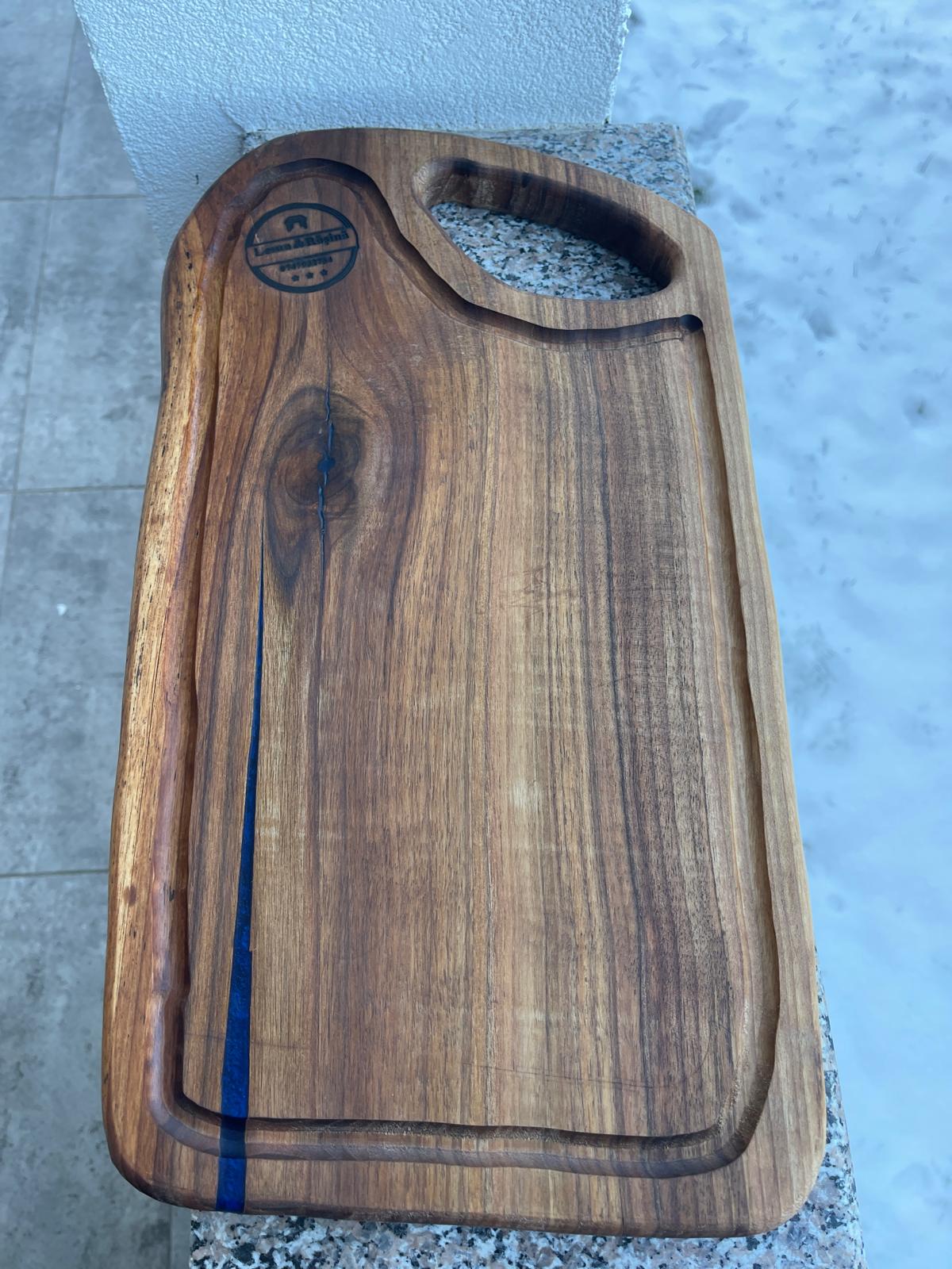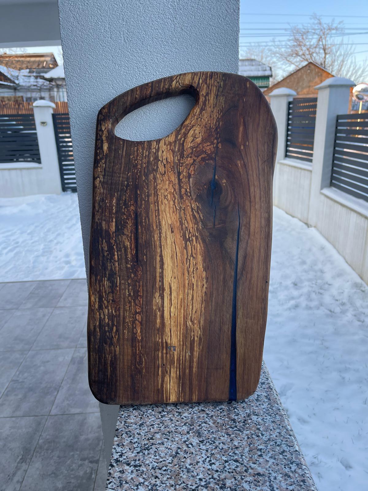 Acest tocător din lemn de nuc cu rășină epoxidică îmbină frumusețea naturală a lemnului masiv cu un design contemporan, fiind atât practic, cât și estetic. Fibra bogată a nucului oferă un aspect cald și elegant, iar rășina epoxidică completează perfect designul, transformând tocătorul într-o piesă unică.