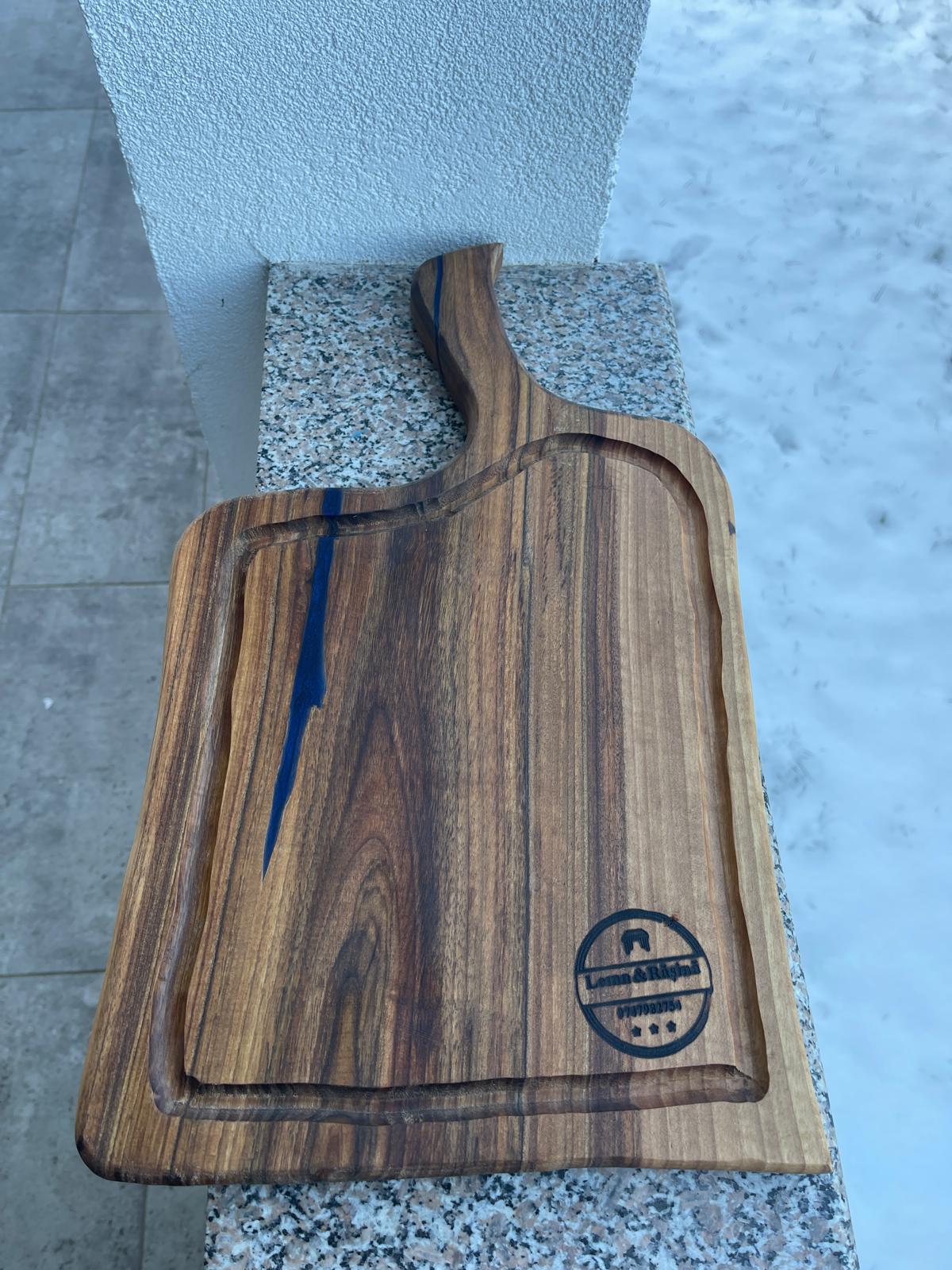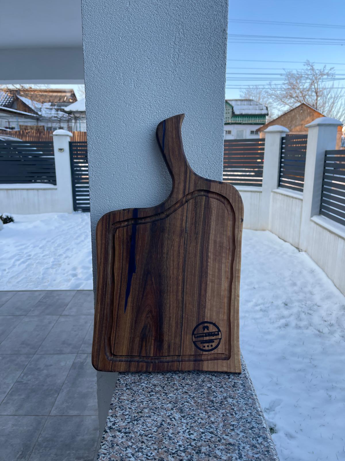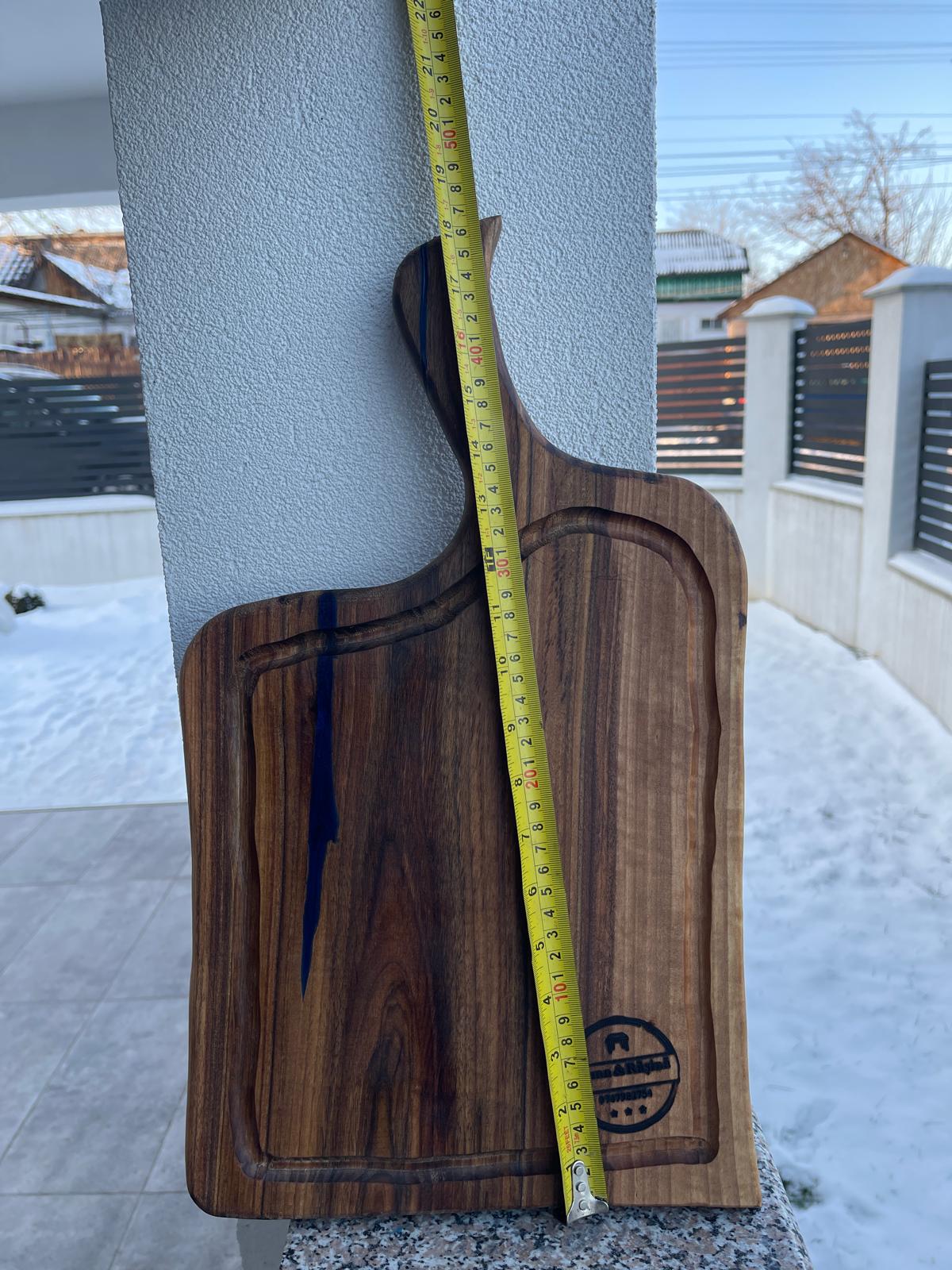 Acest tocător din lemn de nuc cu rășină epoxidică albastră este realizat pentru cei care apreciază combinația dintre naturalețe și design modern. Lemnul masiv de nuc, cu fibră bogată și nuanțe calde, este pus în valoare de albastrul intens al rășinii epoxidice, rezultând un produs cu un aspect spectaculos.