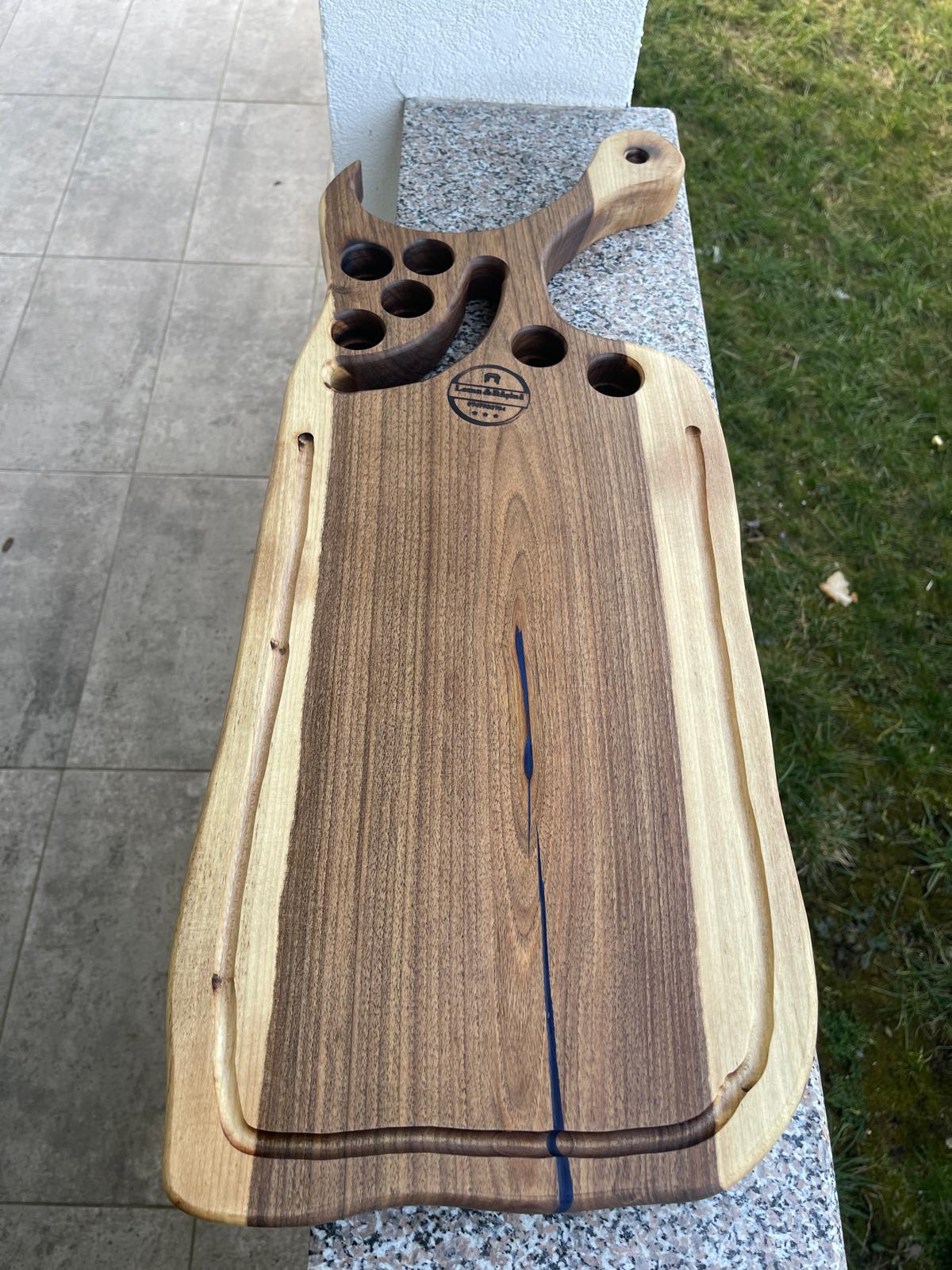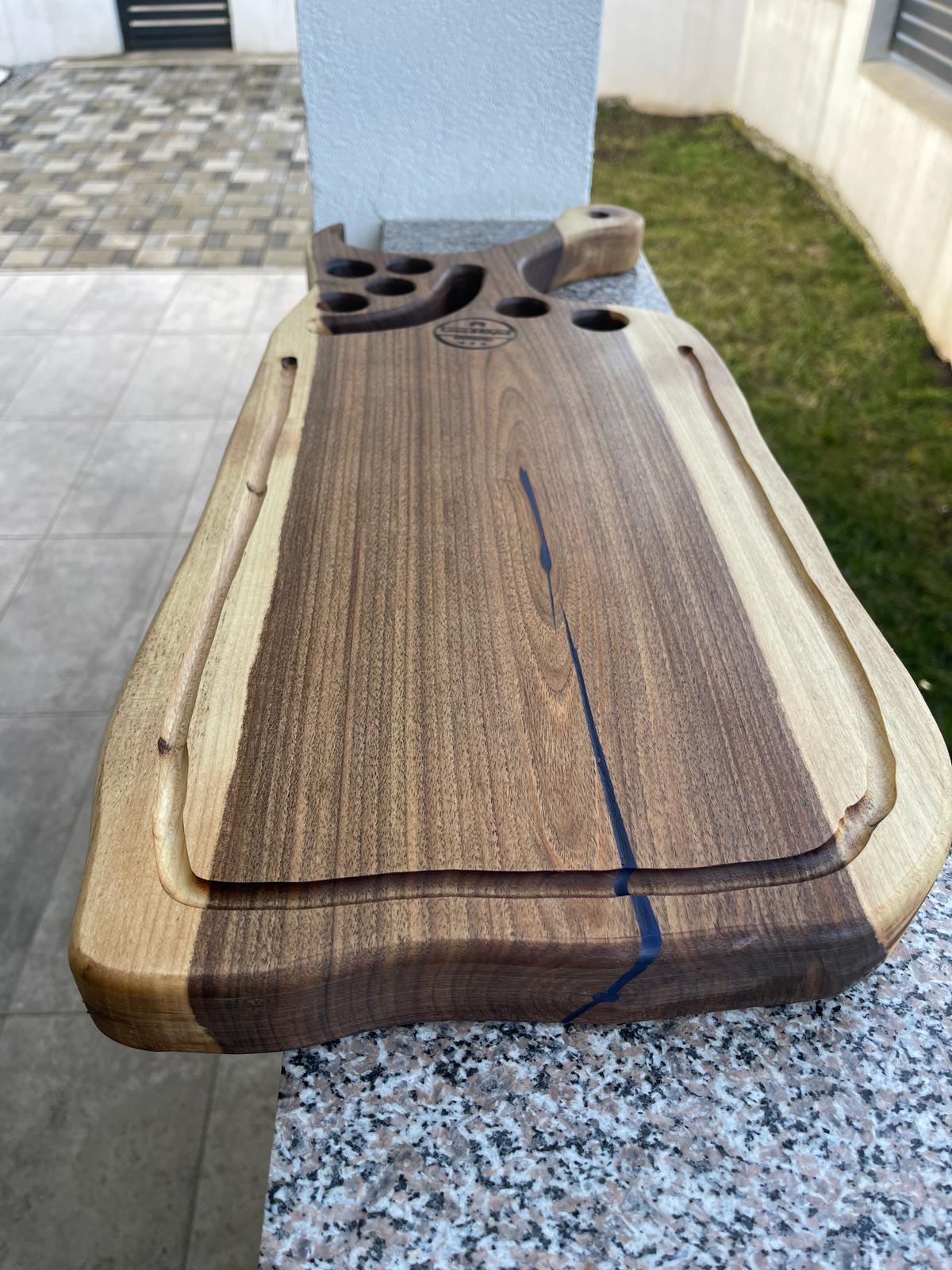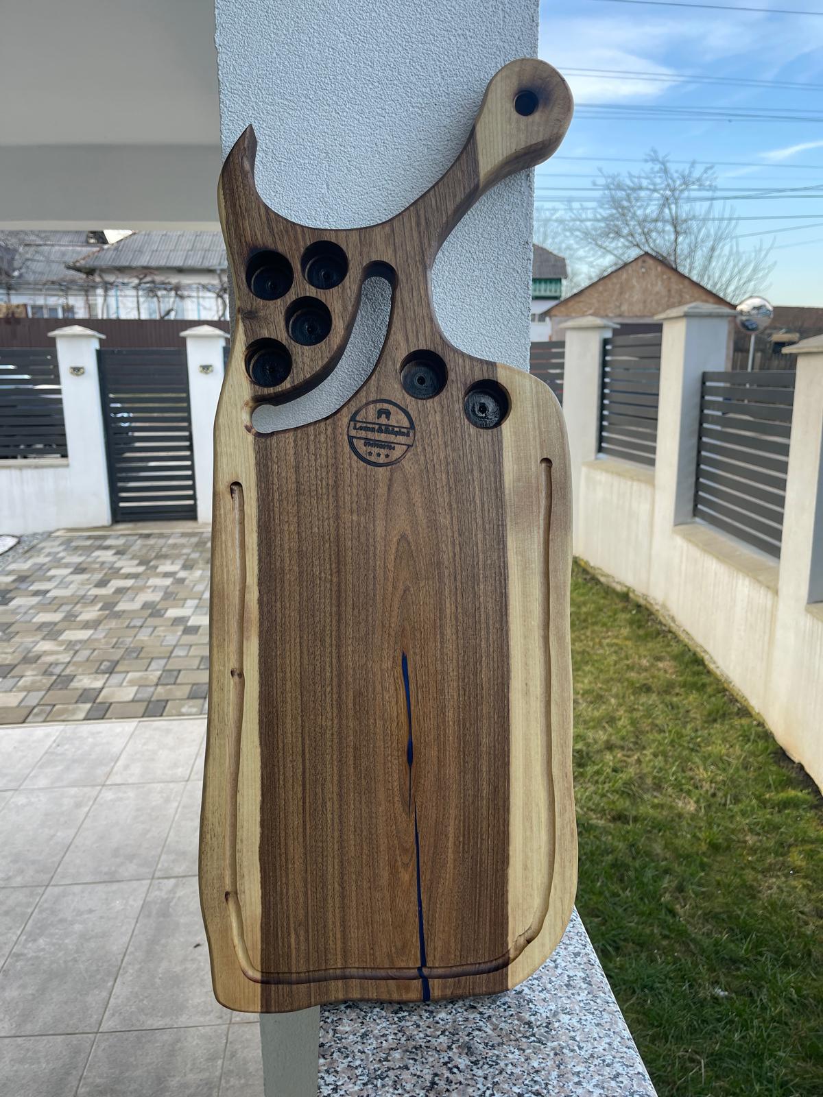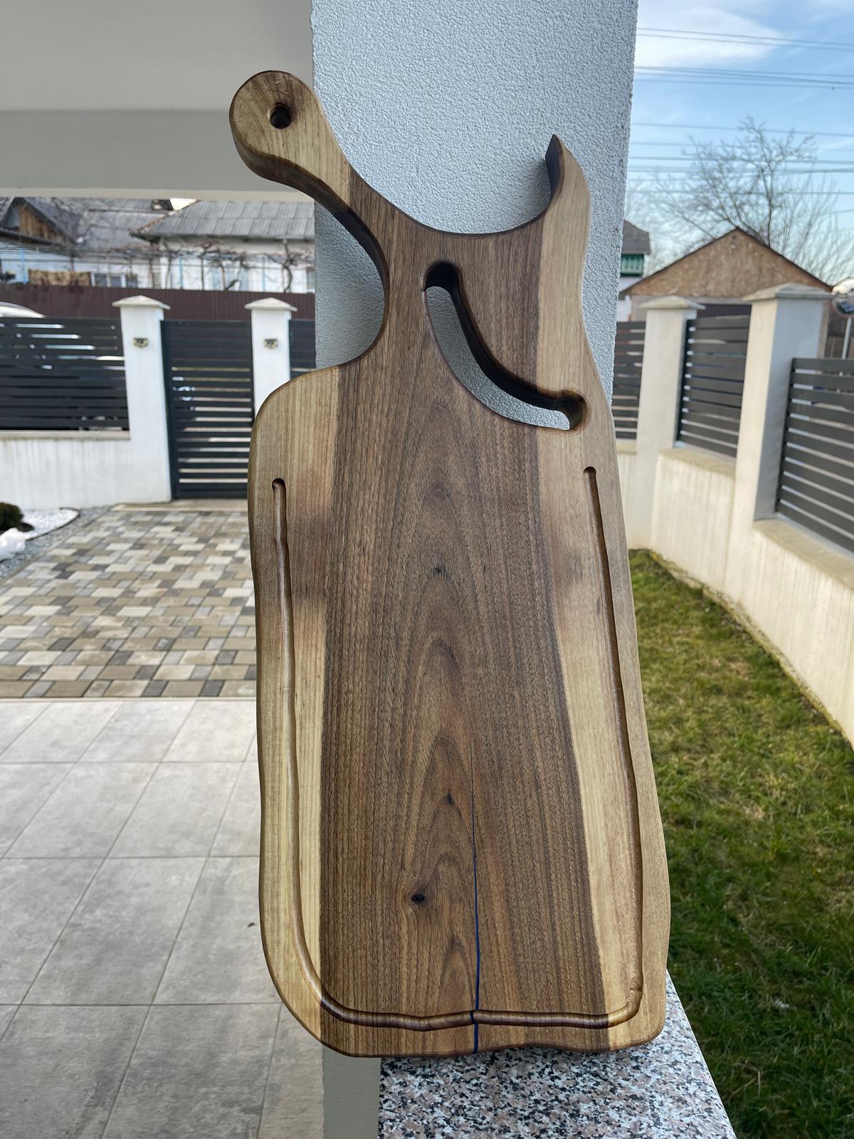 Tocător artizanal realizat din lemn masiv de nuc, completat de o inserție spectaculoasă din rășină epoxidică albastră, care creează un contrast elegant între fibra naturală a lemnului și accentele moderne ale rășinii.