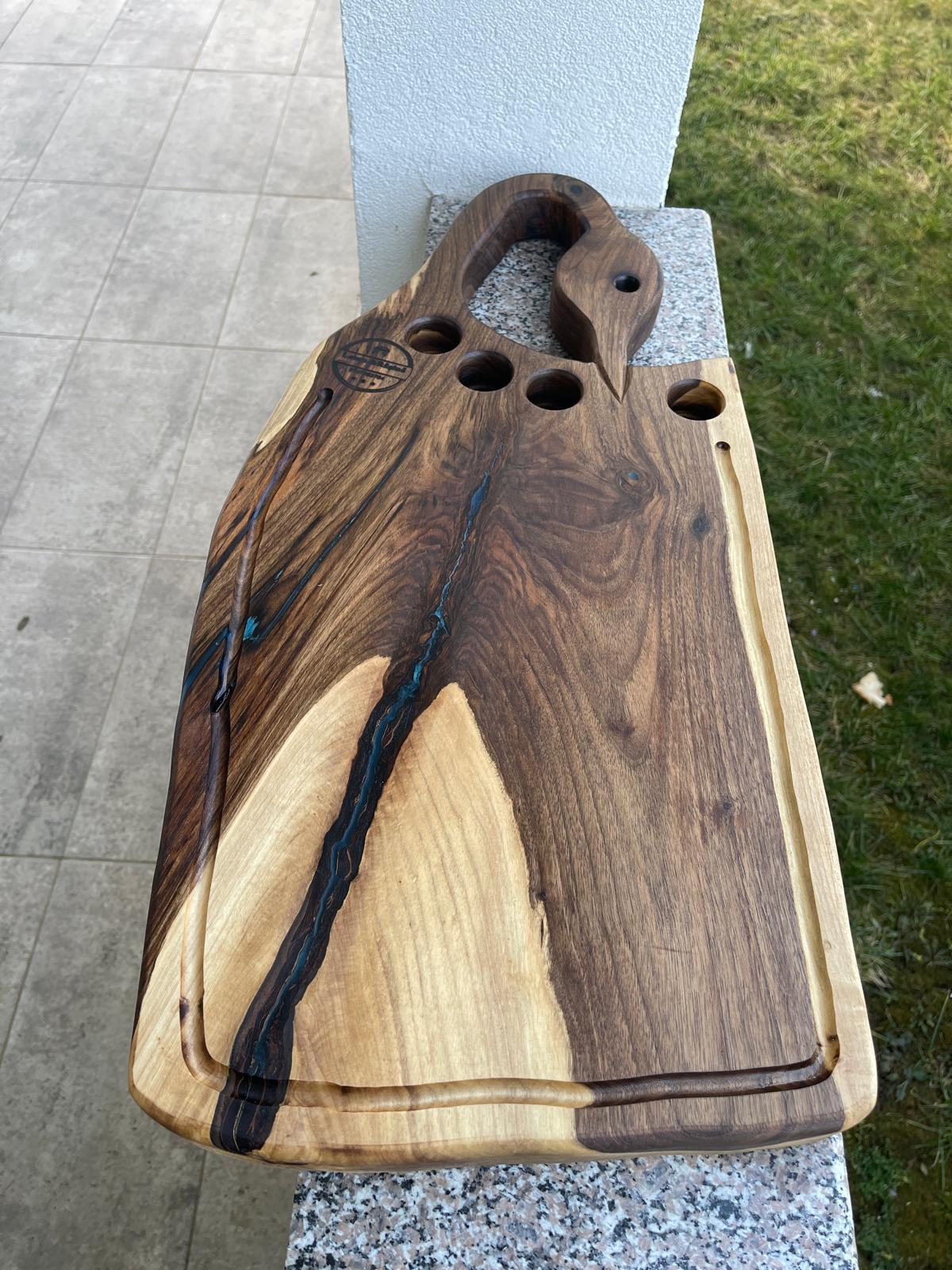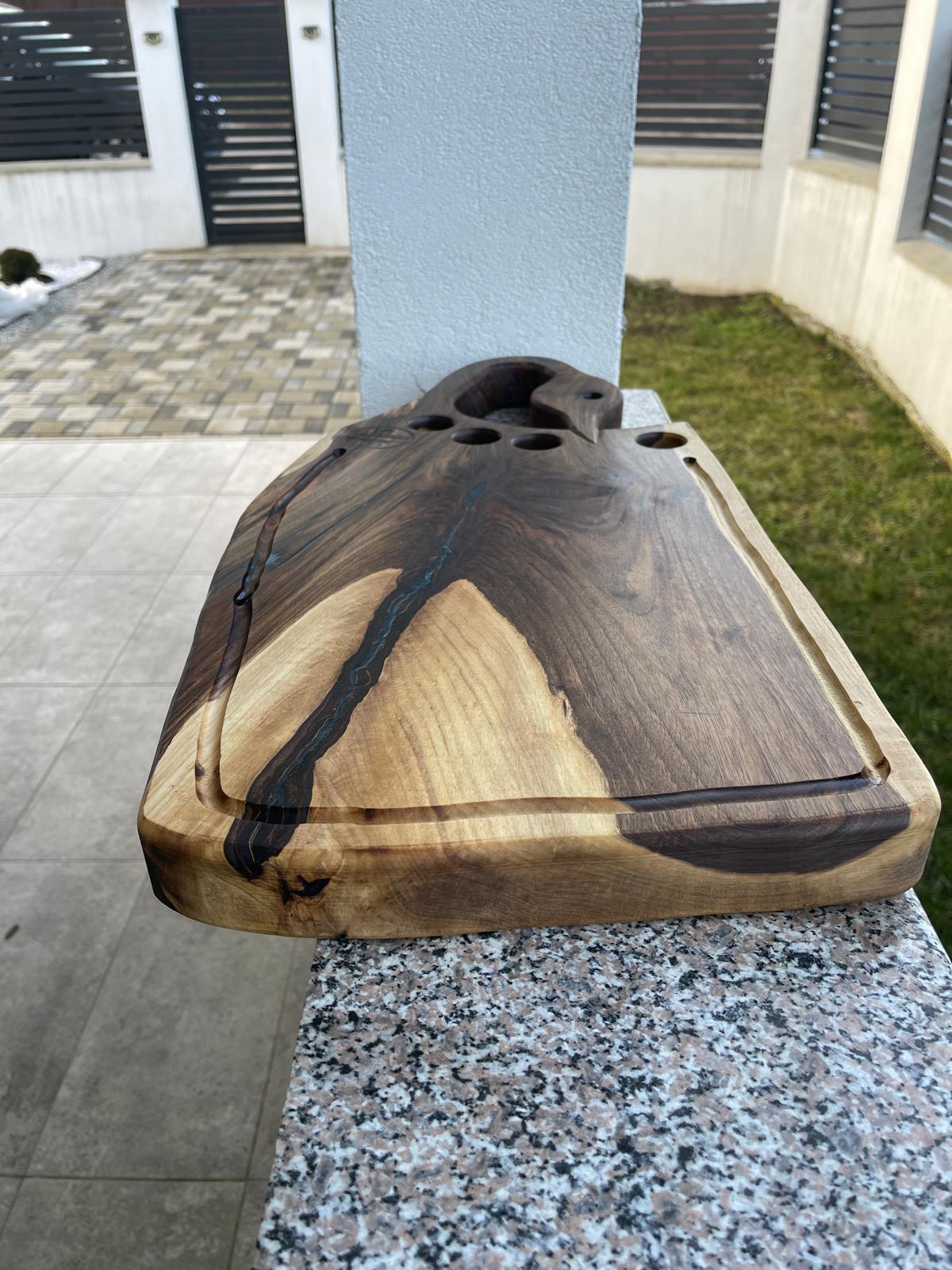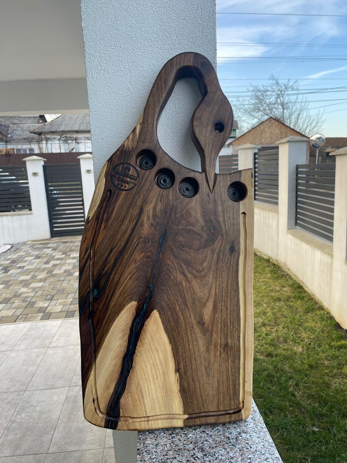 Tocător unicat din lemn masiv de nuc cu inserție de rășină epoxidică fosforescentă, 4 găuri pentru shot-uri și canal de scurgere pentru lichide. Dimensiuni 70x33x4 cm. Design spectaculos, cu efect luminos în întuneric.