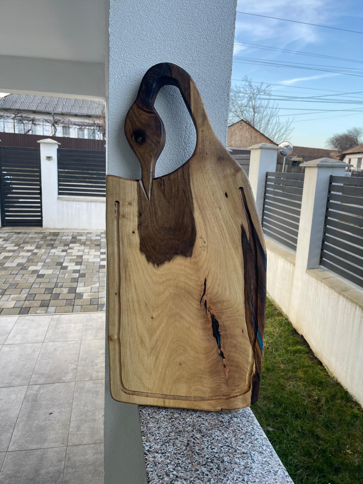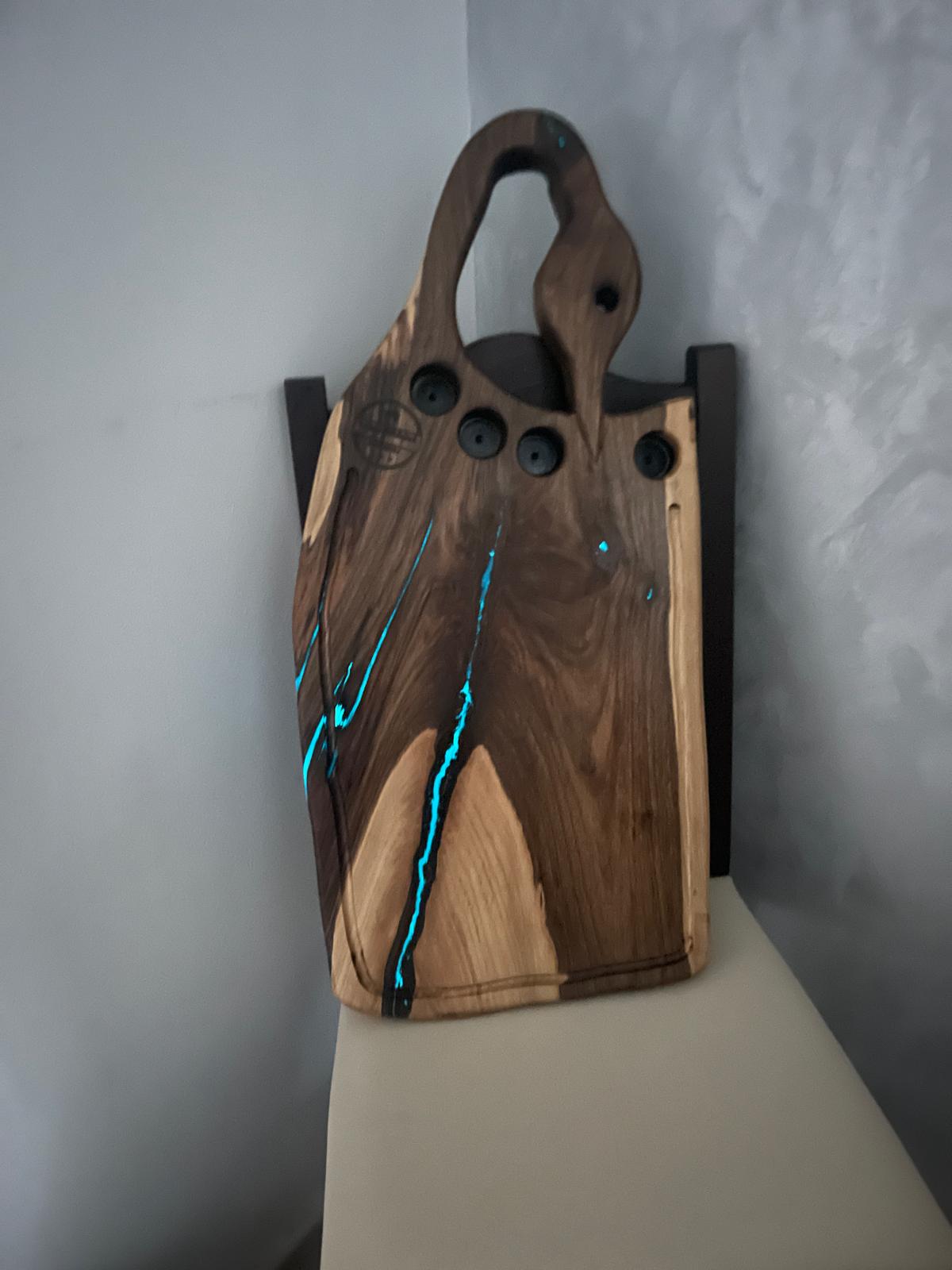 Tocător artizanal realizat din lemn masiv de nuc, evidențiat de inserții din rășină epoxidică fosforescentă ce creează un efect luminos spectaculos în condiții de lumină redusă.