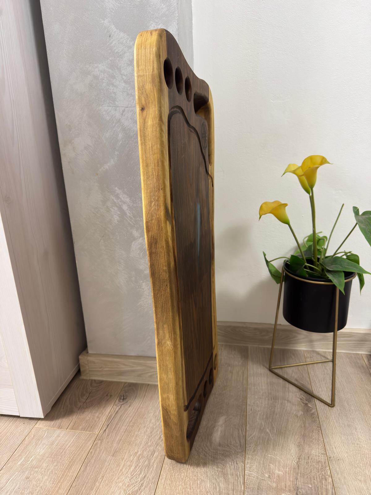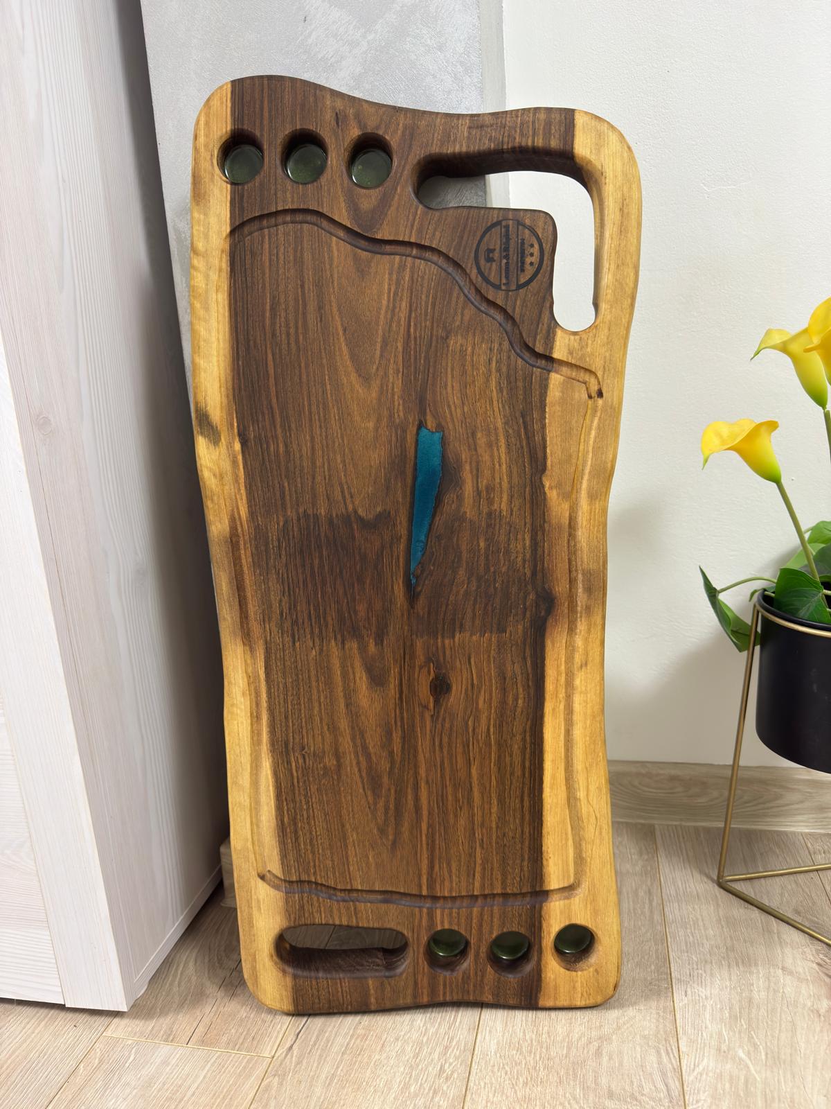 Tocător premium din lemn masiv de nuc, cu inserții din rășină epoxidică turcoaz, prevăzut cu 6 găuri pentru shoturi și canal de scurgere pentru grăsimi. Dimensiuni generoase 75x35x4 cm, ideal pentru servire festivă sau utilizare profesională. Tratată cu ulei special sigur pentru contact alimentar, iar rășina este certificată pentru contact cu alimentele.